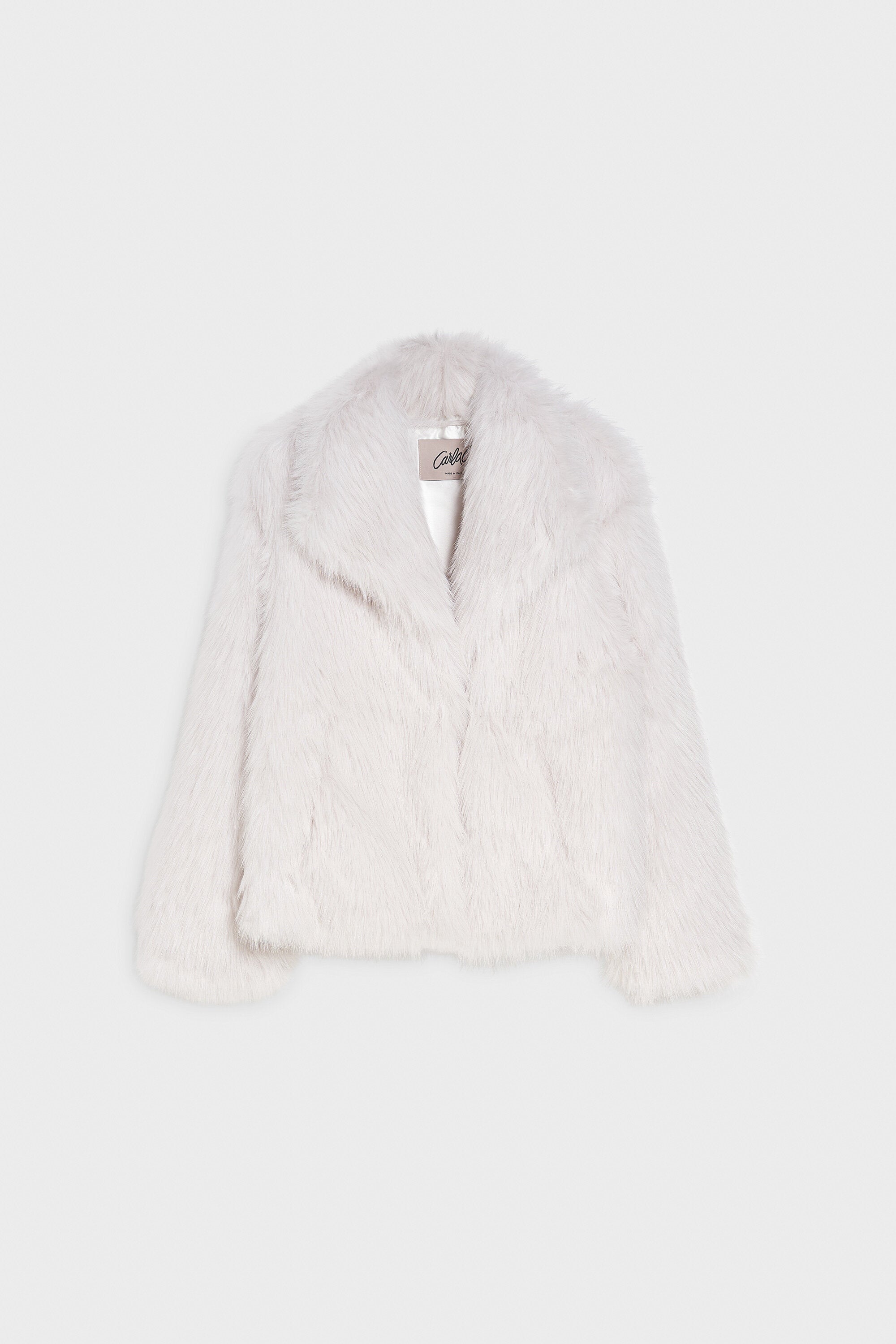 Pelliccia in ecovolpe. Collo a vela e chiusura con ganci ricoperti. Ampie tasche a filetto. Lunghezza sotto la vita. Capo foderato.