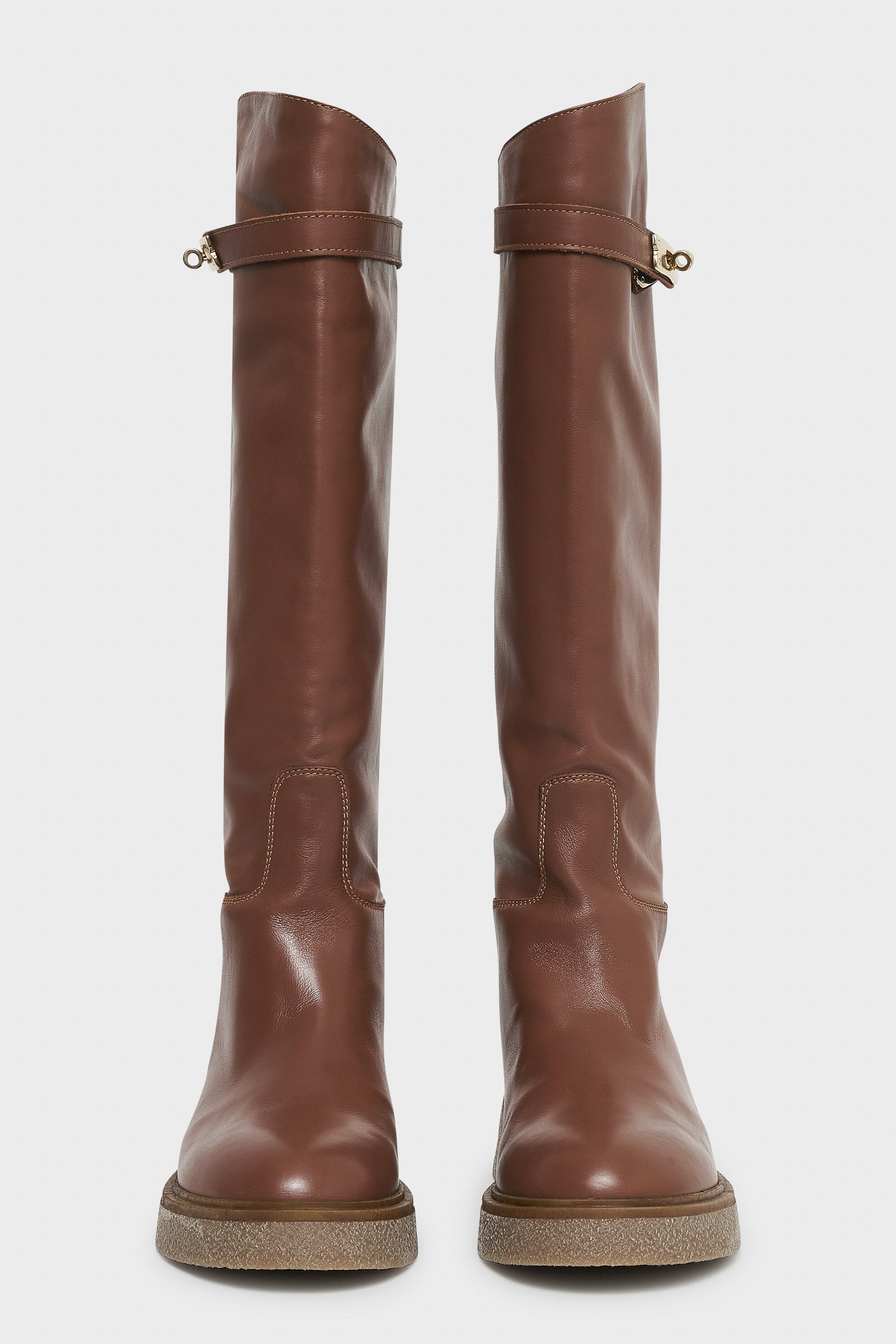 Stivali alti realizzati in pelle con punta arrotondata e fibbia in metallo. Suola chunky in gomma. Senza allacciatura.