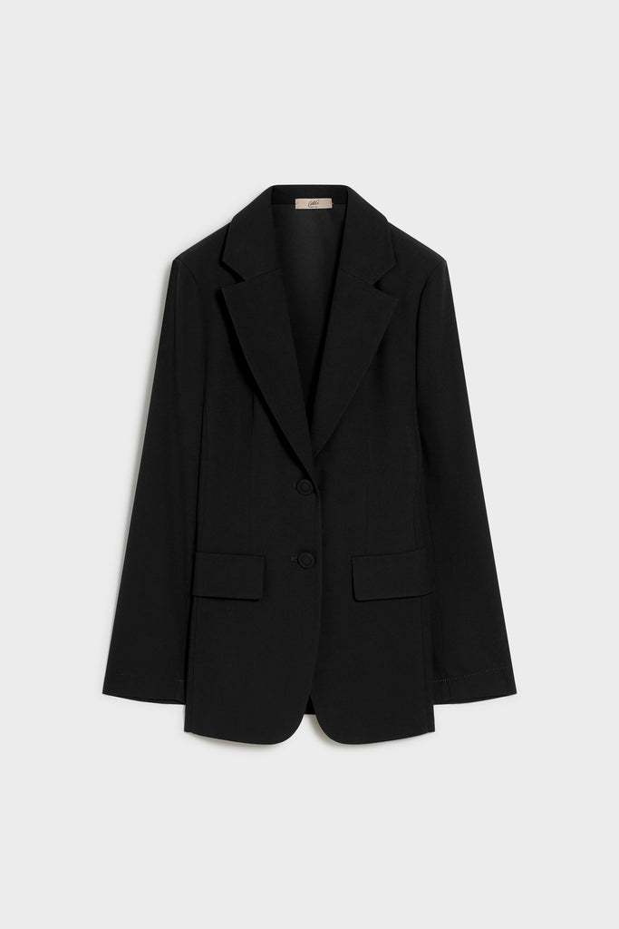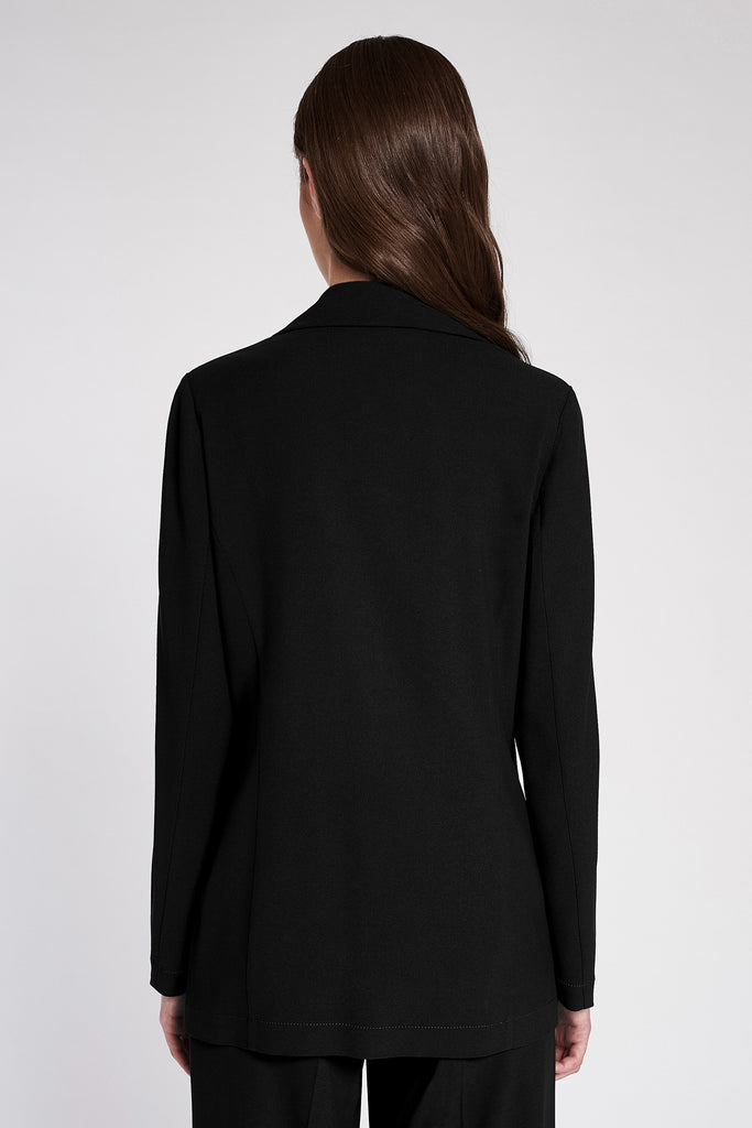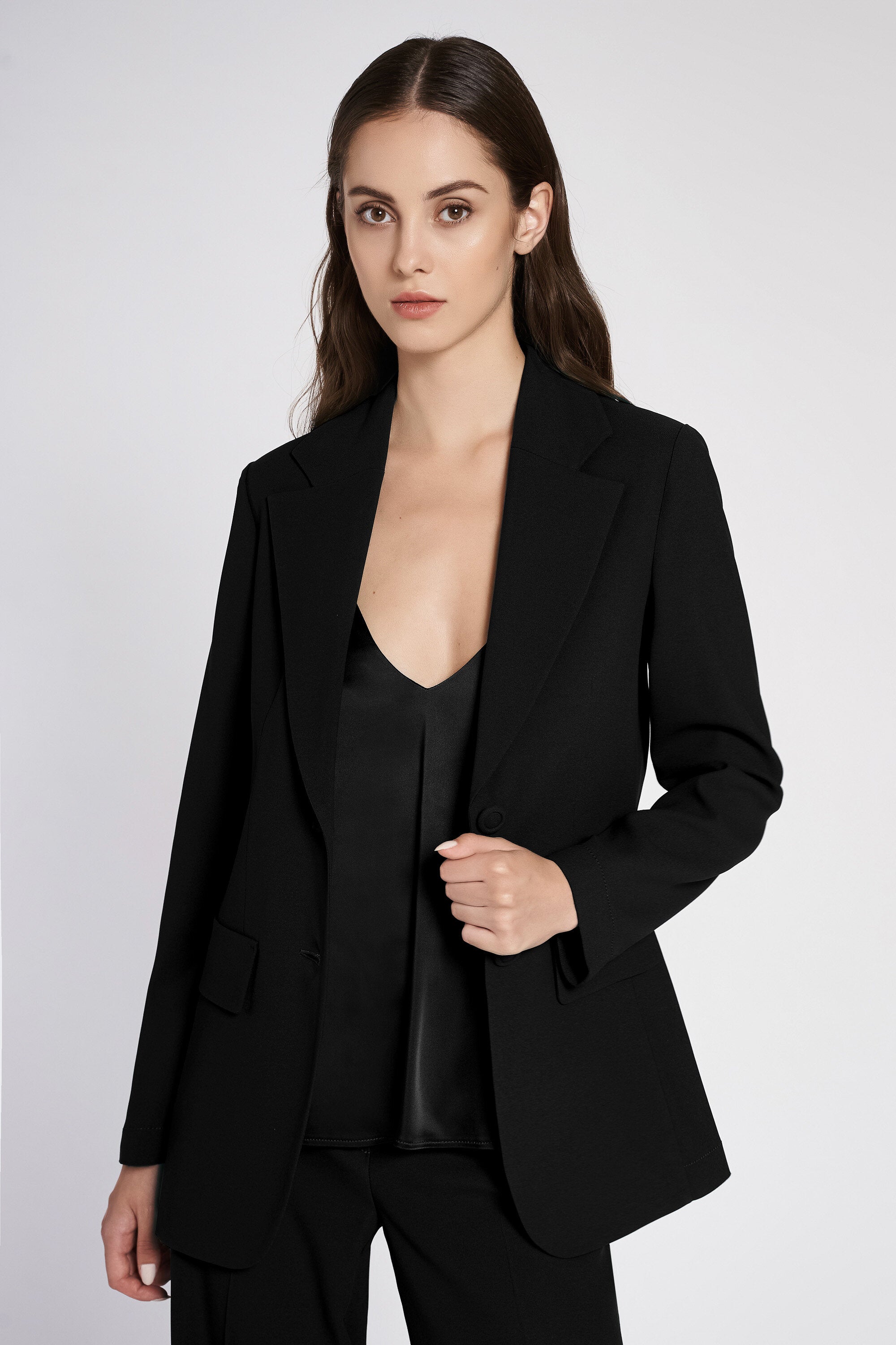 Blazer sfoderato in crepe di viscosa. Collo a revers e allacciatura monoppetto chiusa da bottoni ricoperti di tessuto in tinta. Patte applicate effetto tasca. Lunghezza sotto ai fianchi.