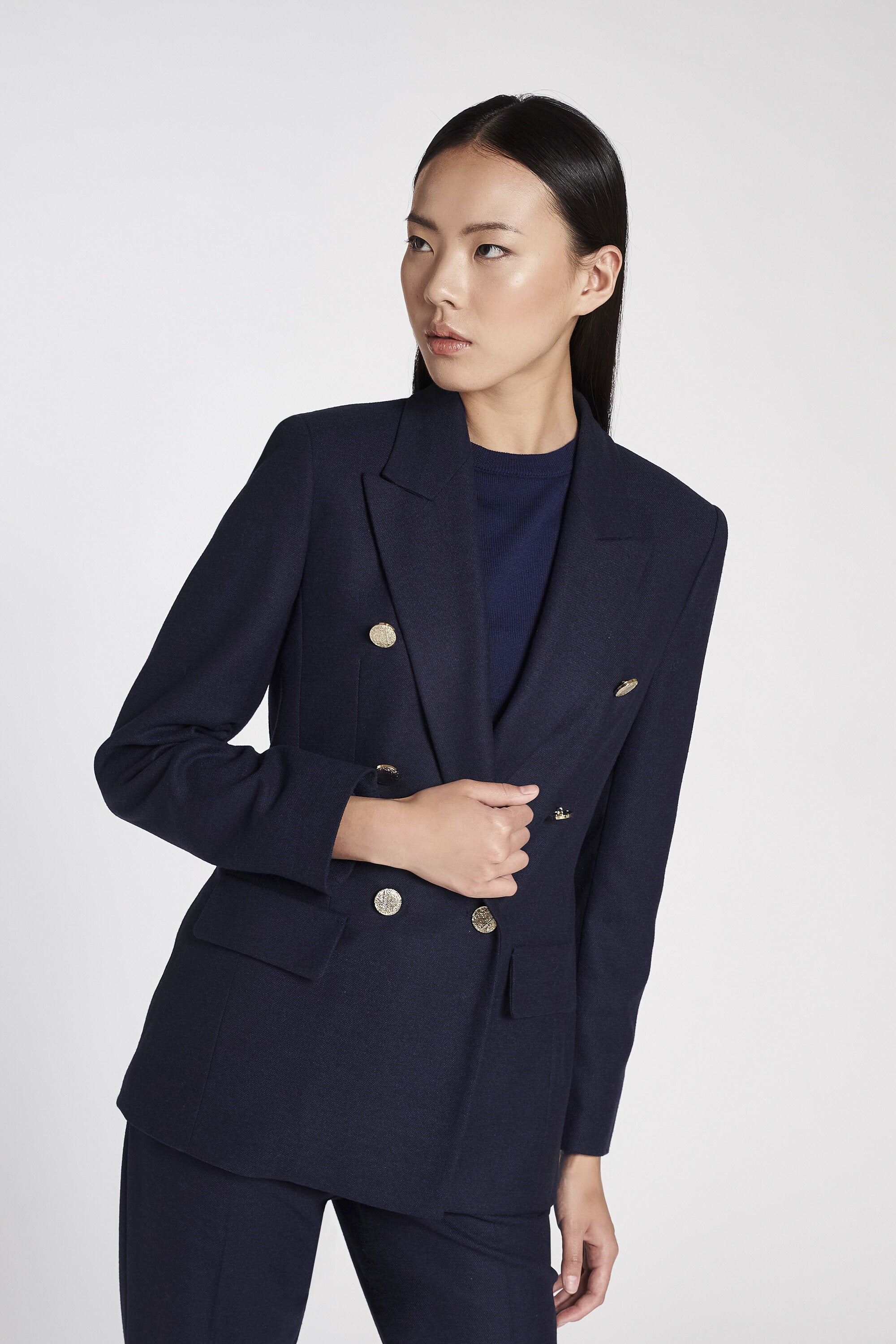 Bazer doppiopetto foderato in flanella elasticizzata con spalline imbottite. Collo con revers a lancia e chiusura con bottoni in metallo effetto trama. Patte applicate effetto tasca. Lunghezza sotto ai fianchi.