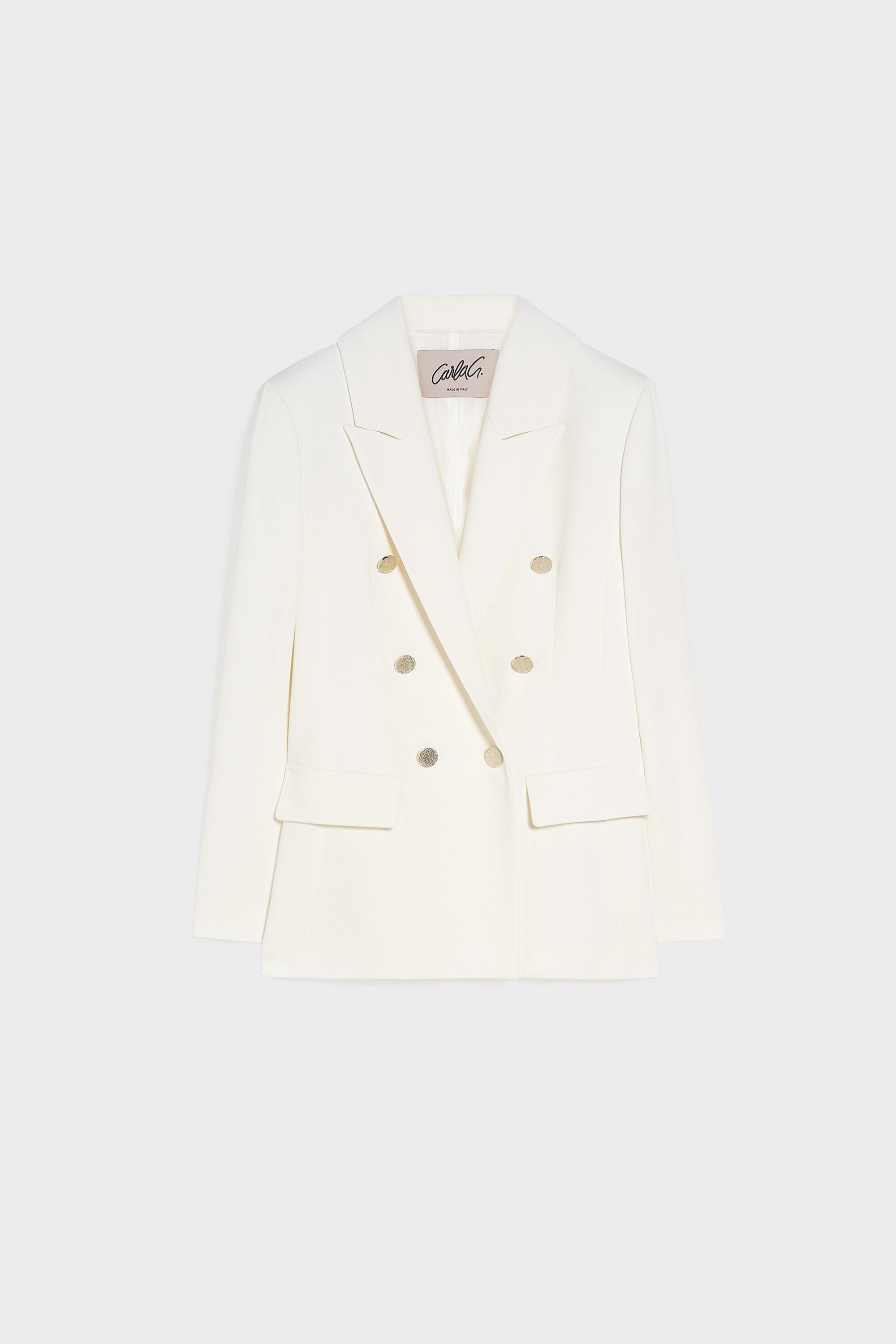 Blazer doppiopetto foderato in gabardina elasticizzata con spalline imbottite. Collo con revers e...Learn more
