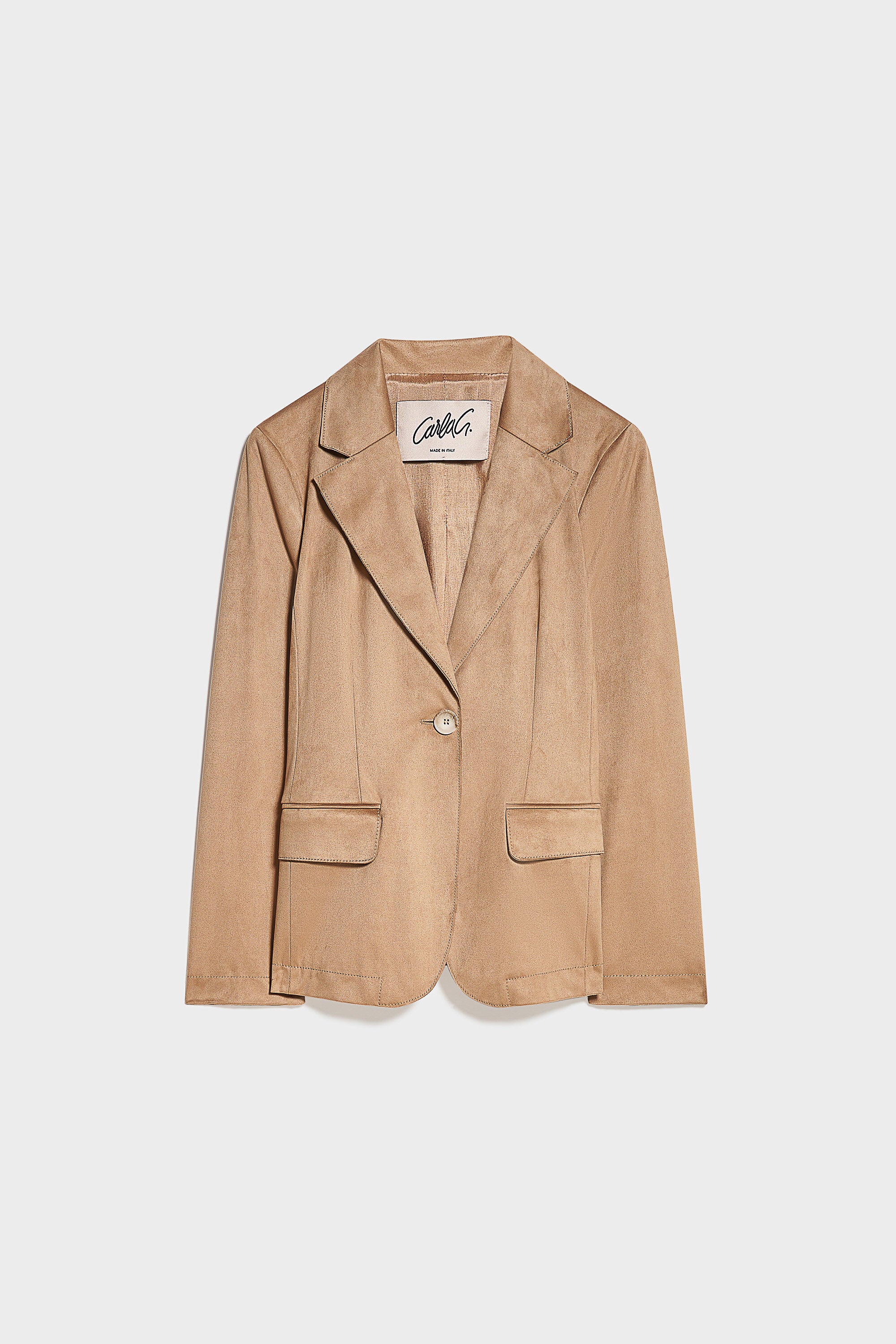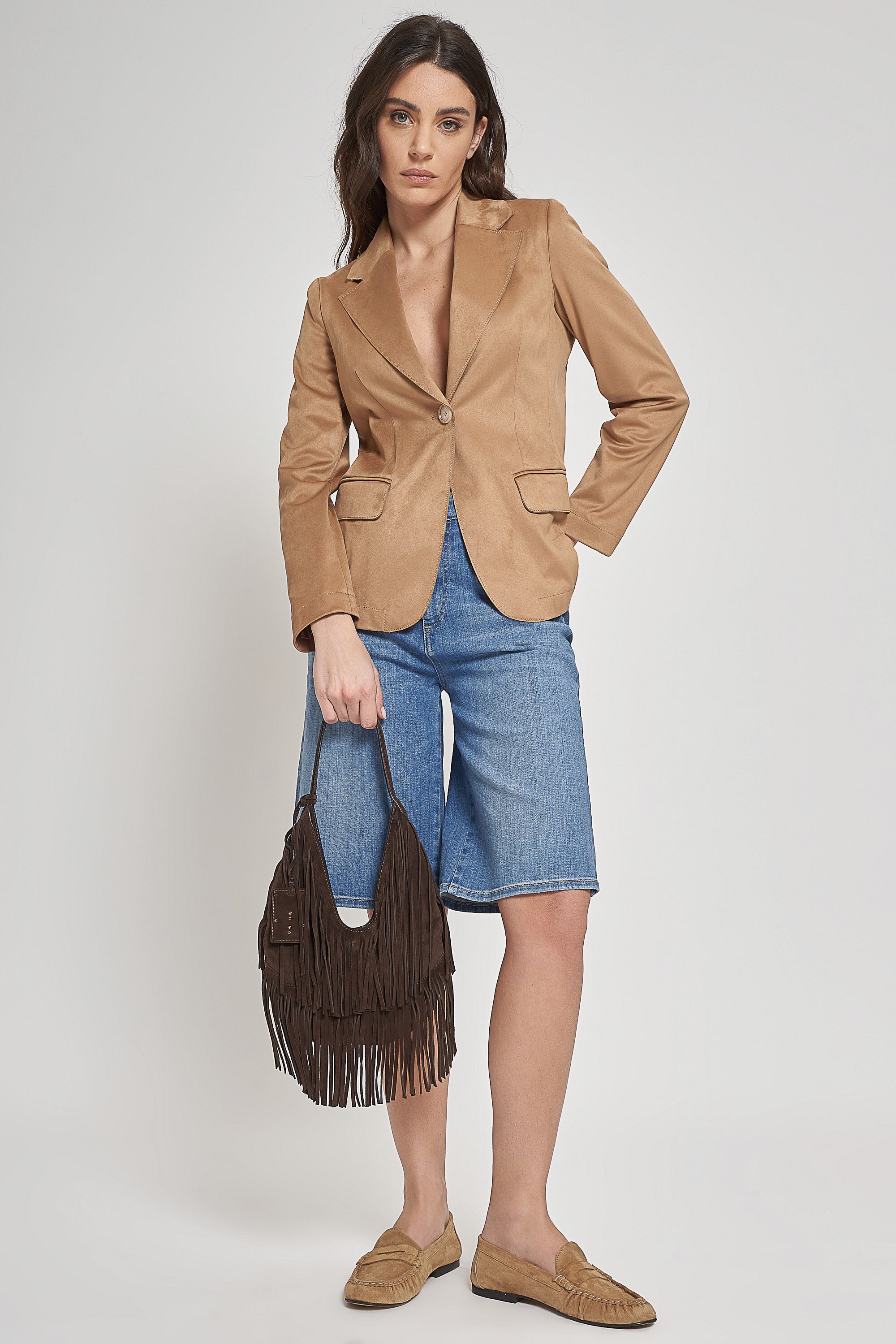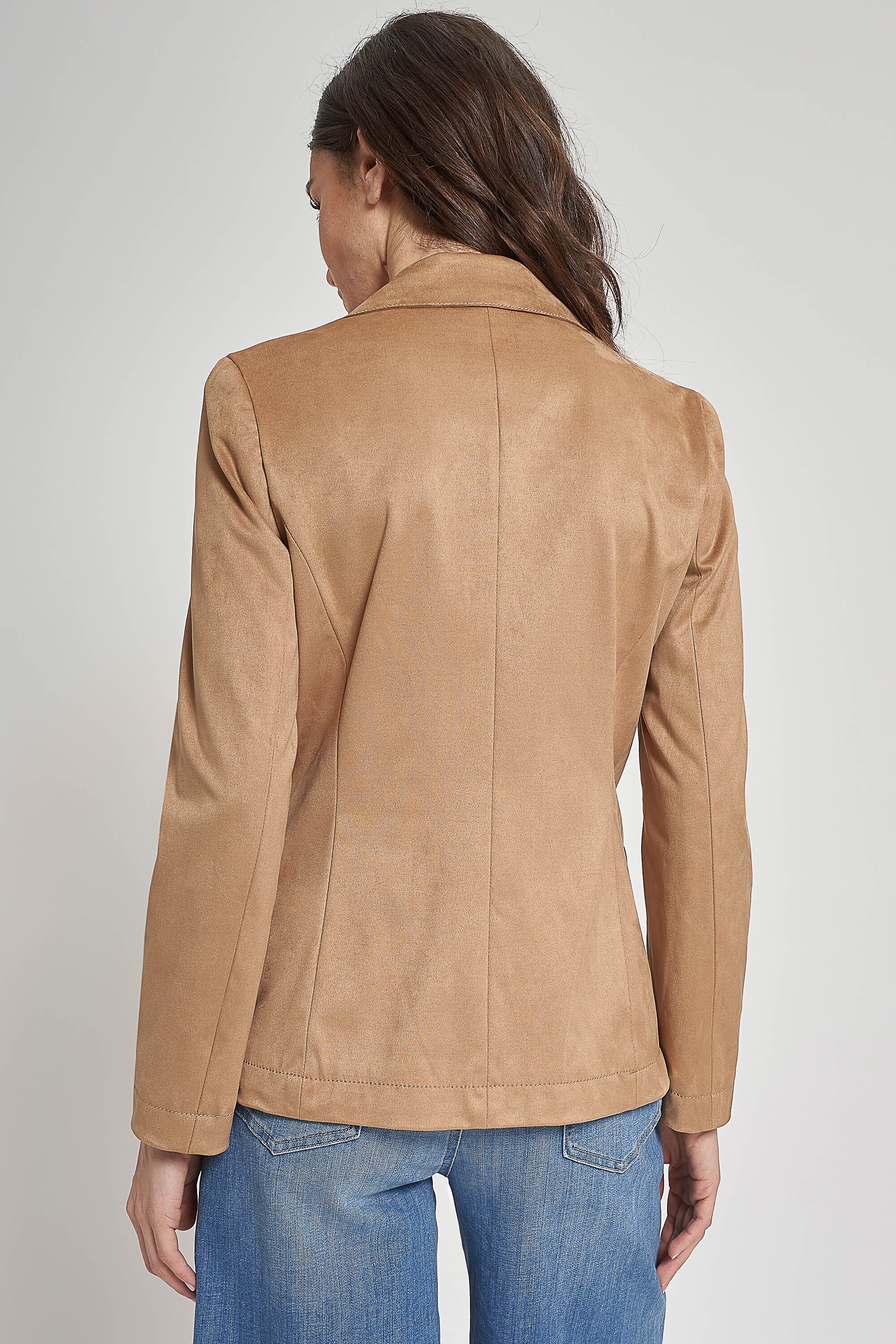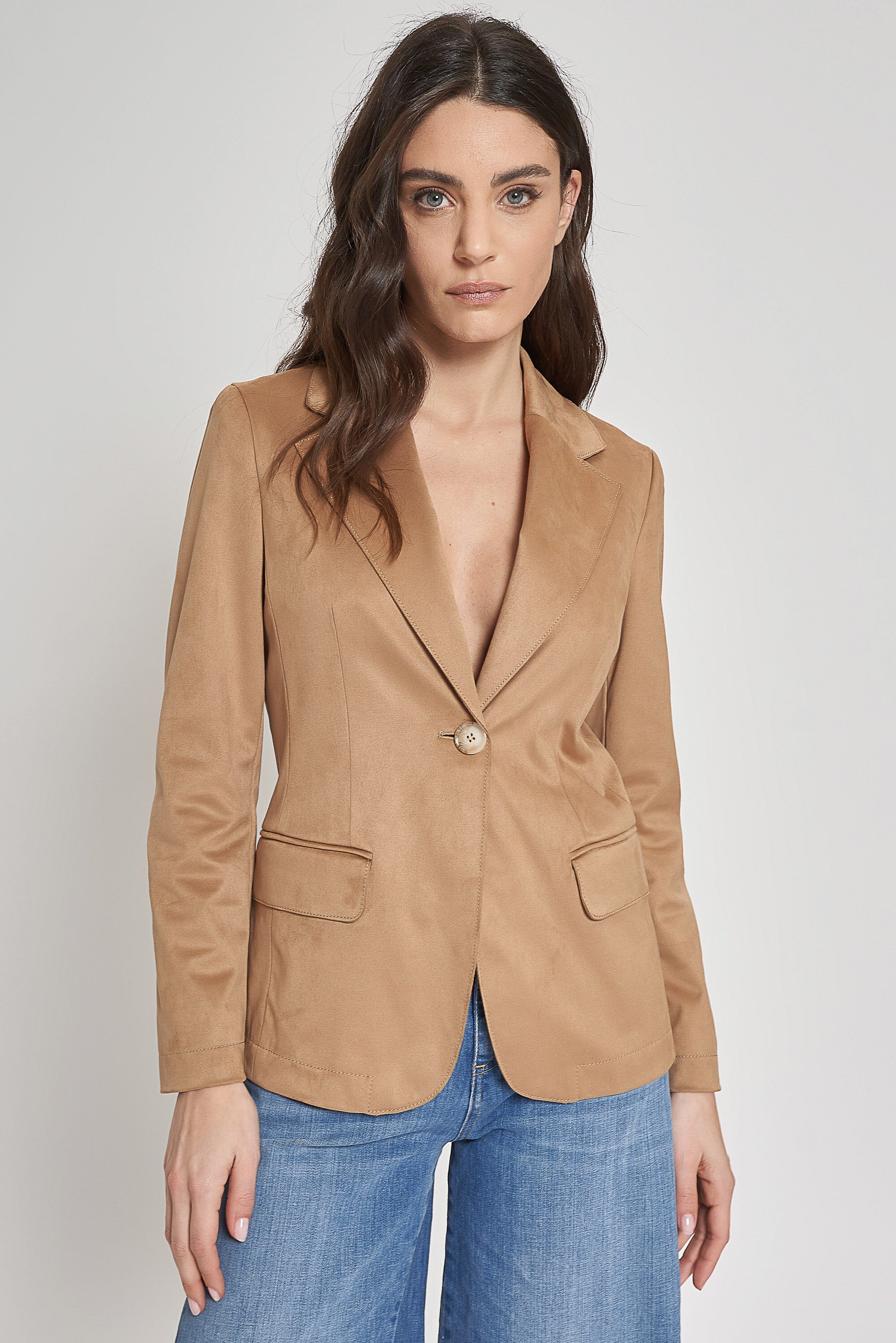 Blazer foderato in ecocamoscio. Collo con revers e chiusura con bottone finto corno. Lunghezza so...Learn more