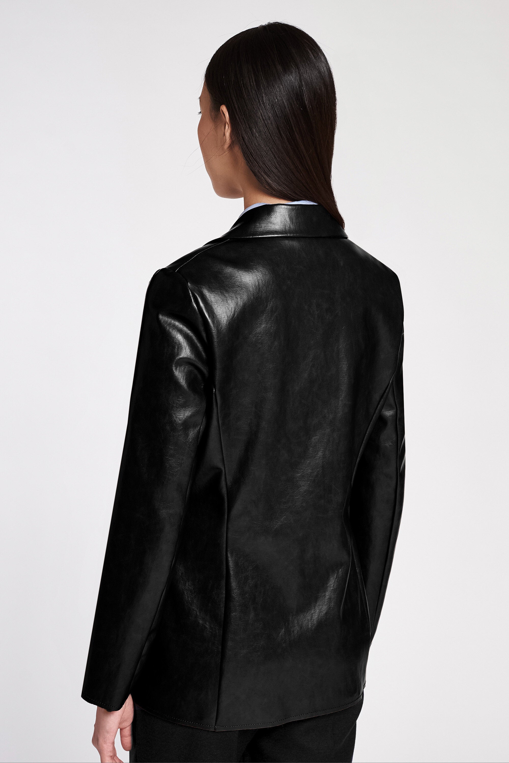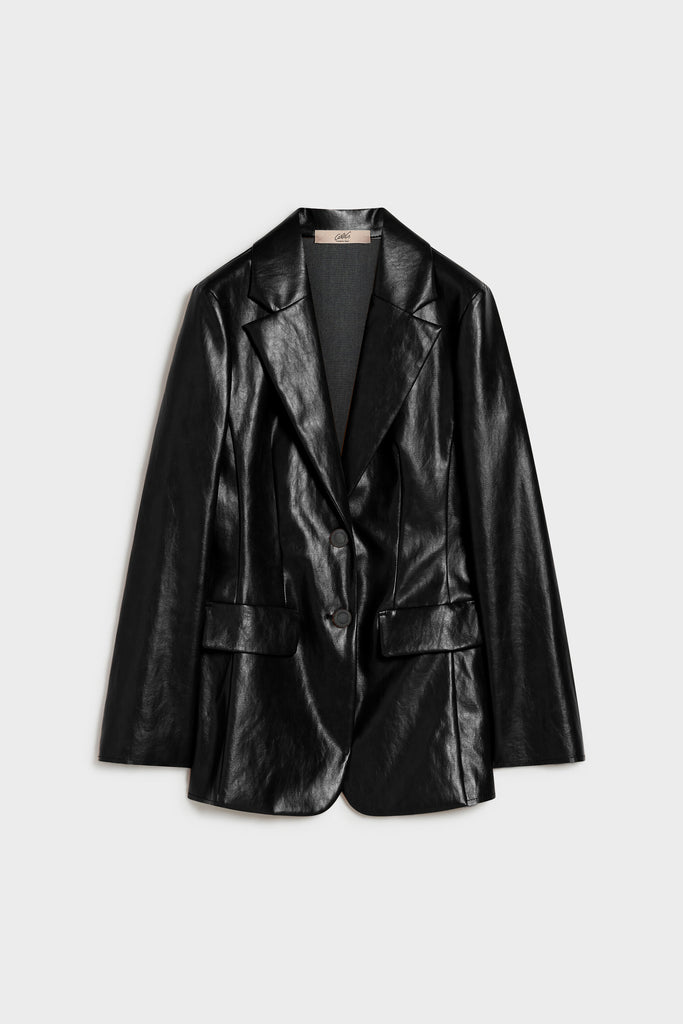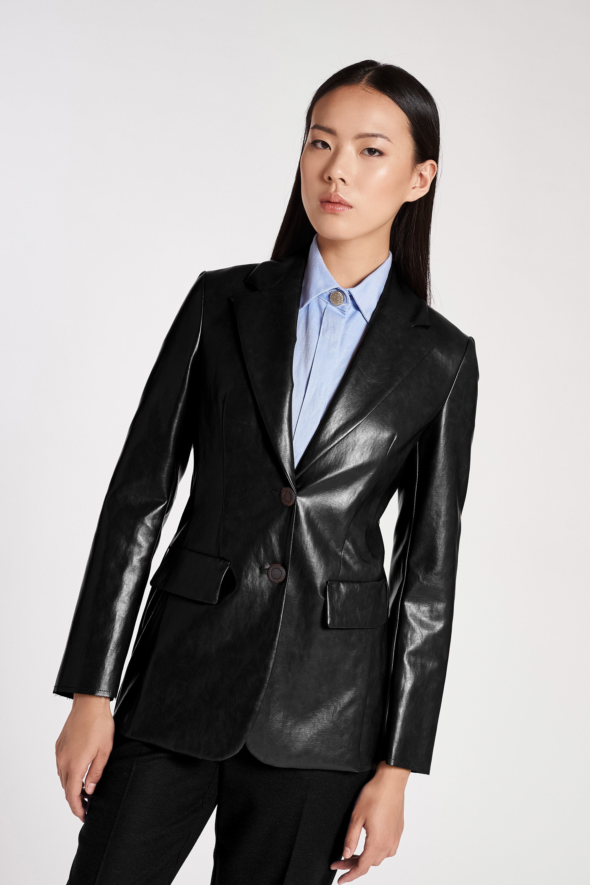 Blazer monopetto sfoderato in ecopelle stropicciata. Collo a revers e chiusura con bottoni ricoperti di tessuto in tinta. Patte applicate effetto tasca. Lunghezza sotto ai fianchi.
