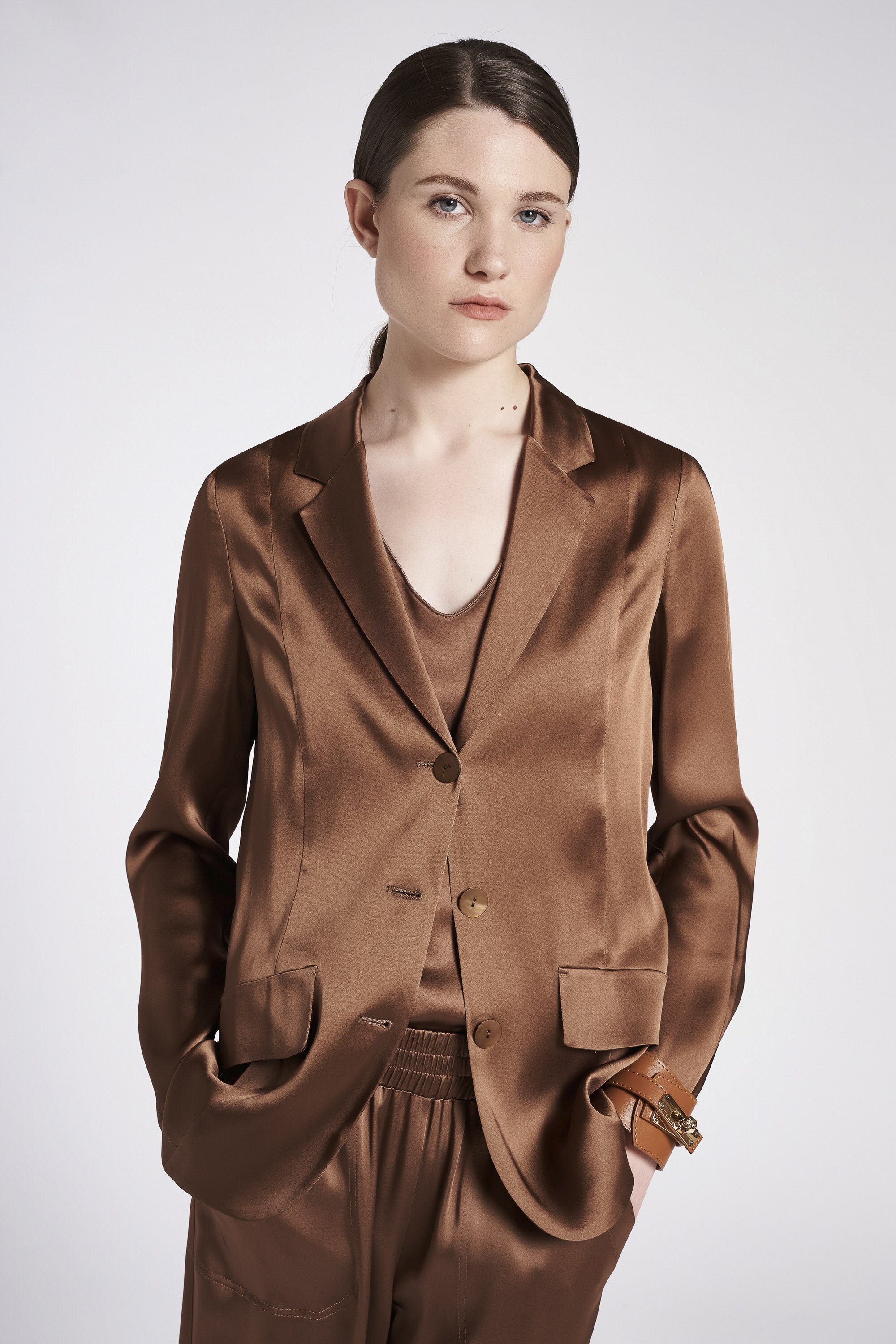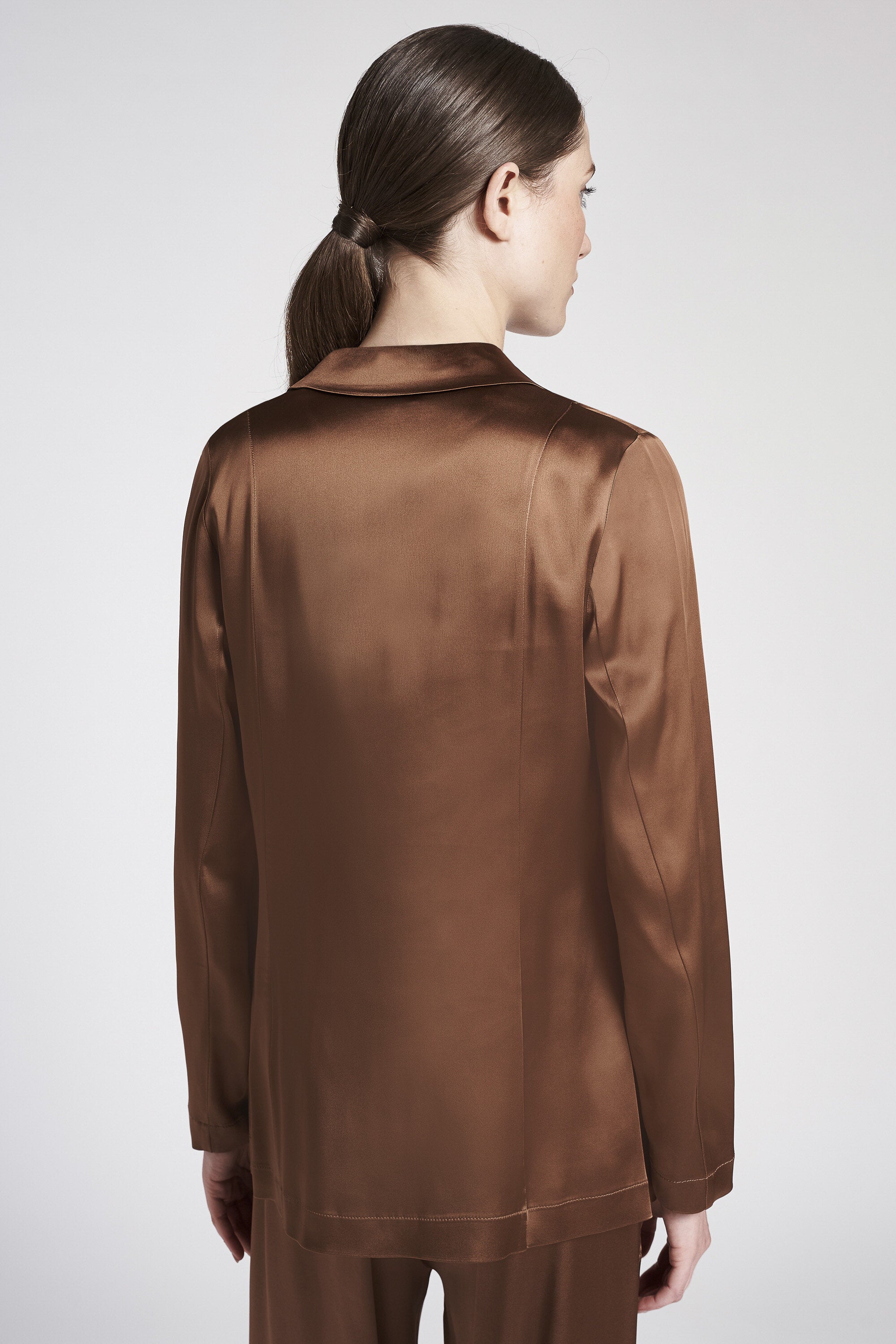 Blazer monopetto sfoderato in raso elasticizzato. Collo con revers e chiusura con bottoni madrepe...Learn more