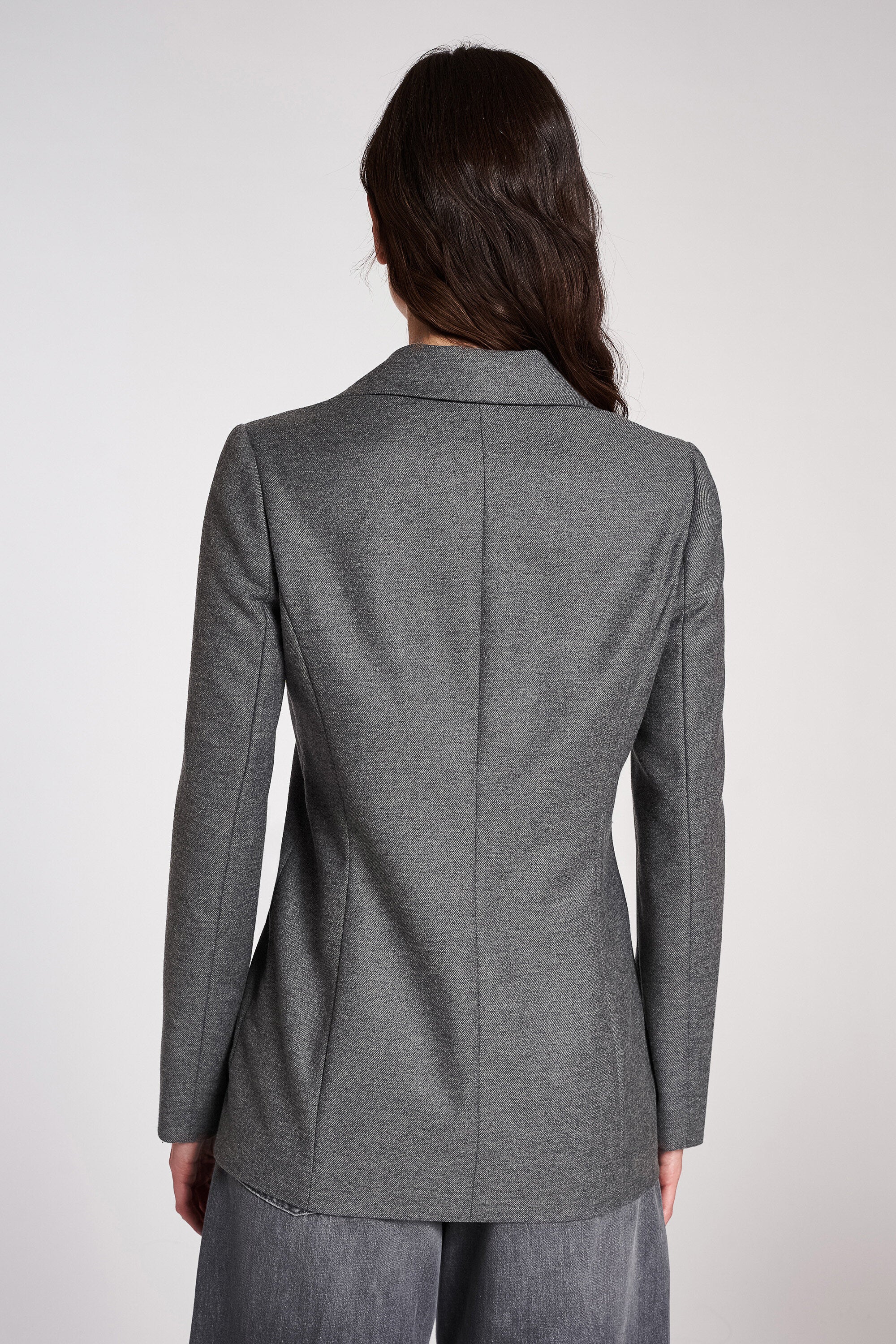 Blazer monopetto foderato in tinto filo elasticizzato. Collo con revers e chiusura con bottoni in metallo effetto trama. Patte applicate effetto tasca. Lunghezza sotto ai fianchi.