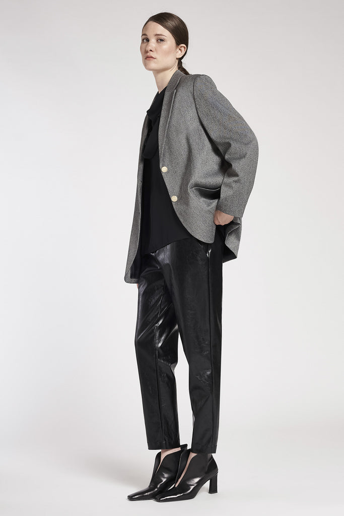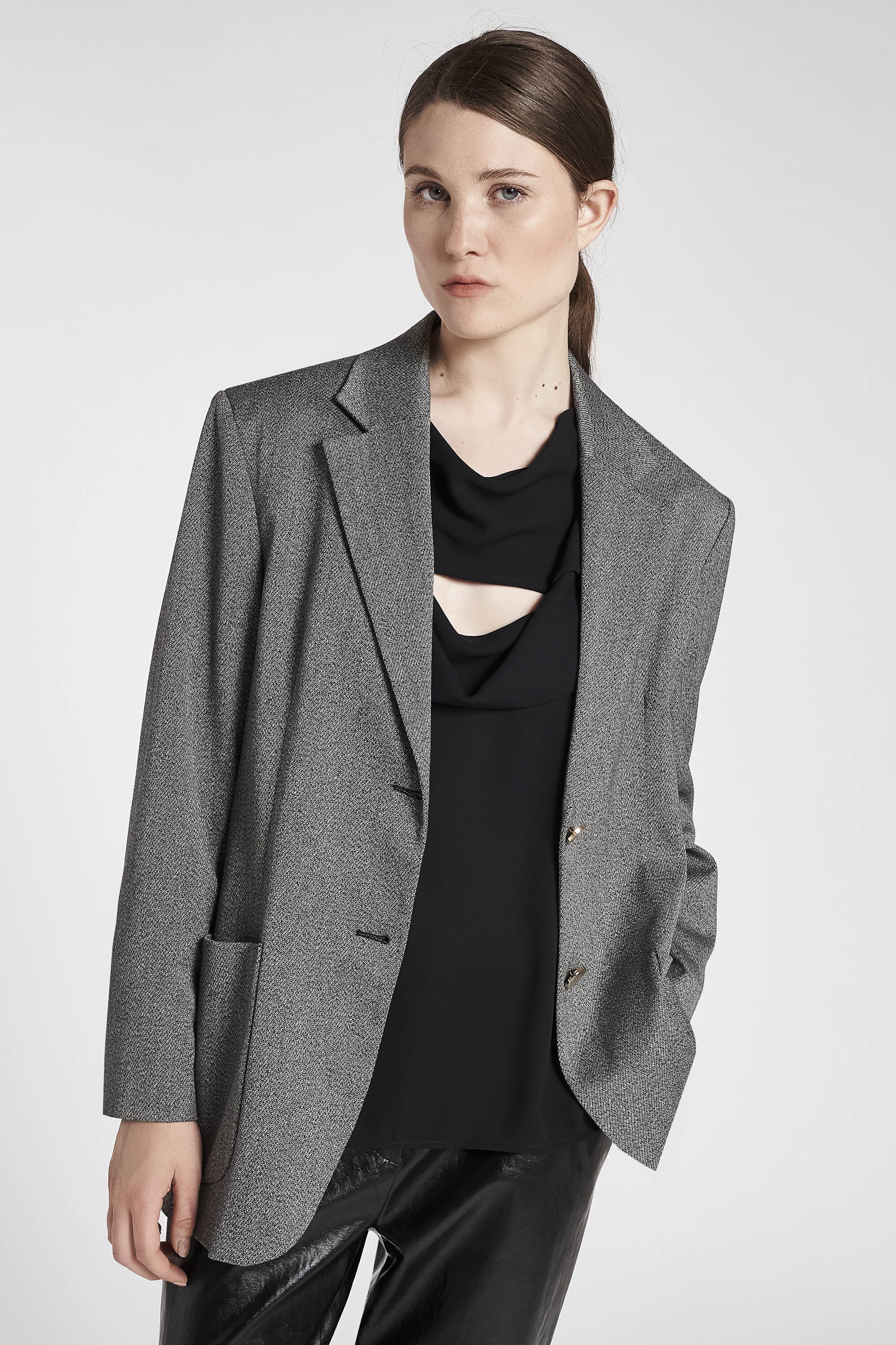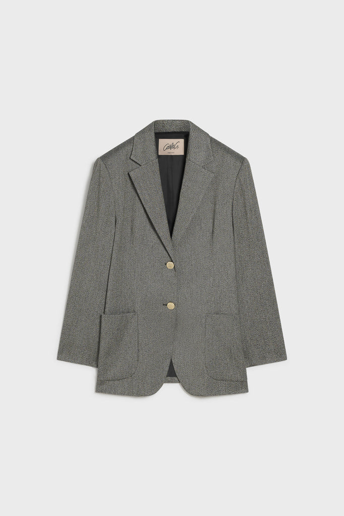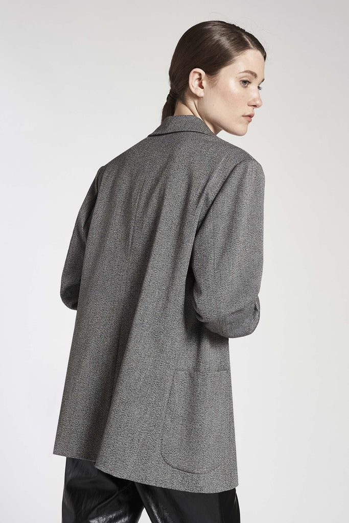 Blazer over foderato in tinto filo elasticizzato con spalline imbottite. Collo con revers e chiusura con bottoni in metallo effetto trama. Ampie tasche a toppa. Lunghezza sotto ai fianchi.