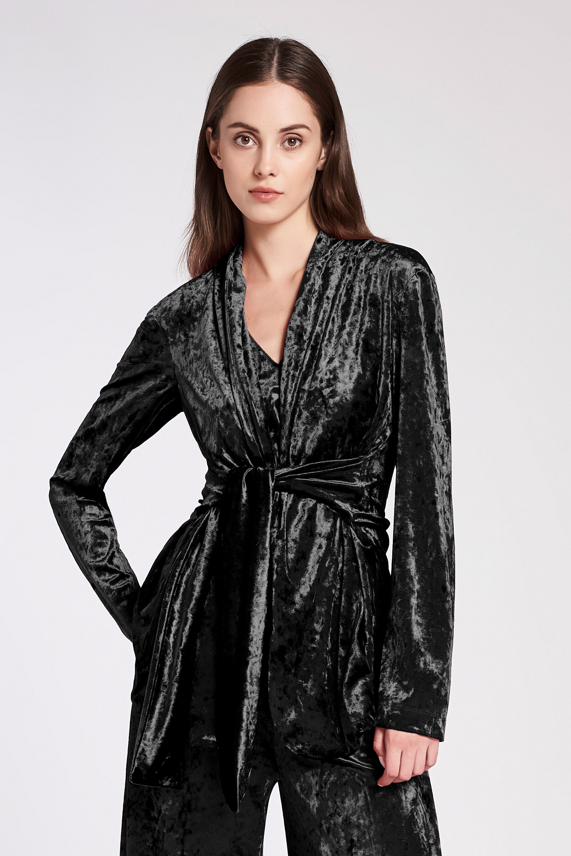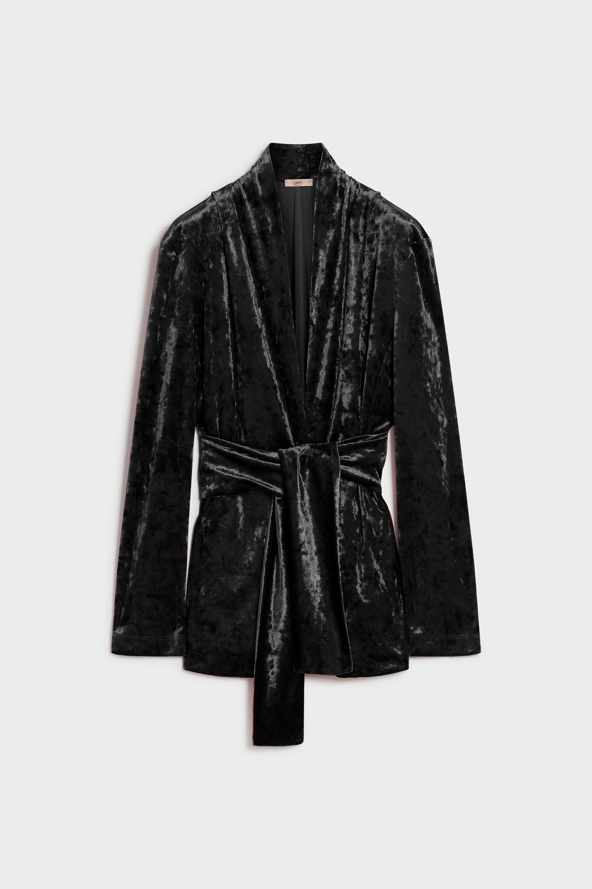 Giacca sfoderata in velluto pannè elasticizzato. Collo con rever in piedi e pieghe. In vita cintura a nastro da annodare ed entrata tasche laterale. Lunghezza sotto ai fianchi.