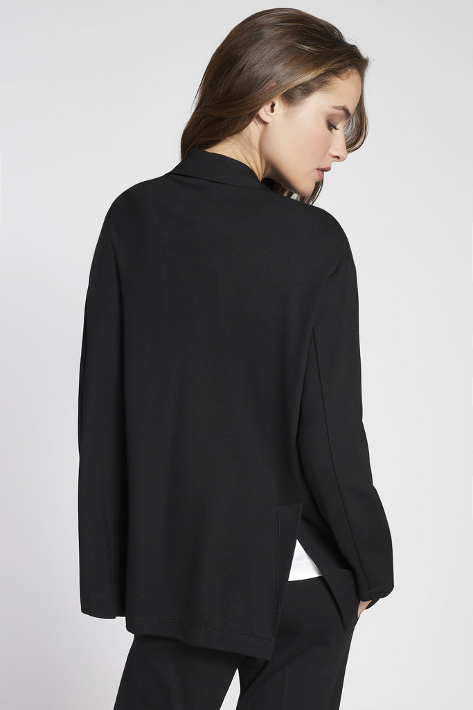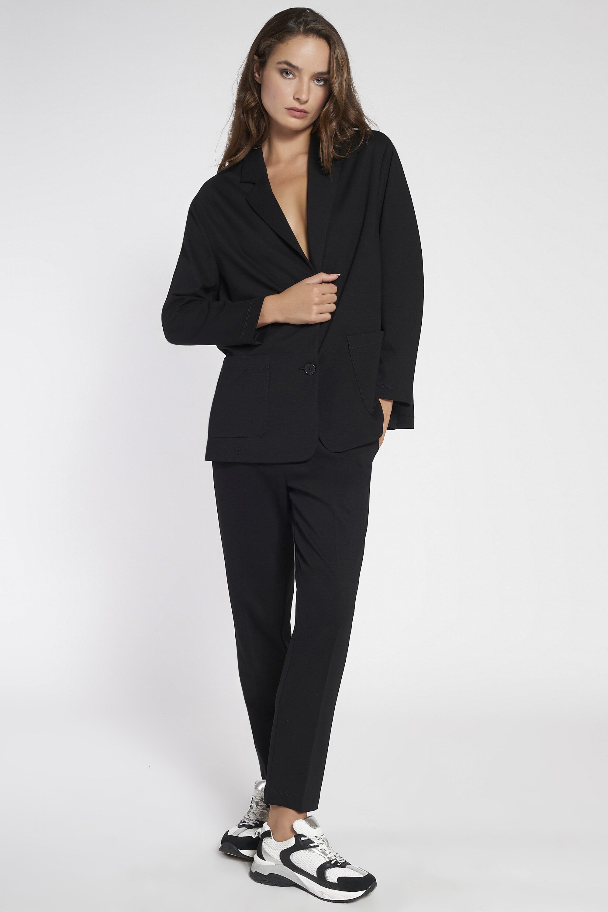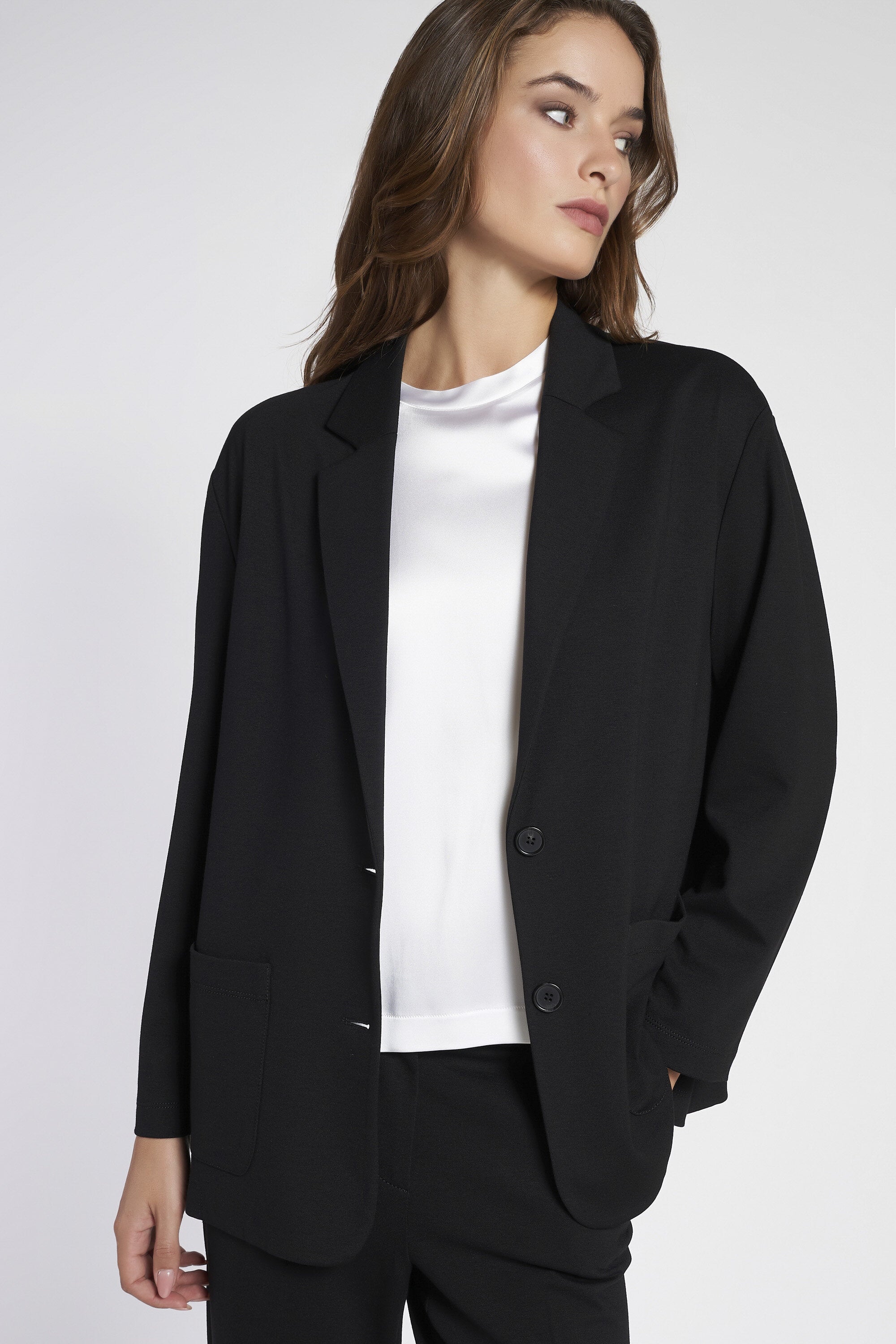 Blazer oversize sfoderato in maglia stoffa elasticizzata. Chiusura con bottoni in eco-corno. Ampie tasche a toppa applicate. Lunghezza sotto ai fianchi.