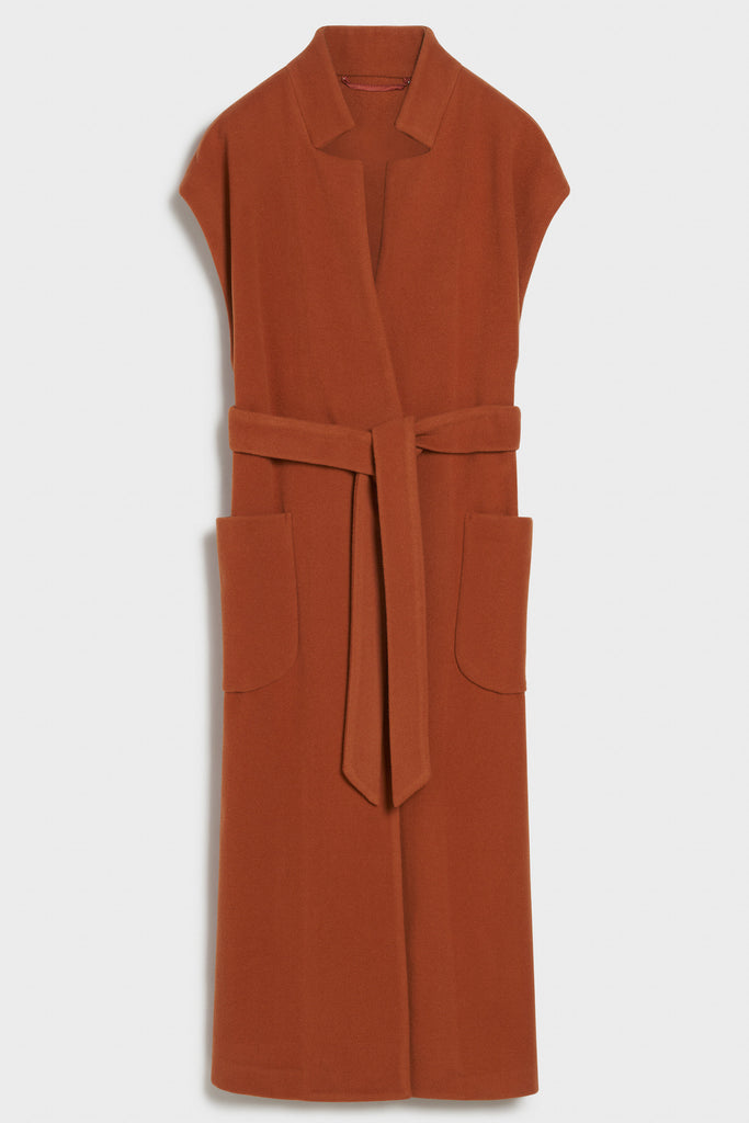 Gilet lungo sfoderato in caban. Ampio scollo a vela, passanti in vita e cintura a nastro. Ampie tasche a toppa applicate. Lunghezza sotto al ginocchio.