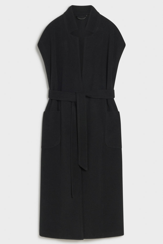 Gilet lungo sfoderato in caban. Ampio scollo a vela, passanti in vita e cintura a nastro. Ampie tasche a toppa applicate. Lunghezza sotto al ginocchio.