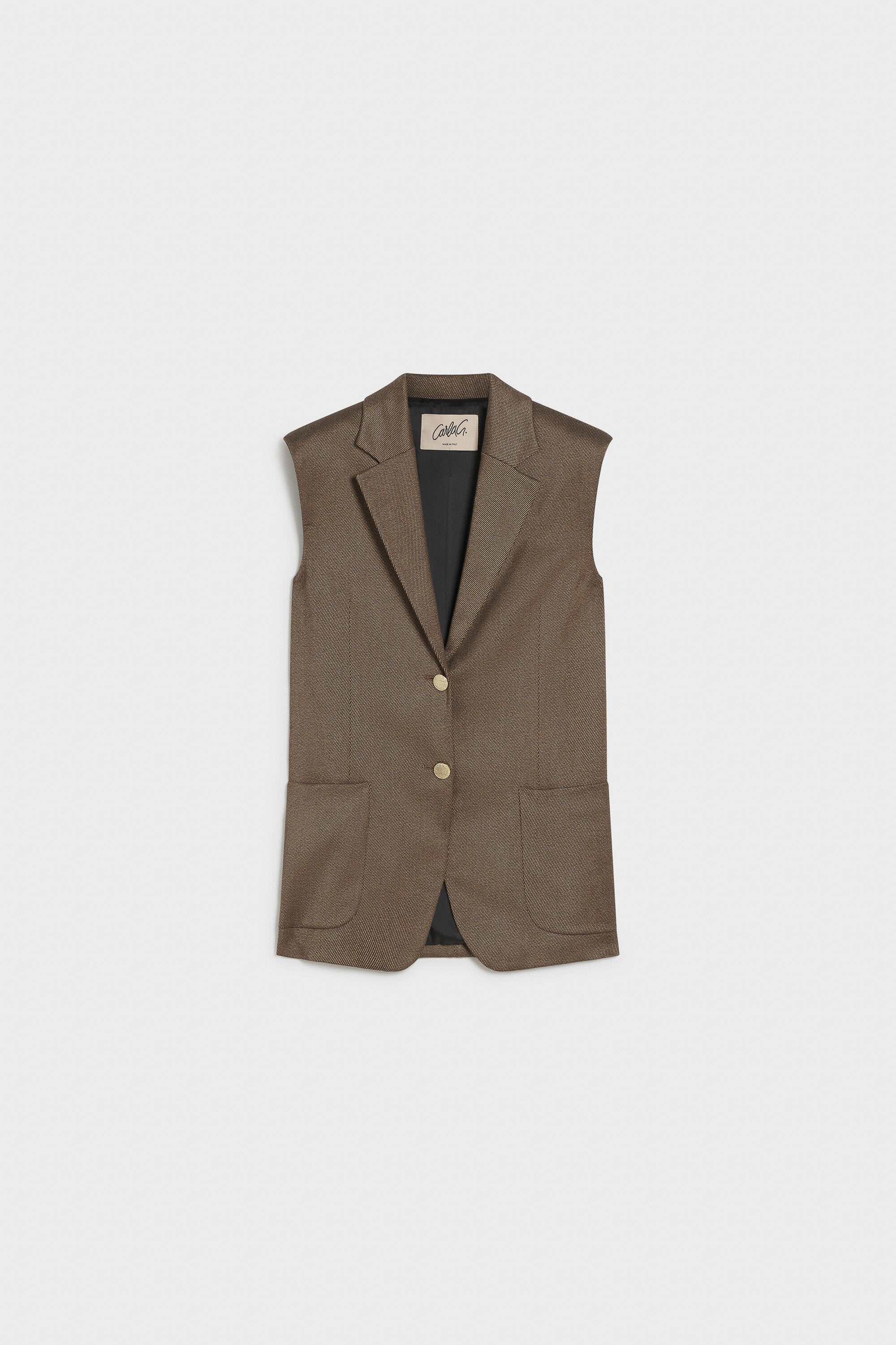 Gilet monopetto foderato in diagonale tinto filo elasticizzato con spalline imbottite. Collo con revers e chiusura con bottoni in metallo effetto trama. Ampie tasche a toppa. Lunghezza sotto ai fianchi.