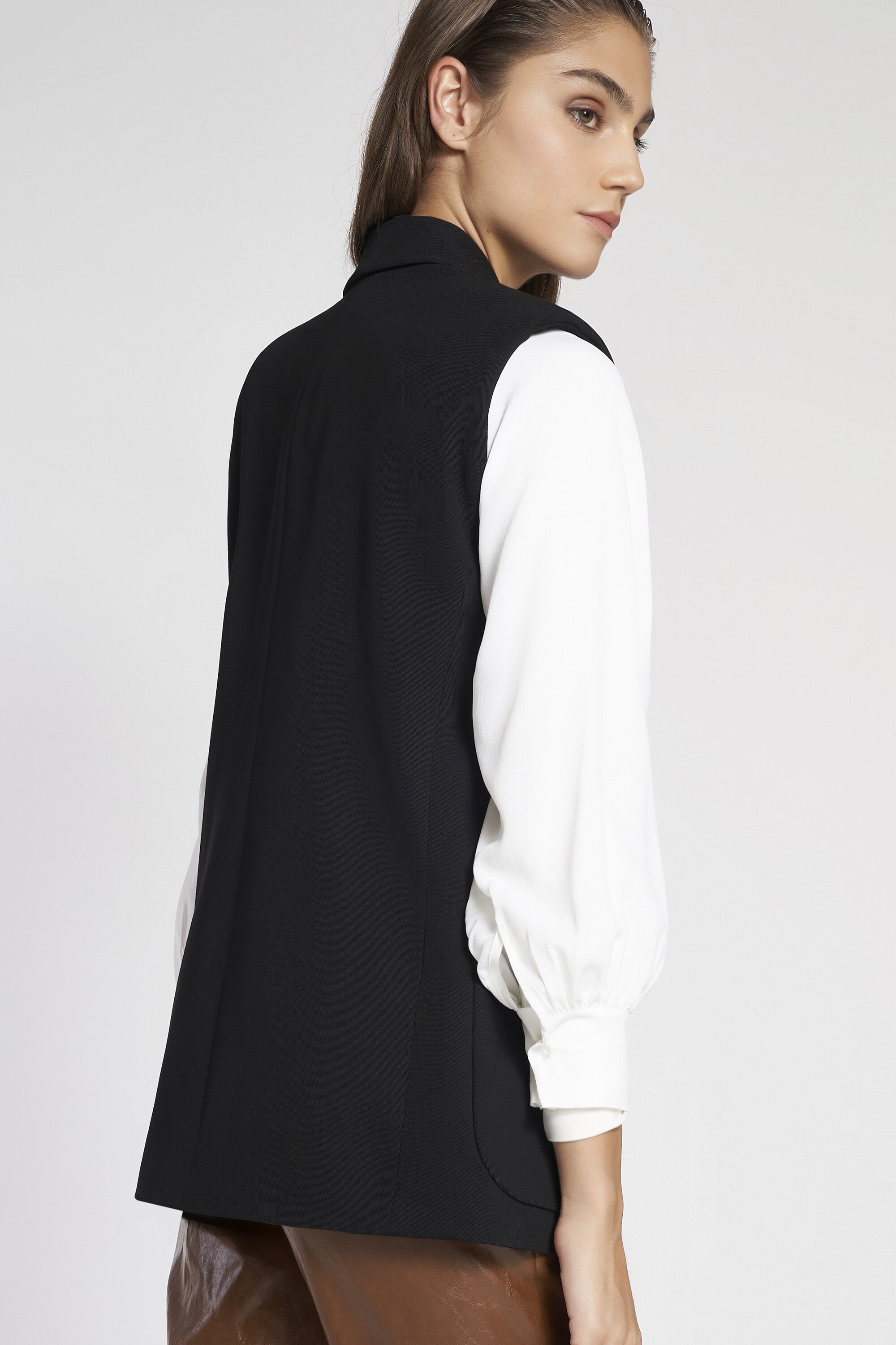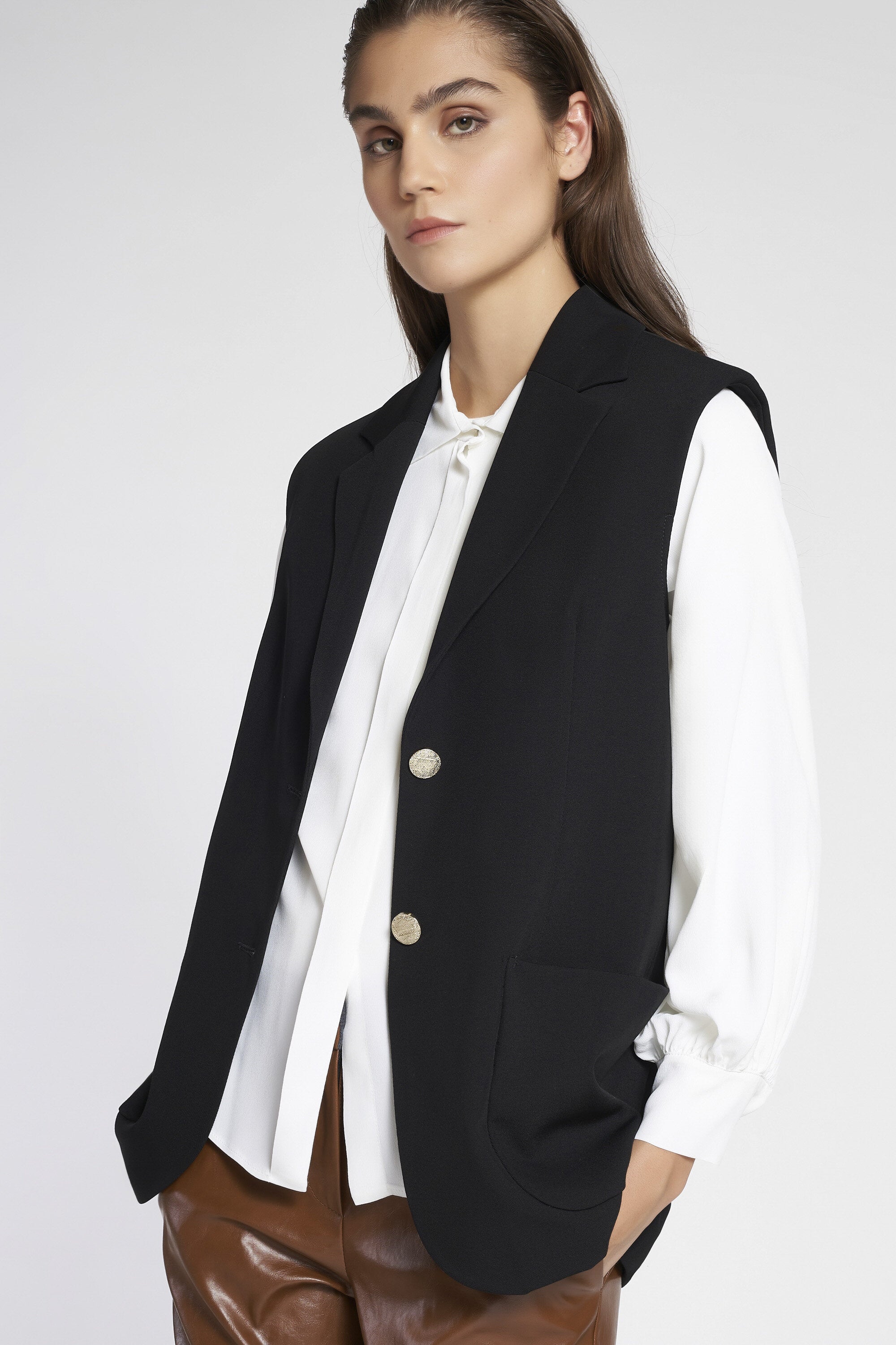 Gilet monopetto foderato in gabardina elasticizzata con spalline imbottite. Collo con revers e ch...Learn more