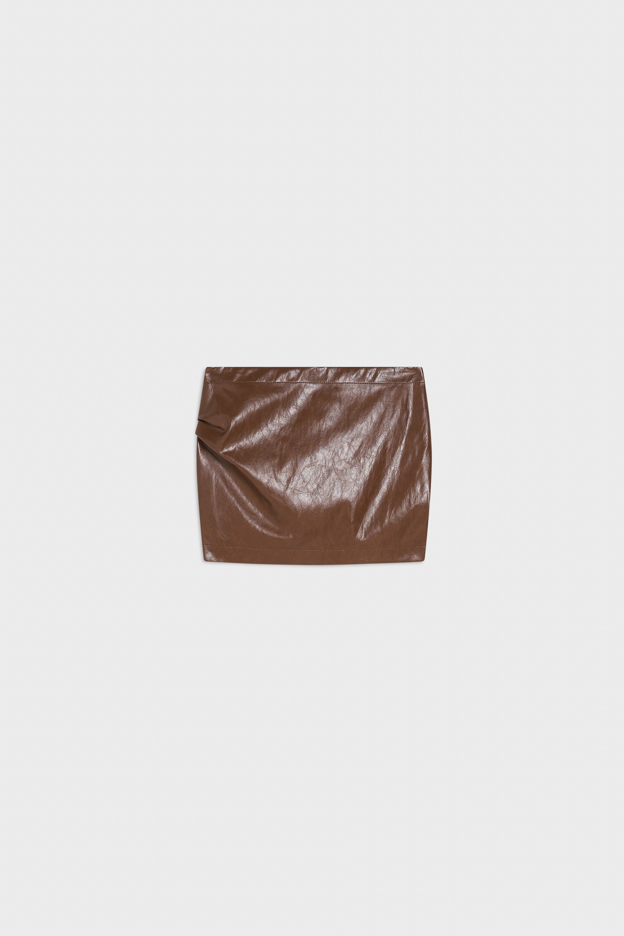 Minigonna sfoderata in ecopelle stropicciata. Vita bassa e lampo nel centro dietro. Pieghe su fianco.