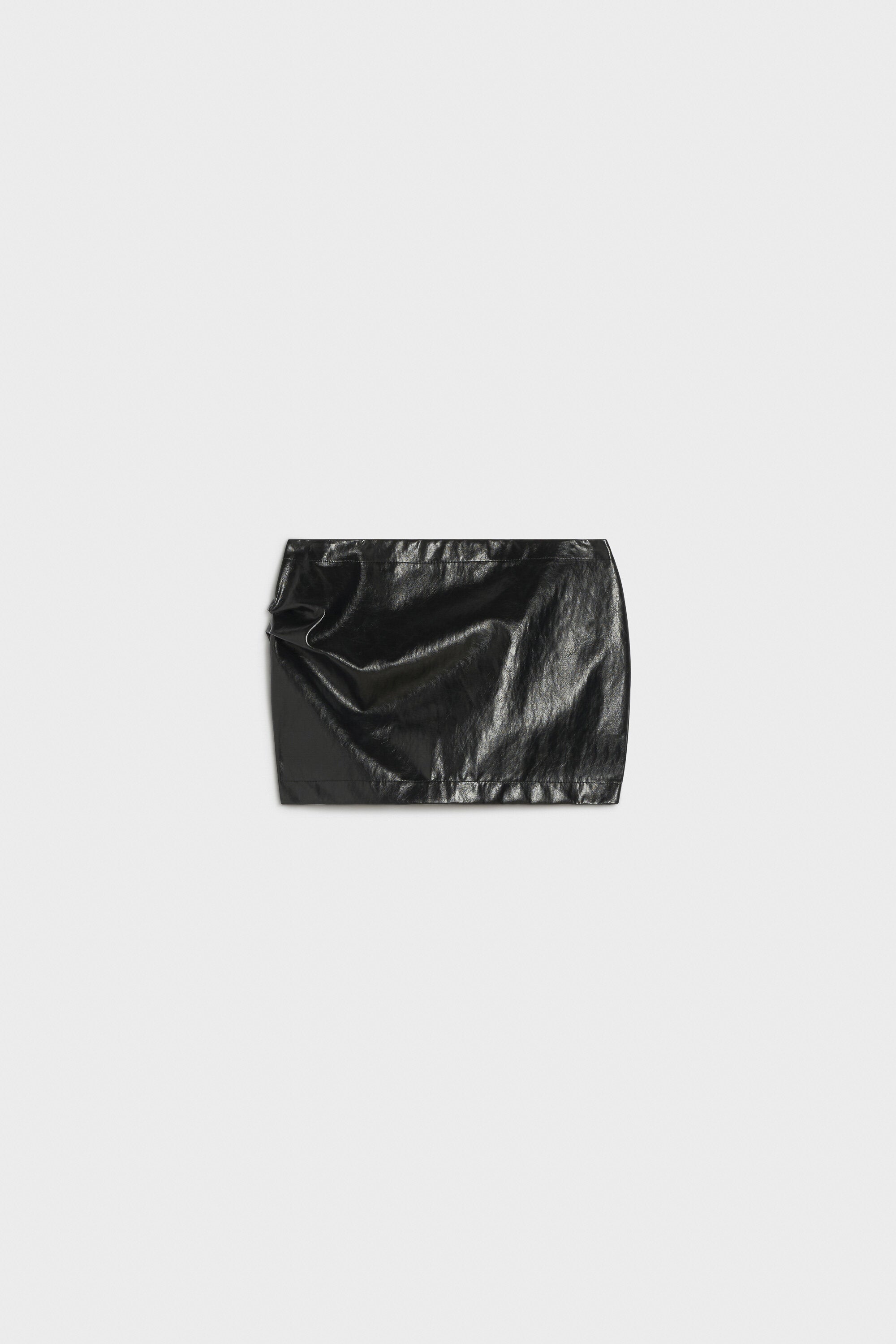 Minigonna sfoderata in ecopelle stropicciata. Vita bassa e lampo nel centro dietro. Pieghe su fianco.