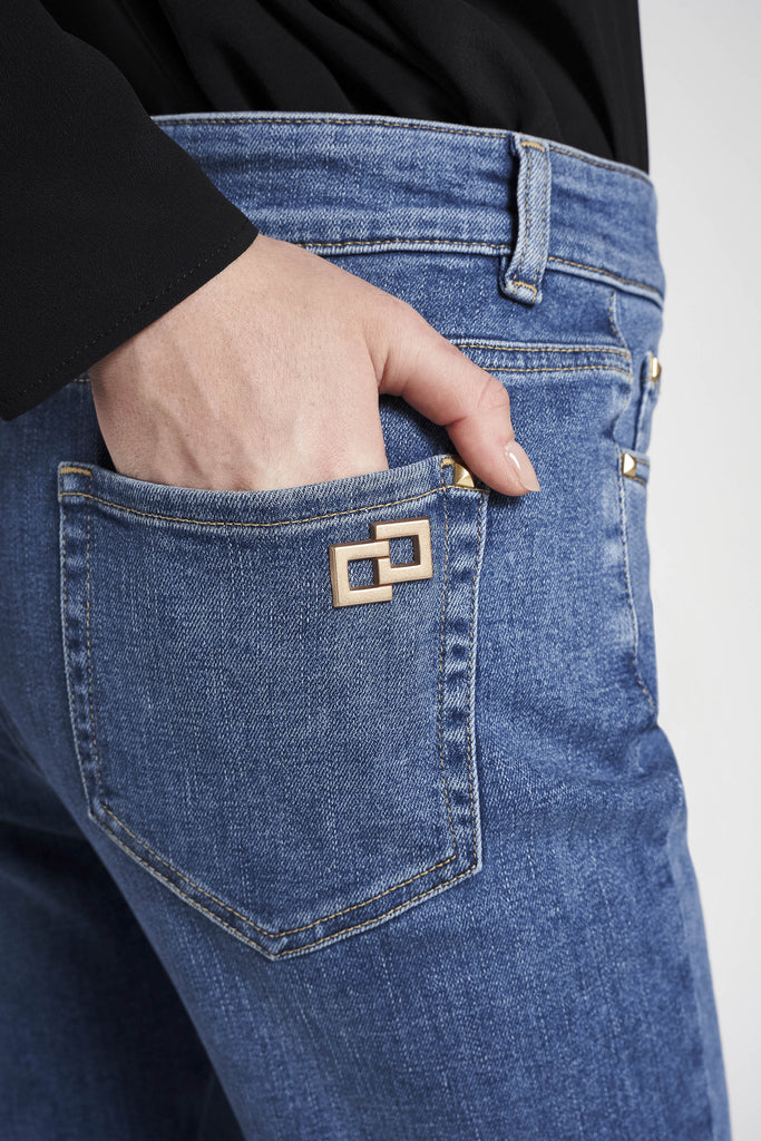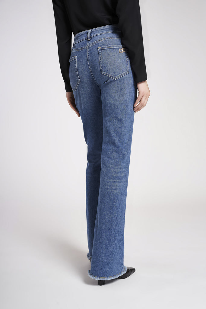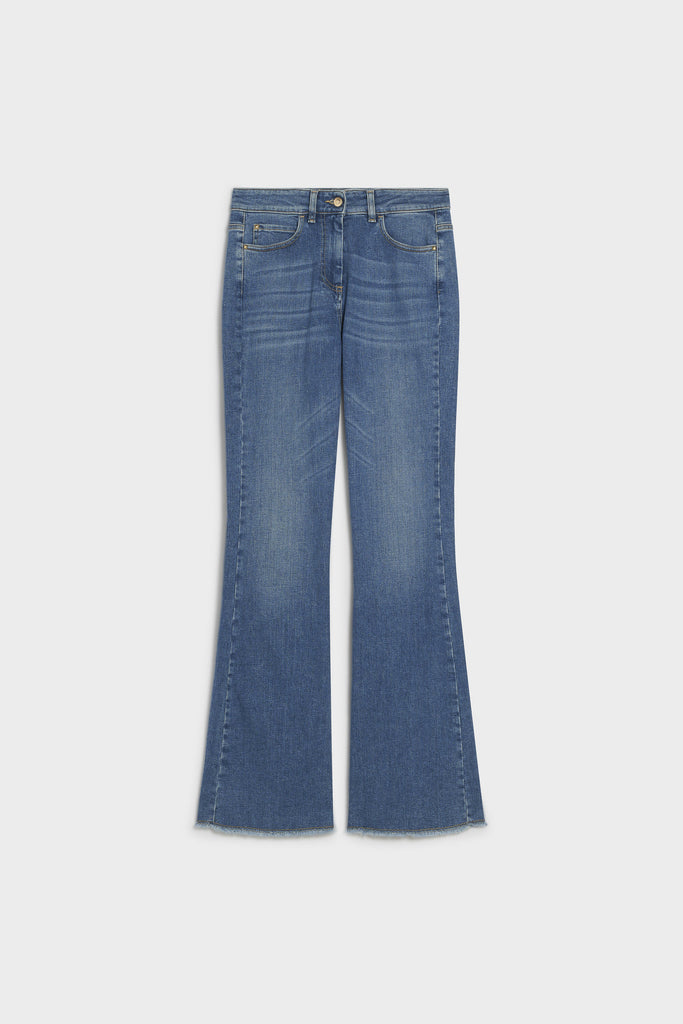 Jeans flare in denim elasticizzato deep blue a vita regolare. Zip nascosta e bottone a chiodo oro satinato in metallo. Tasche arrotondate sul davanti, logo CG metallico sul retro. Linea ampia, fondo sfrangiato.