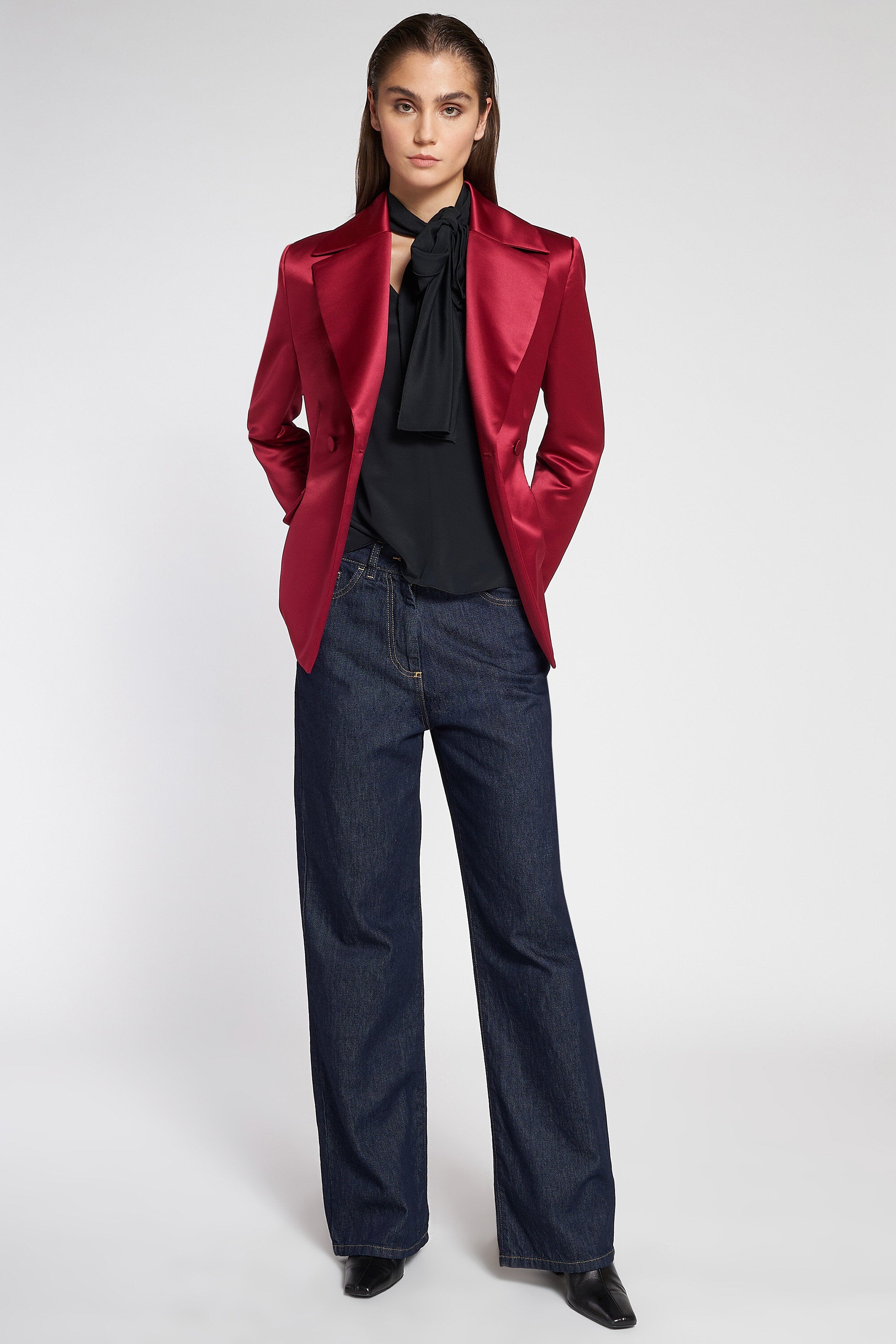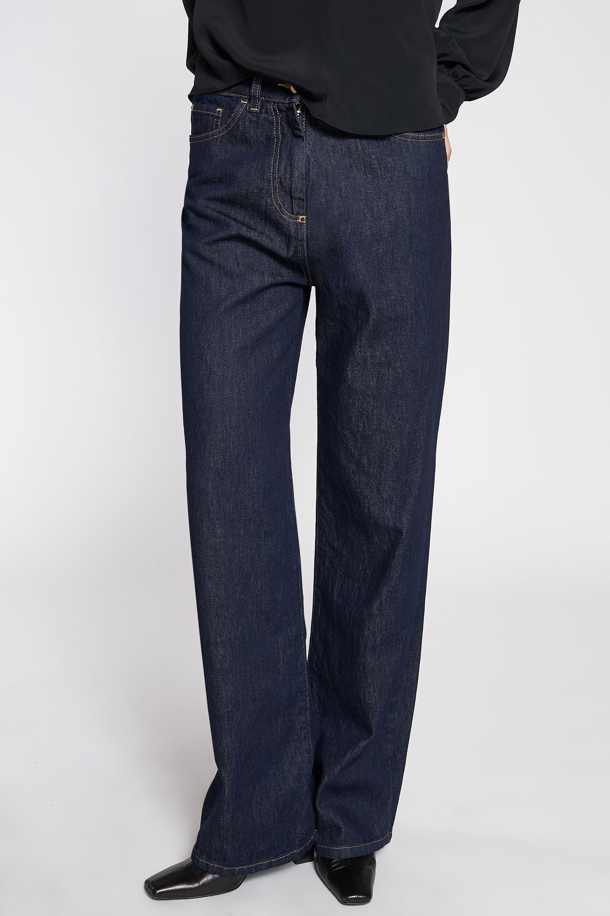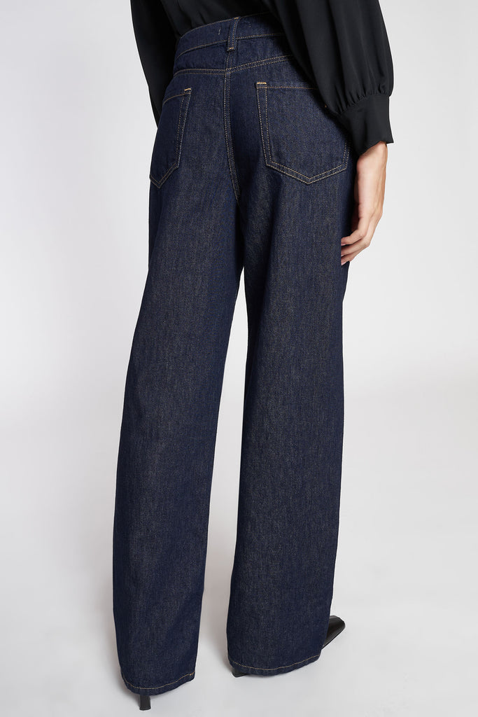 Jeans largo dark blue a vita regolare con imputure in cuoio. Tasche arrotondate sul davanti e die...Learn more