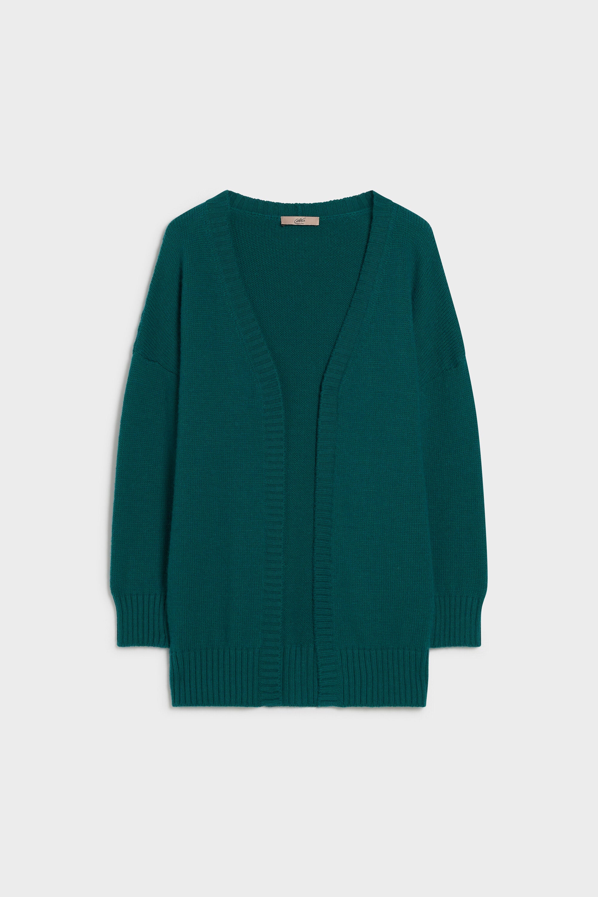 Cardigan in lana grossa, senza allacciatura. Scollo e bordi a coste. Lunghezza sotto i fianchi.