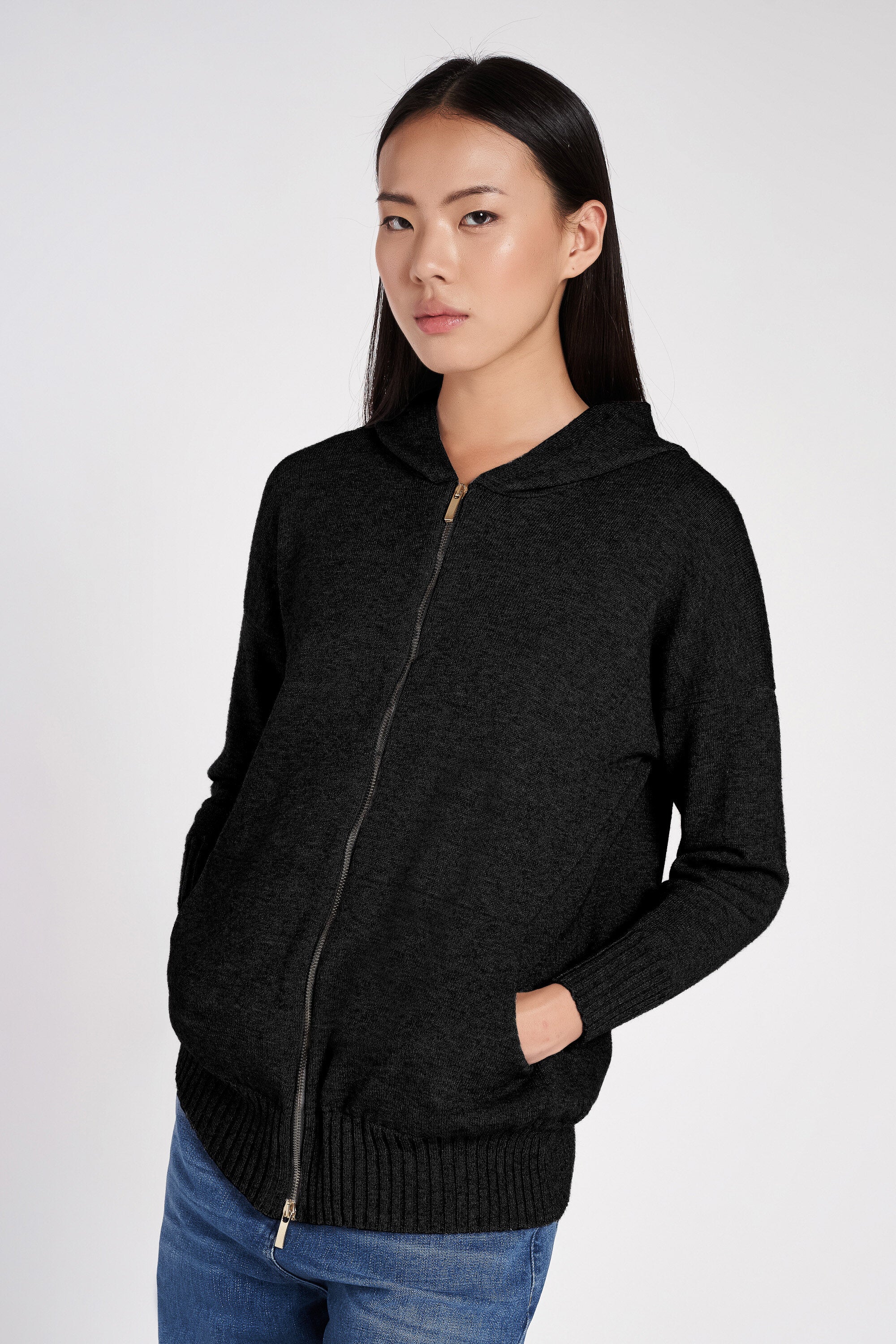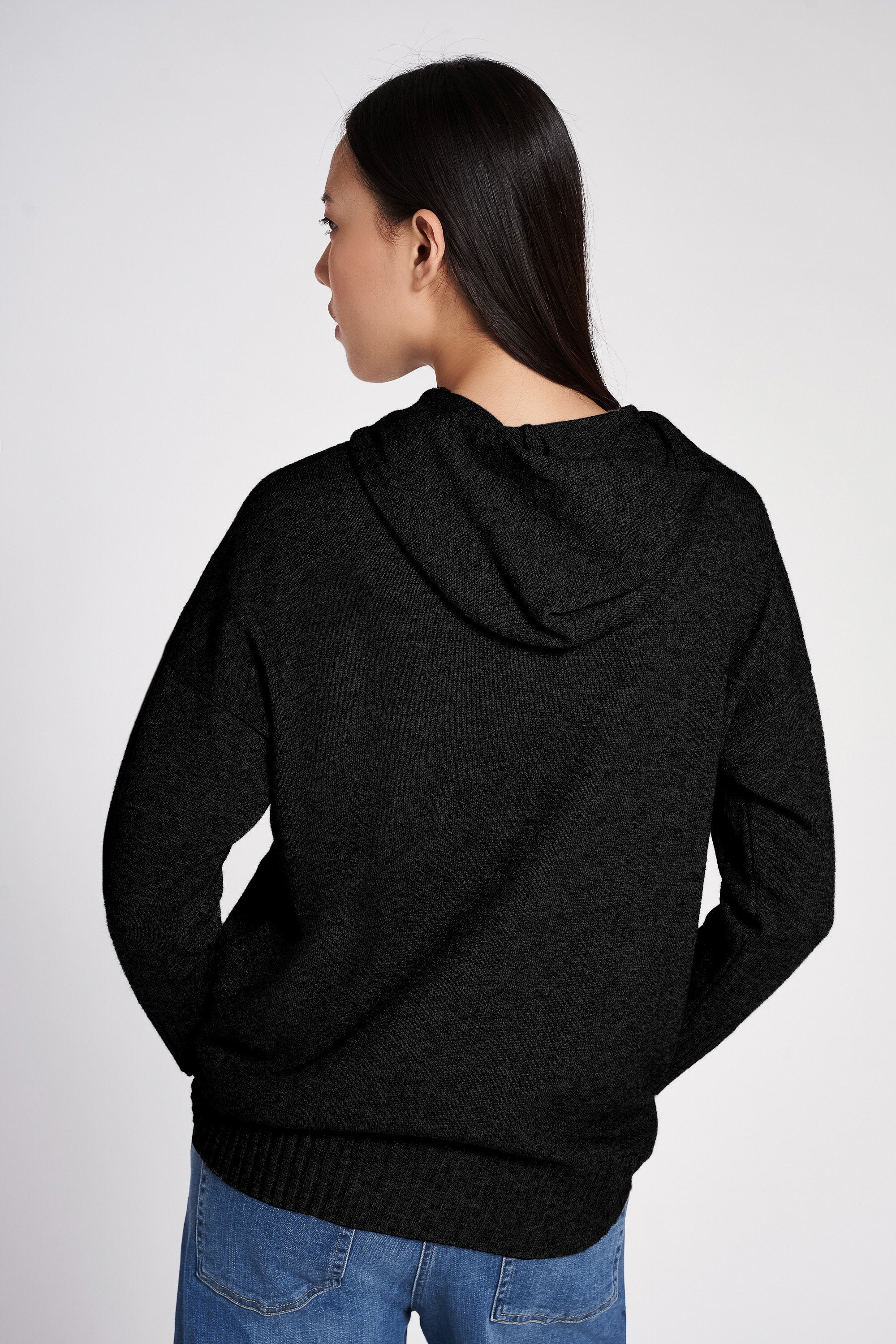 Felpa in viscosa elasticizzata con cappuccio. Fondo e polsini con lavorazione a coste. Linea morbida, lunghezza fianchi.