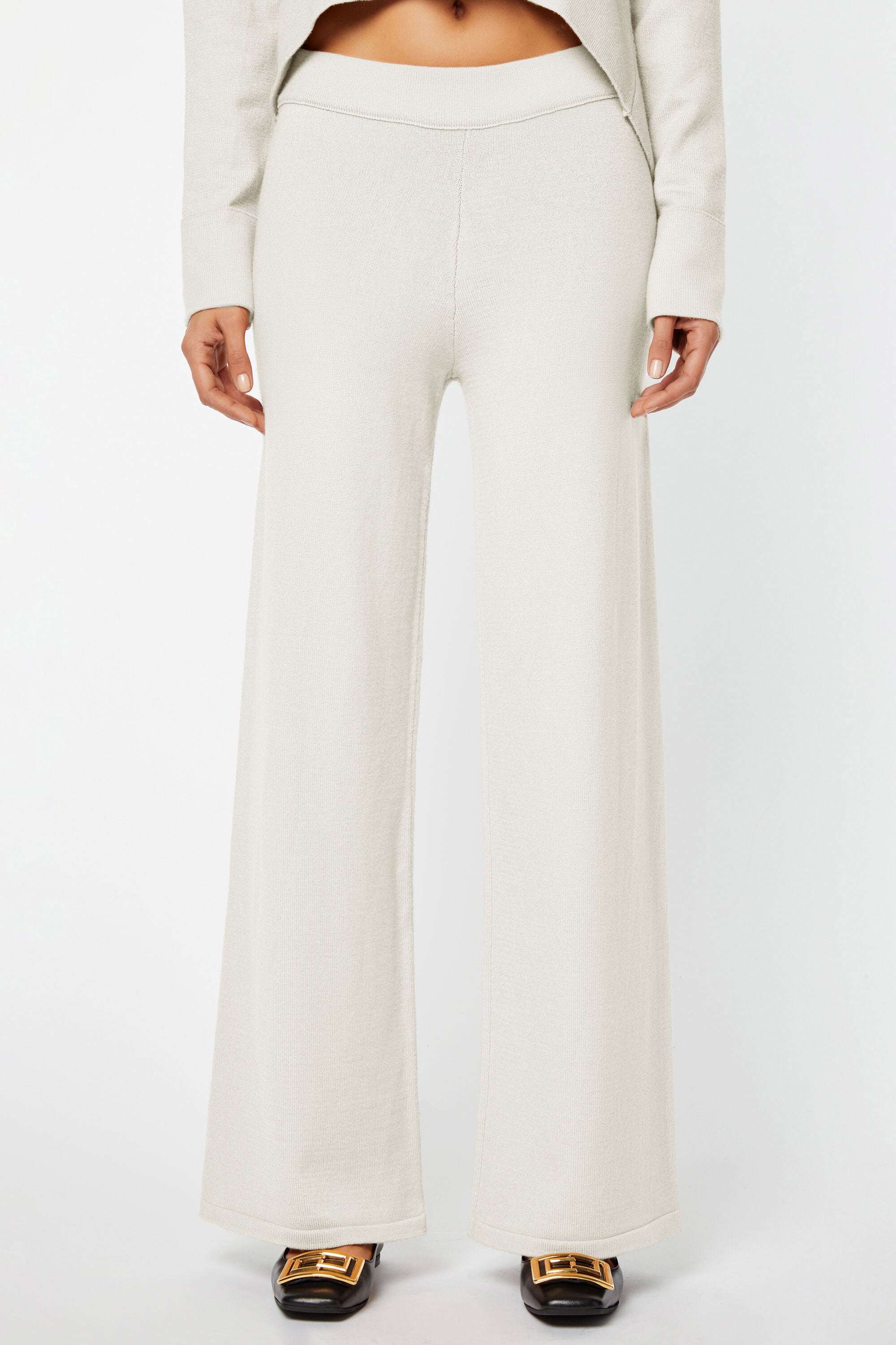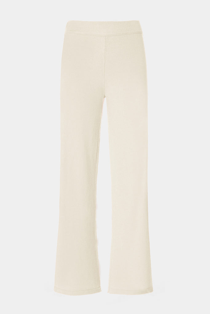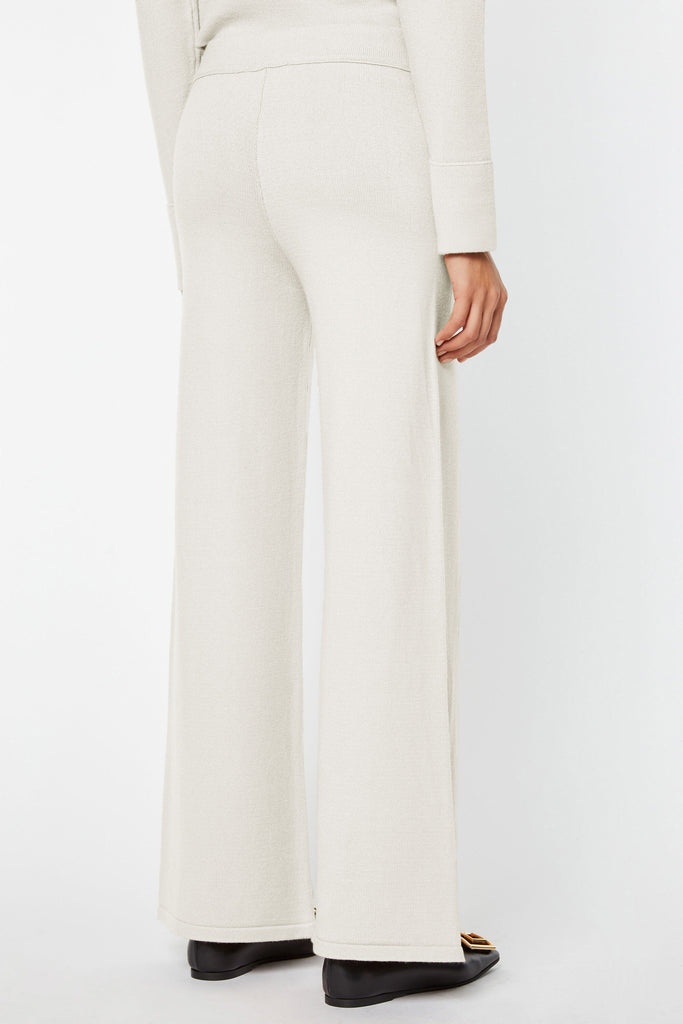 Pantaloni morbidi in maglia elasticizzata, con gamba larga svasata. Vita elasticizzata e cavallo basso.