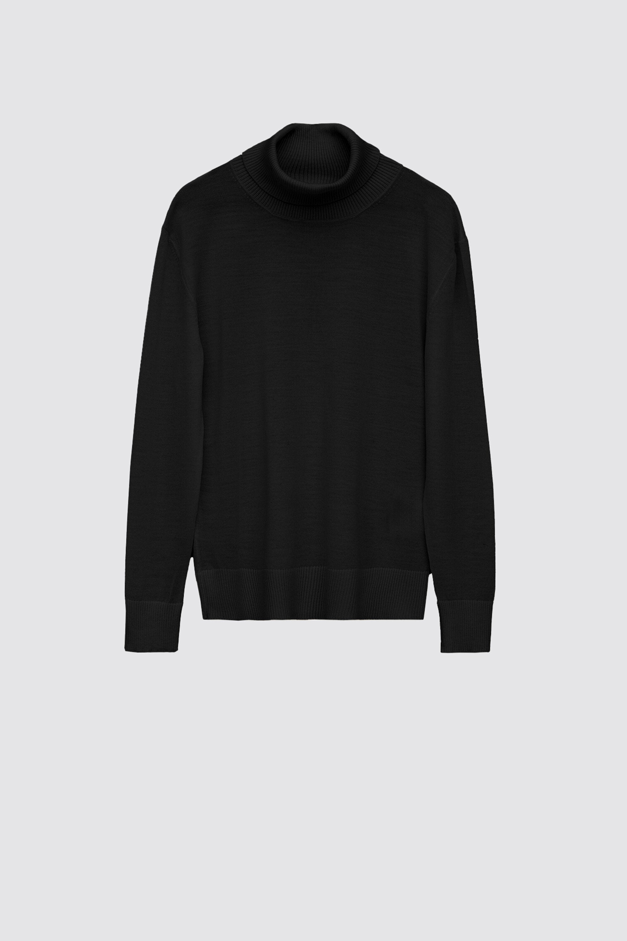 Maglia collo alto in lana merinos. Bordi a coste. Lunghezza fianchi.