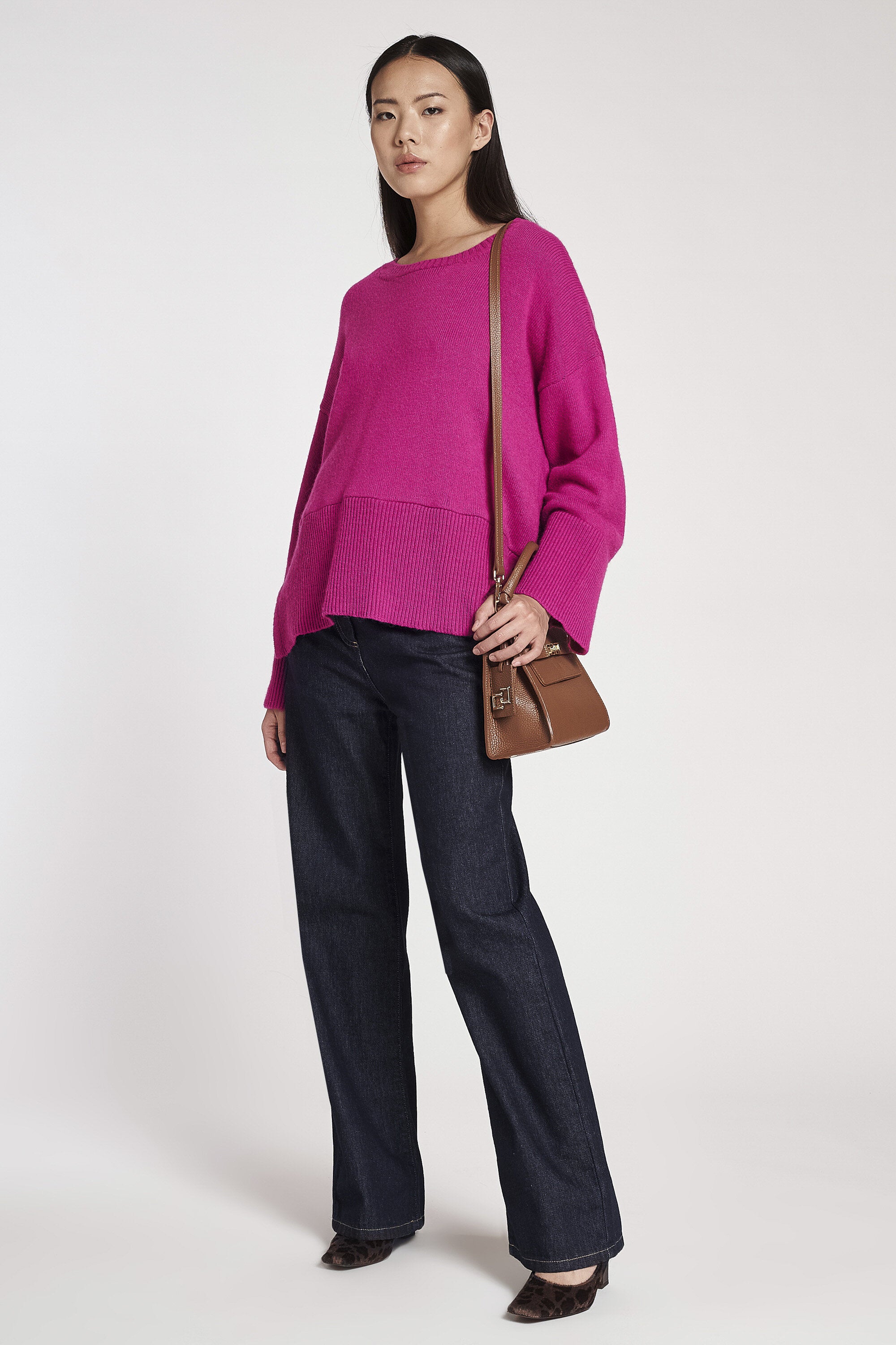 Maglia girocollo in lana grossa a maniche lunghe ampie. Fondo, polsini e scollo con lavorazione a coste. Linea morbida, lunghezza sotto i fianchi.