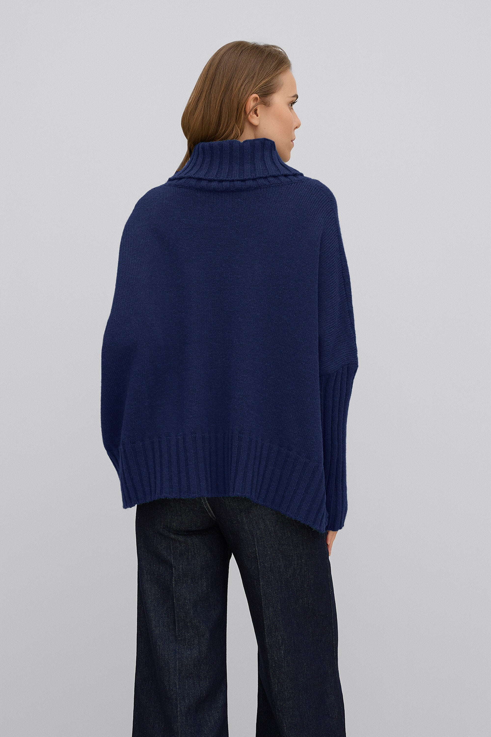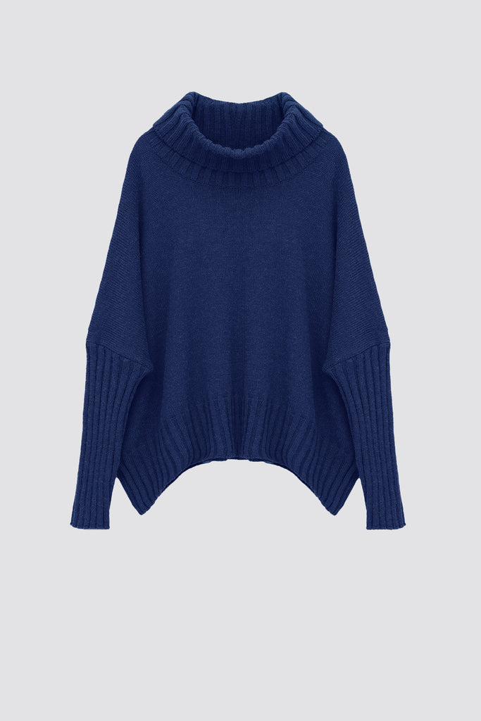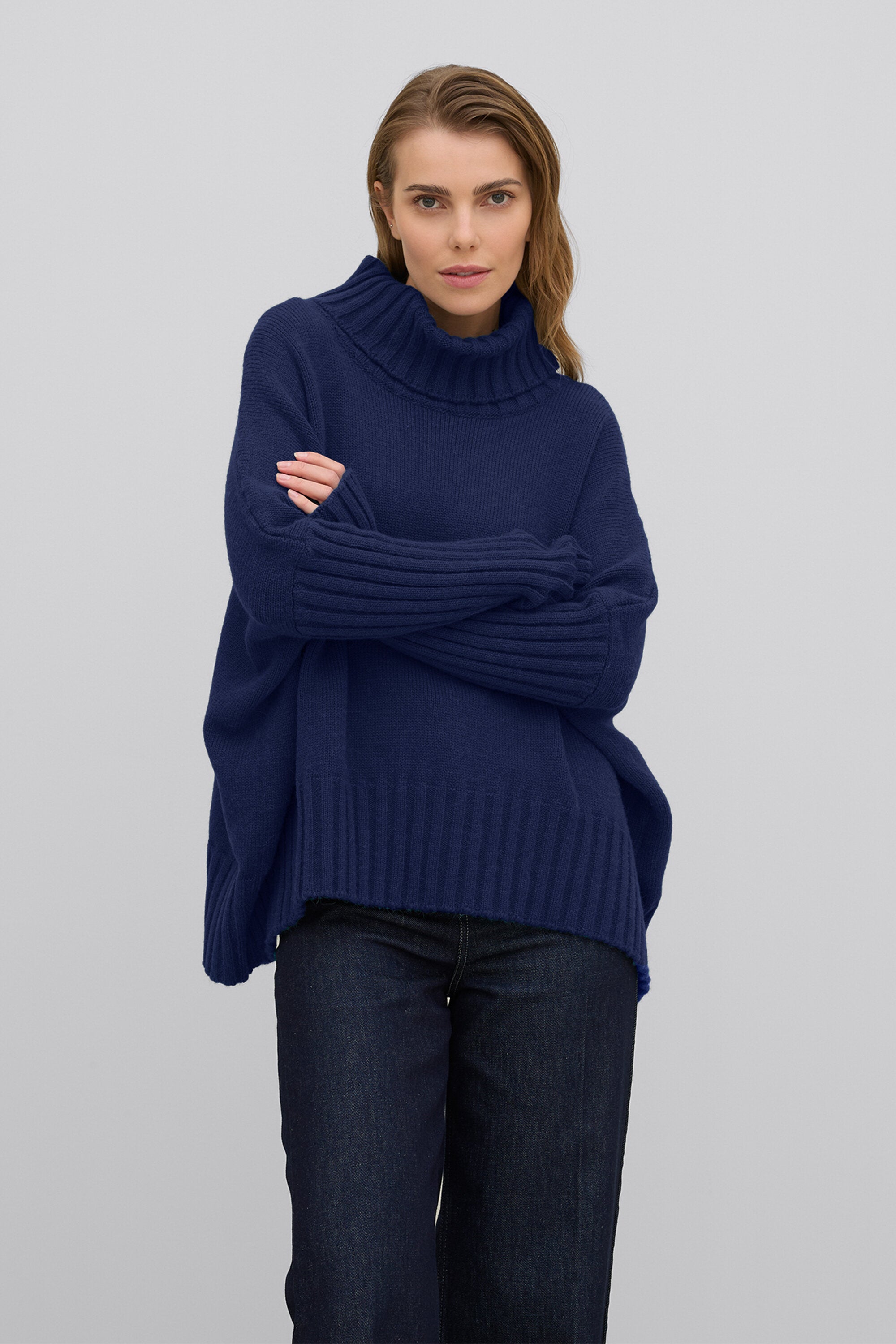 Maglia a collo alto in lana grossa. Maniche e fondo lavorati a coste. Giro manica sceso. Linea ampia. Lunghezza ai fianchi.