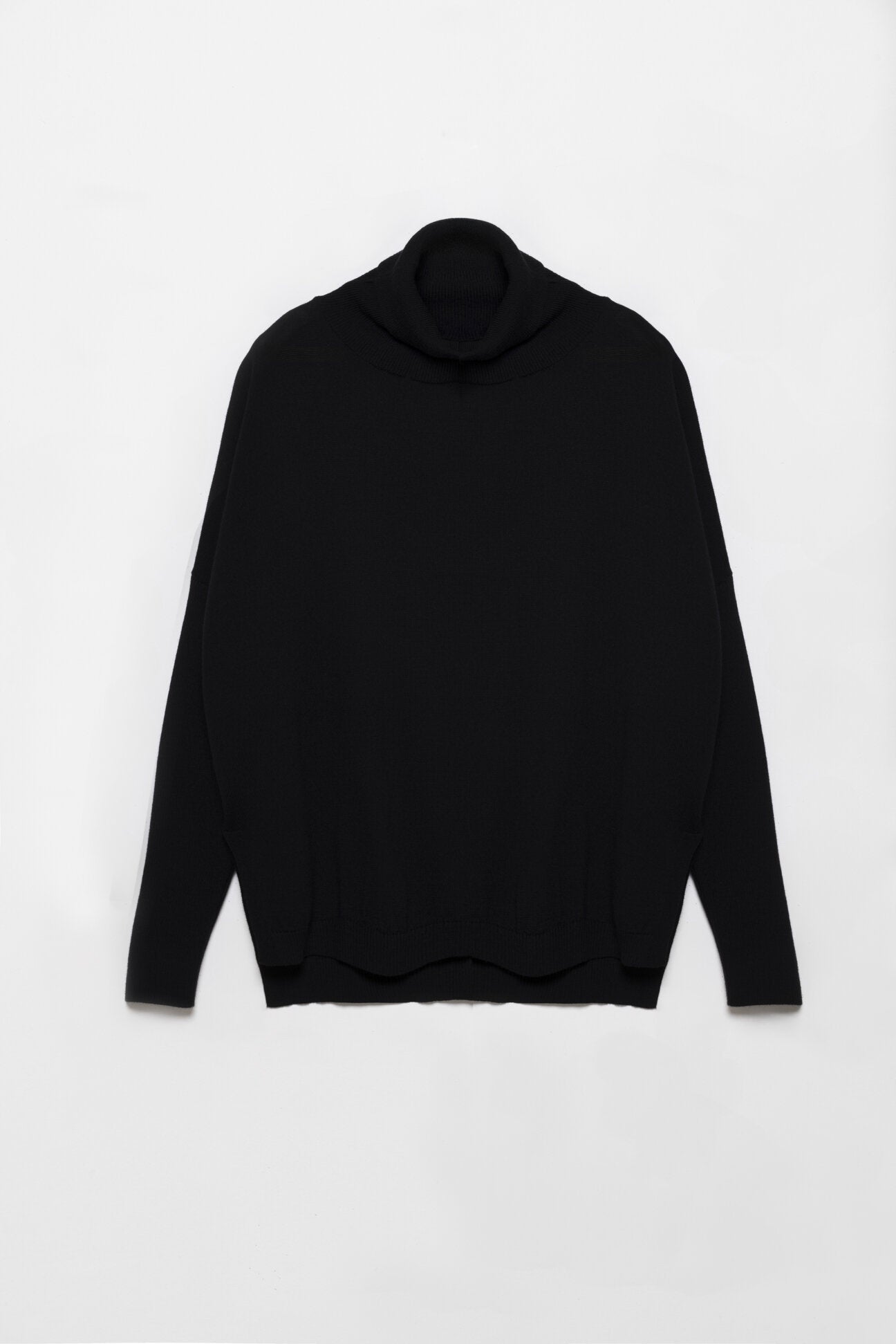 Maglia scollo alto in lana merinos. Bordi a coste. Lunghezza fianchi.