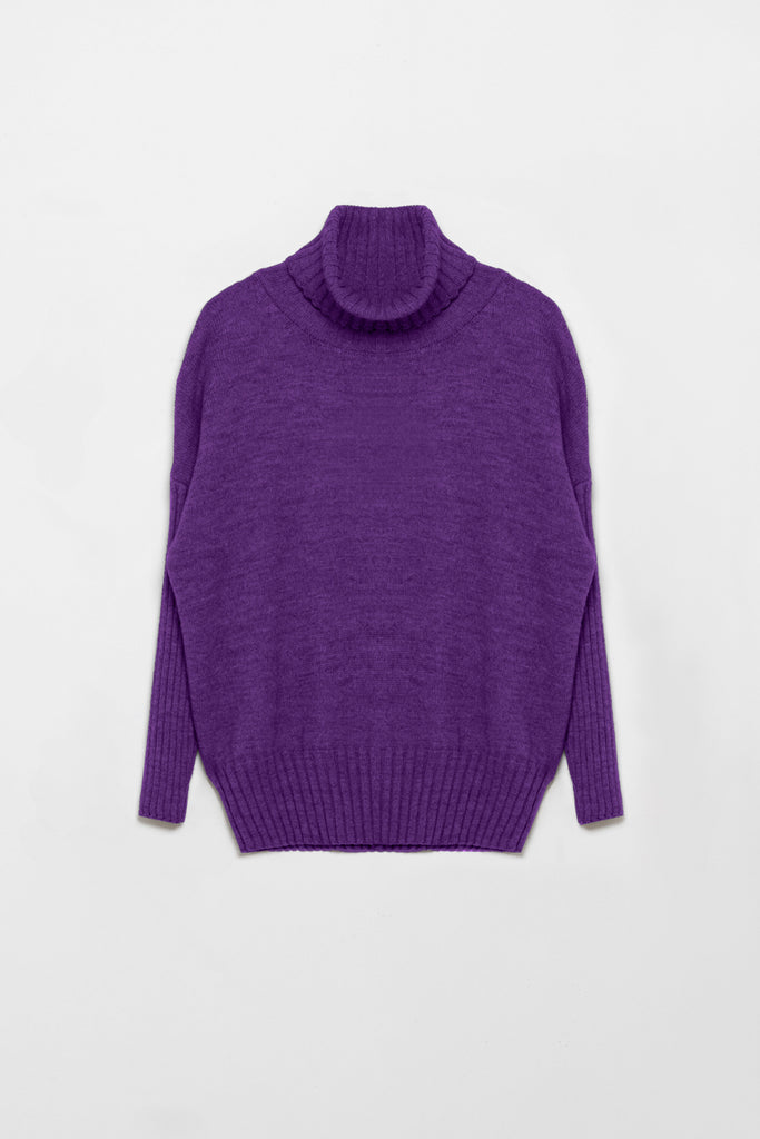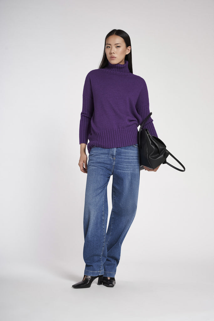 Maglia a collo alto in lana grossa. Maniche e fondo lavorati a coste. Giro manica sceso. Lunghezza ai fianchi.