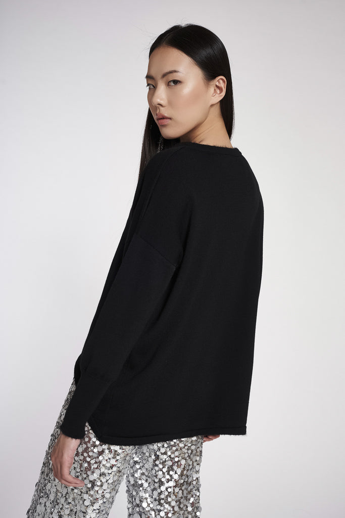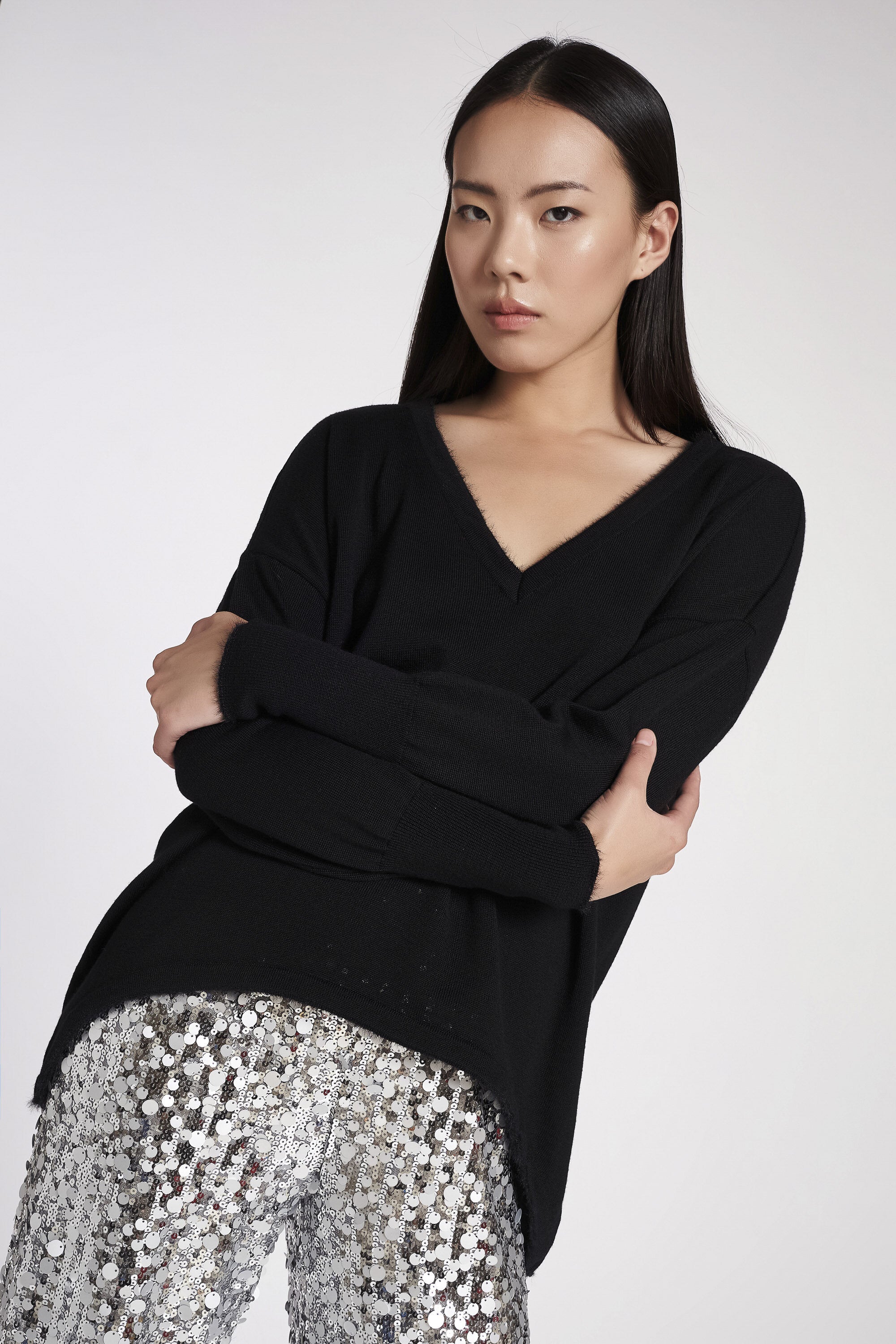 Maglia asimmetrica a maniche lunghe con scollo a V in lana merinos. Profili pelosi. Polsini con lavorazione a coste. Linea morbida, lunghezza sotto i fianchi.