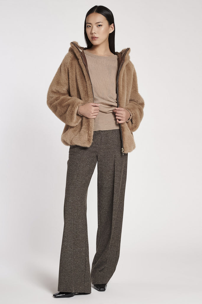 Maglia maniche lunghe con drappeggio nel fondo in lana merinos. Fondo, scollo e polsini lavorati a coste. Linea morbida, lunghezza fianchi