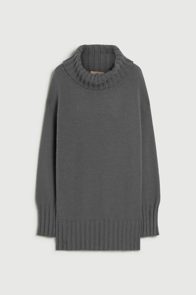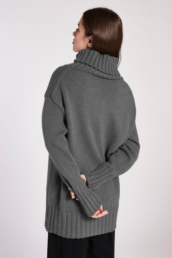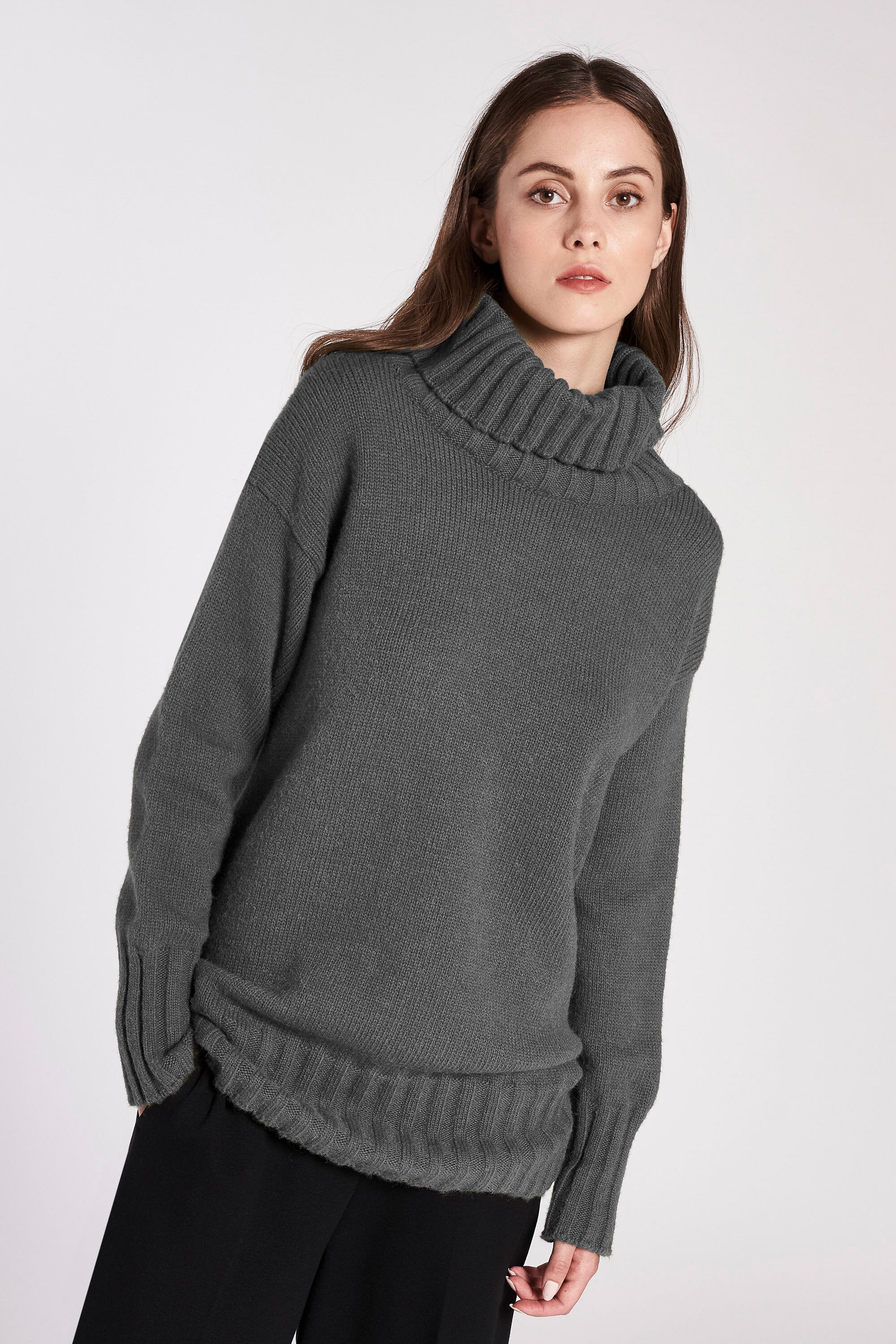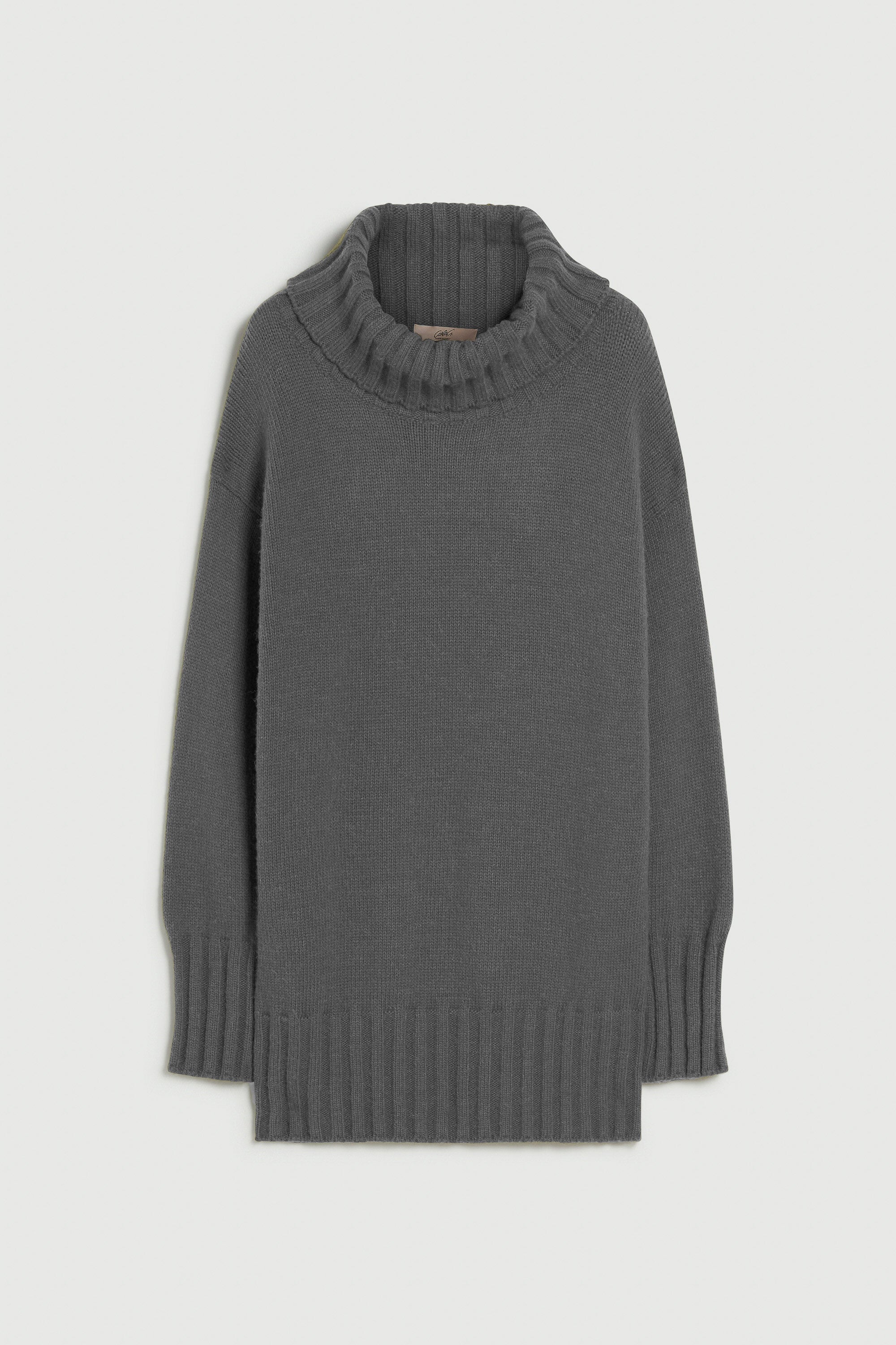 Maglia a collo alto in lana grossa. Bordi a coste. Lunghezza sotto i fianchi.
