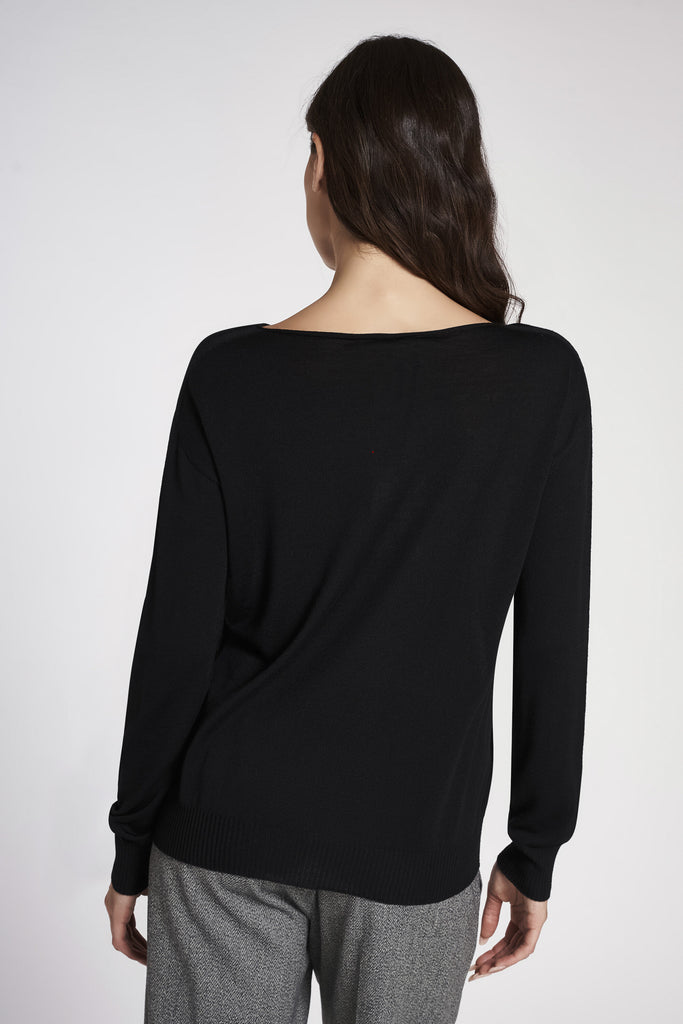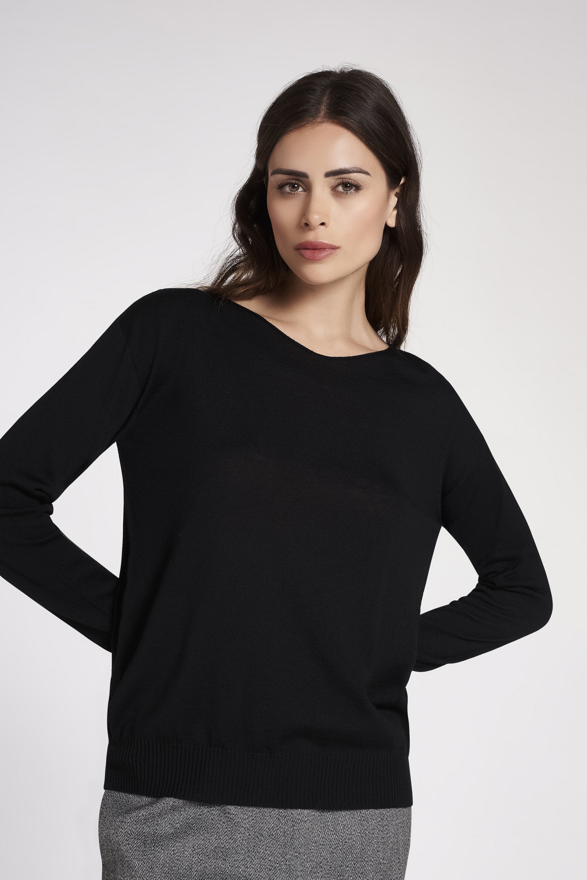 Maglia scollo a barchetta in lana merinos a maniche lunghe. Fondo e polsini con lavorazione a coste. Linea morbida, lunghezza fianchi.