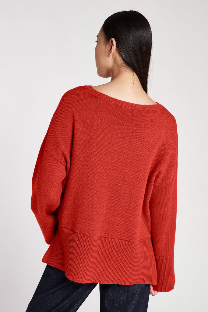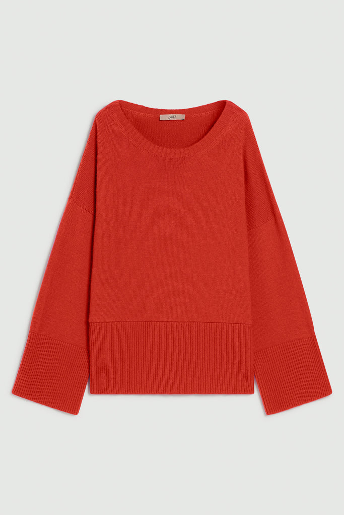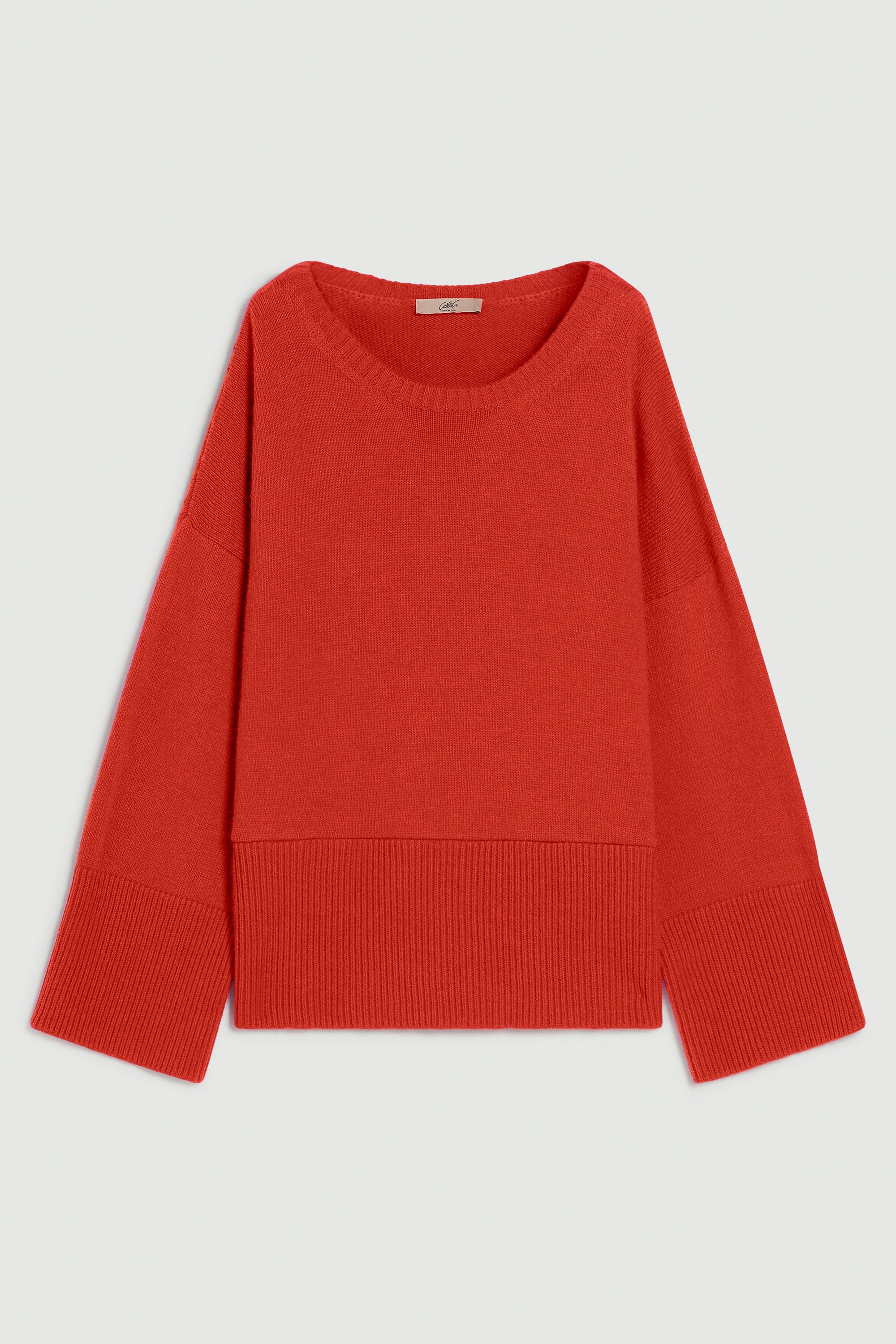 Maglia girocollo in lana grossa a maniche lunghe ampie. Fondo, polsini e scollo con lavorazione a coste. Linea morbida, lunghezza sotto i fianchi.