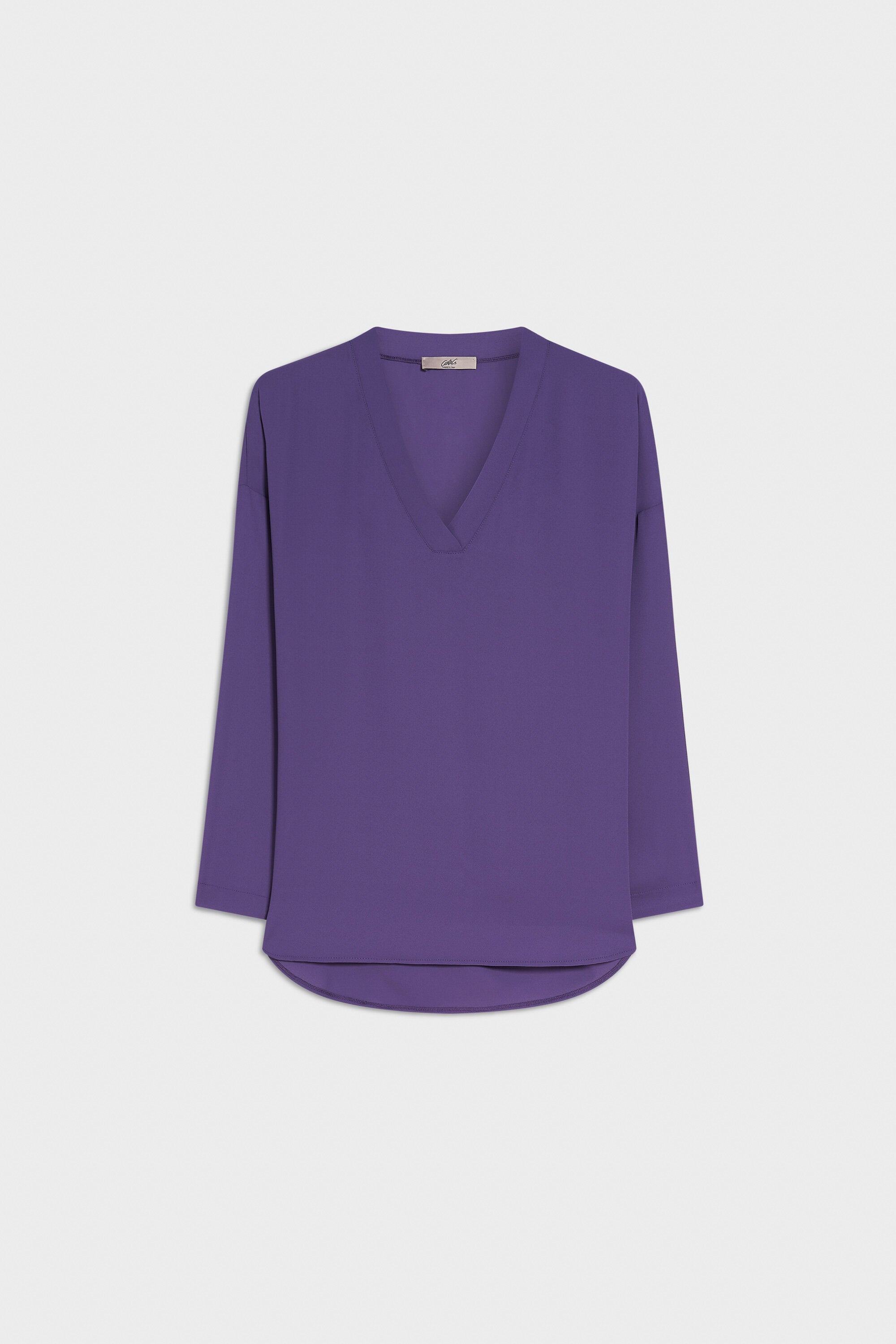 Maglia in crepe a maniche lunghe. Scollo a V davanti. Fondo davanti più corto e spacchetti laterali. Lunghezza sotto i fianchi.