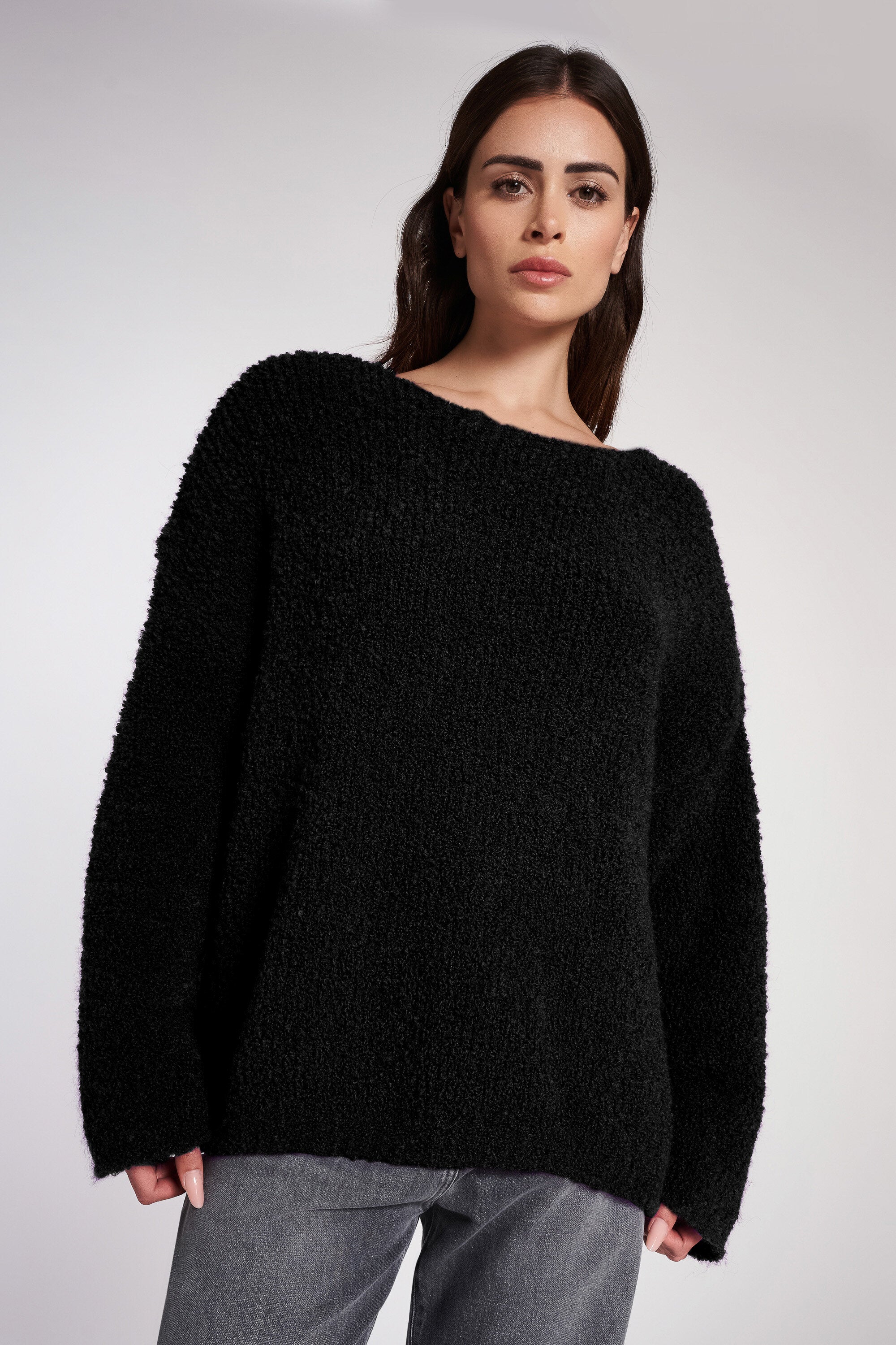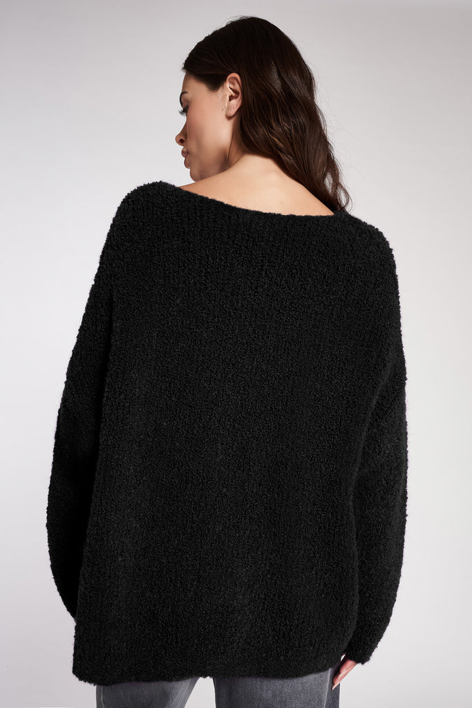Maglia in bouclè con scollo rotondo. Giromanica sceso. Fondo a coste. Lunghezza ai fianchi.