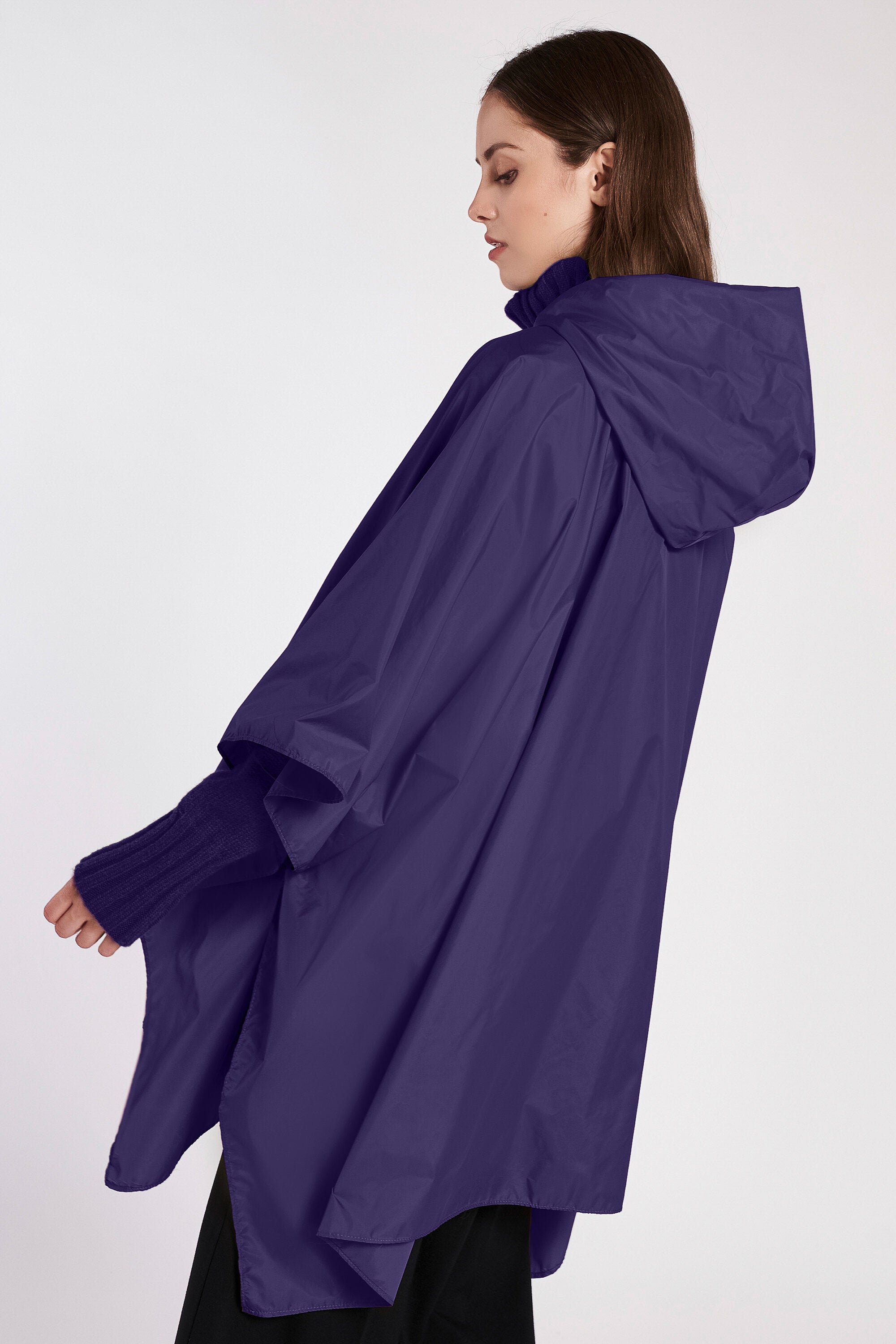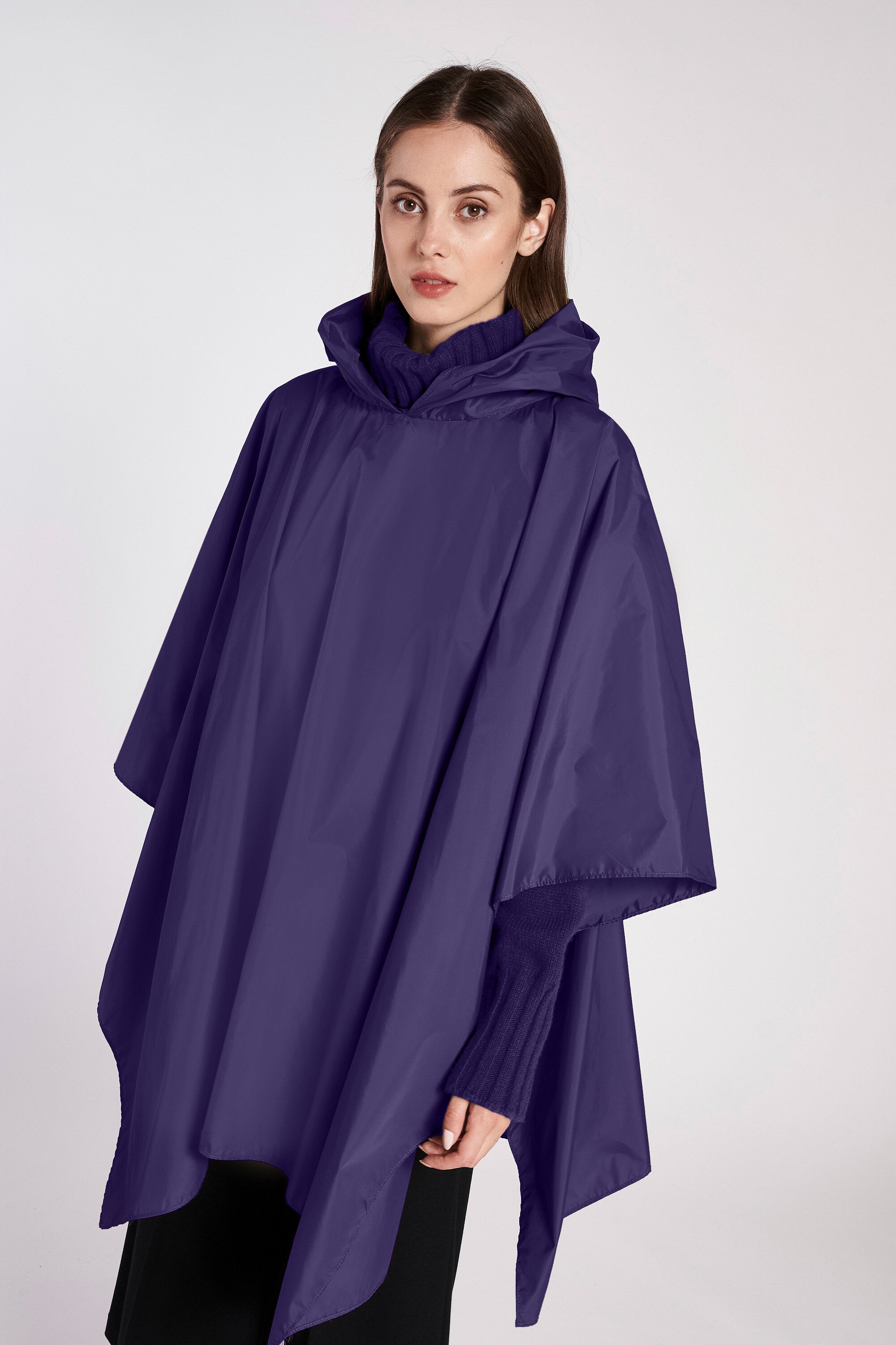 Poncho impermeabile e ripieghevole in nylon con cappuccio e bottoni automatici in metallo.