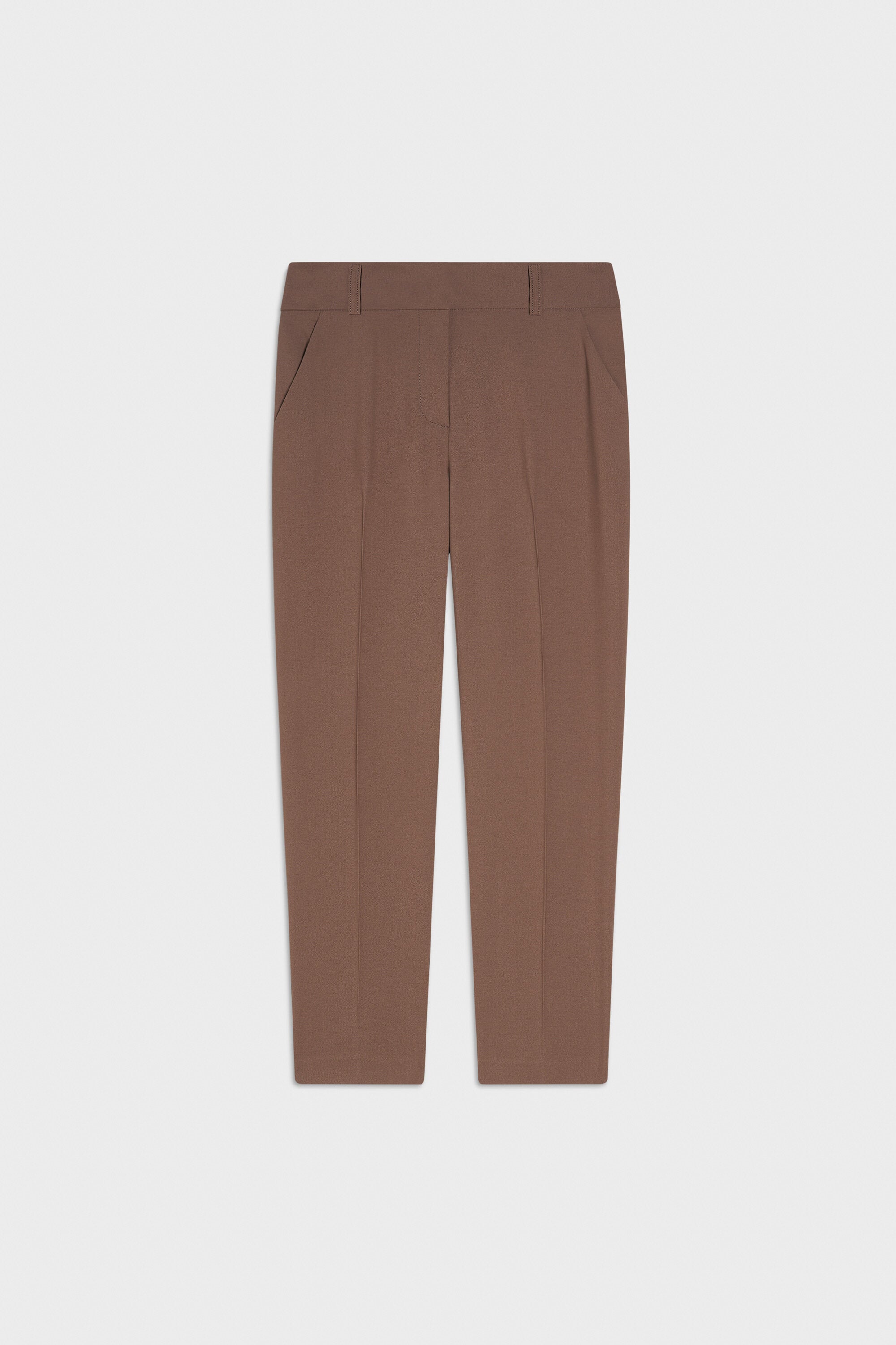 Pantaloni ampi in crepe elasticizzato con vita regolare e cavallo basso. Vita davanti con passanti e finta apertura, fascione dietro con elastico. Entrata tasche laterali e piega stirata.