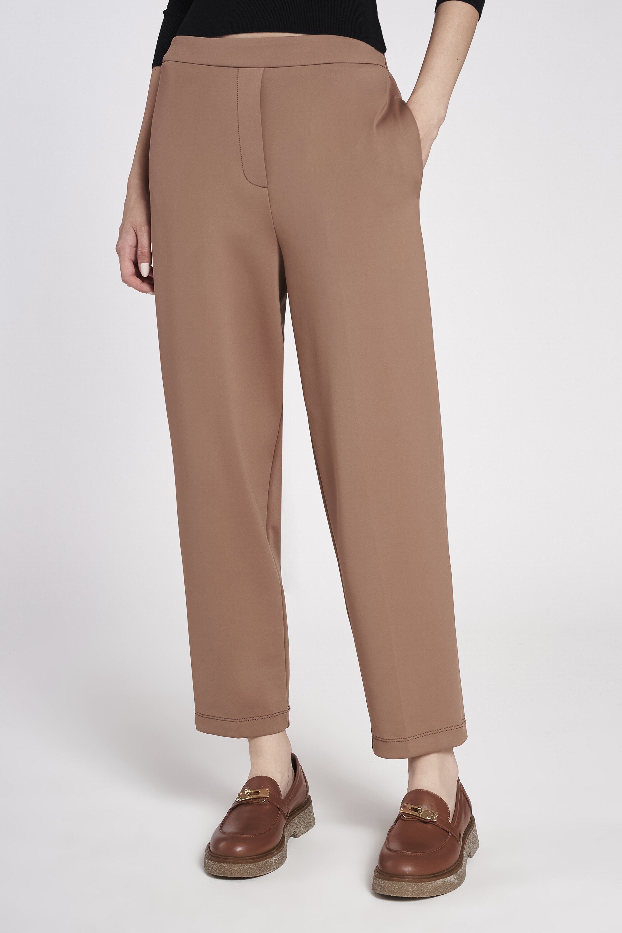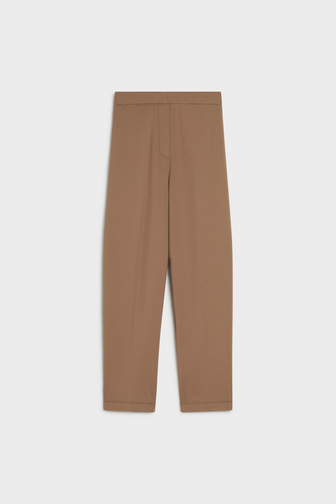 Pantaloni ampi in jersey tecnico con vita regolare e cavallo basso. Vita davanti con finta apertura ed elastico sul retro. Entrata tasca laterale e piega stirata.