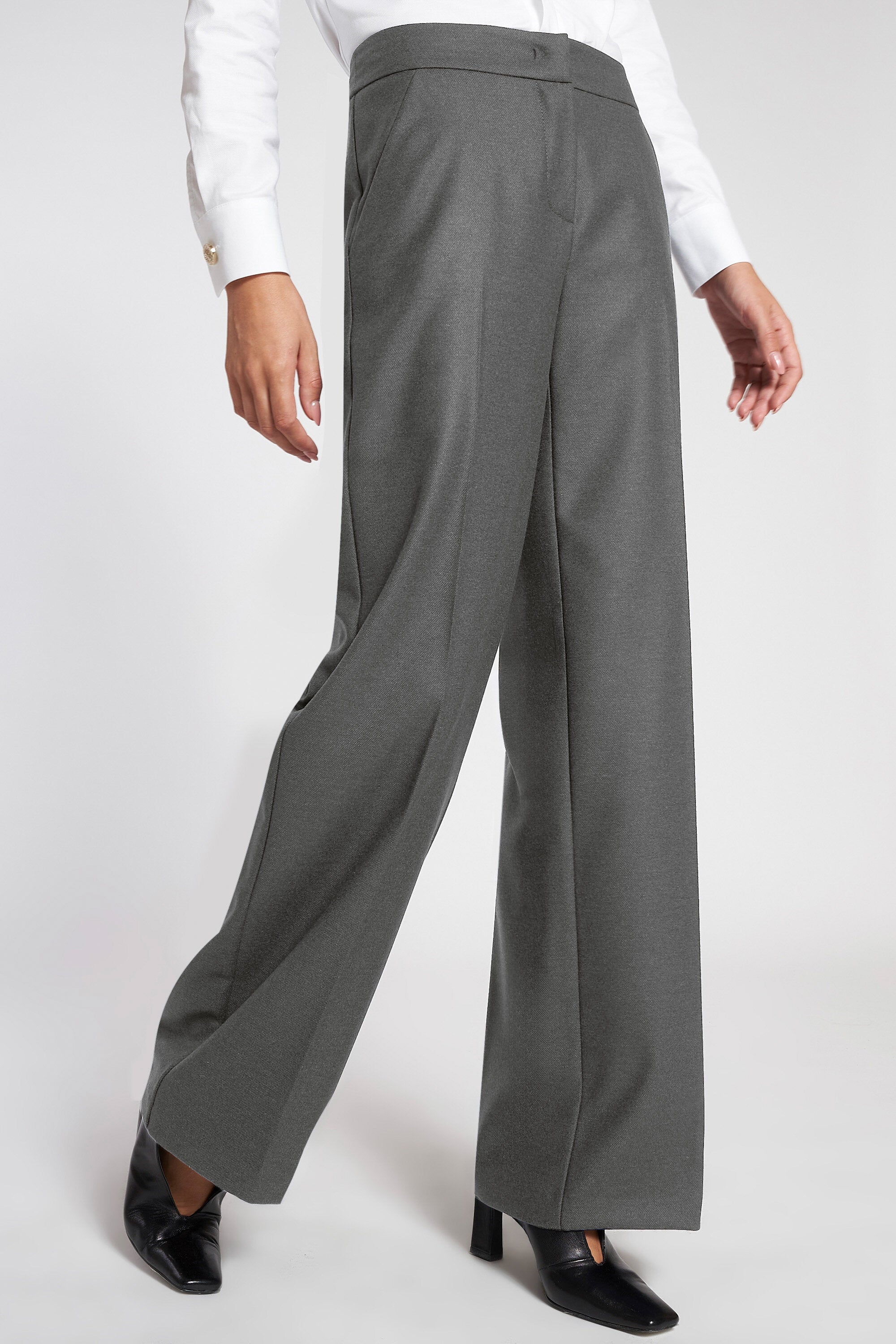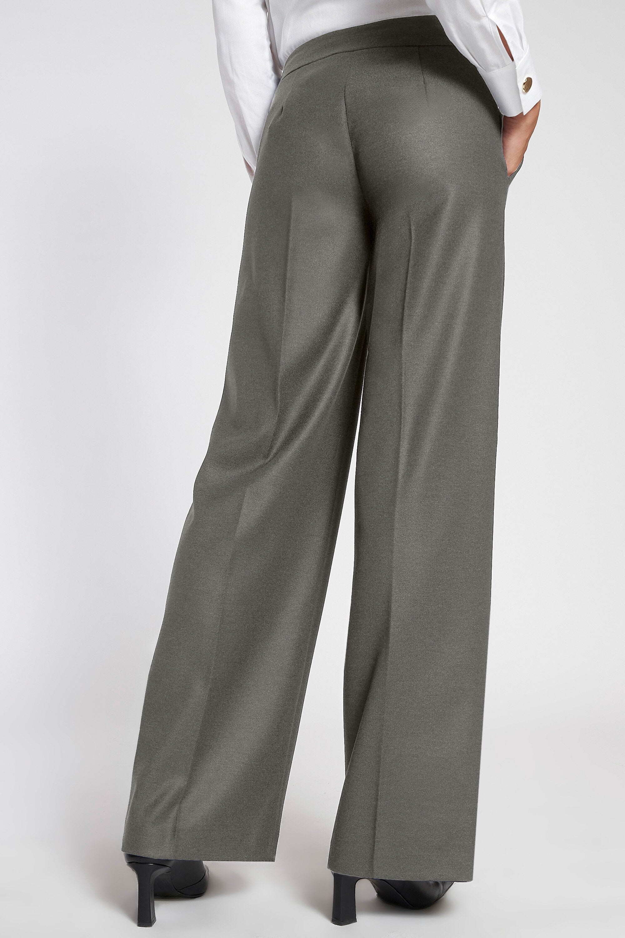 PantalonI larghi in flanella elasticizzata con vita regolare. Chiusura invisibile con lampo nascosta e gancetto di metallo interno. Tasche alla francese e piega stirata.