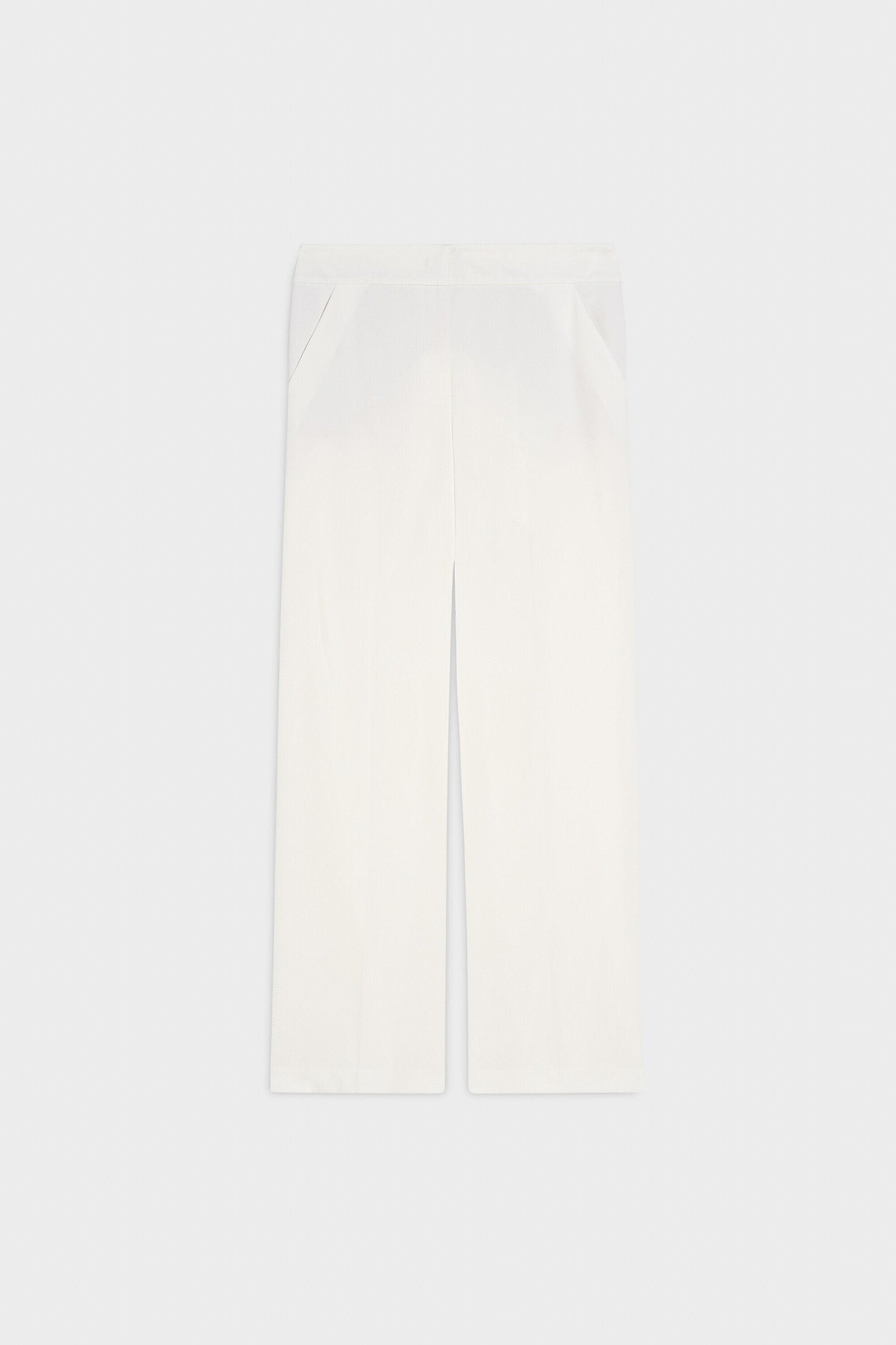 Pantaloni larghi in gabardina elasticizzata con vita regolare. Chiusura invisibile con lampo nascosta e gancetto di metallo interno. Tasche alla francese e piega stirata.