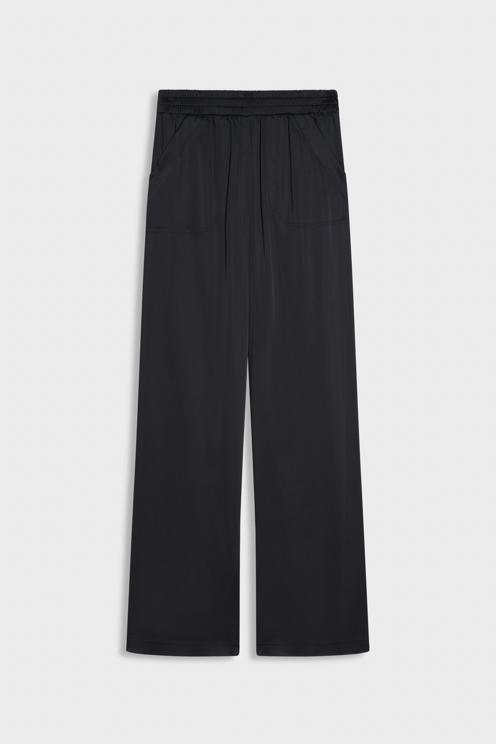 Pantaloni lunghi wide leg in raso elasticizzato. Vita bassa elasticizzata e cavallo basso. Gamba dalla linea dritta ed ampia. Tasche alla francese.