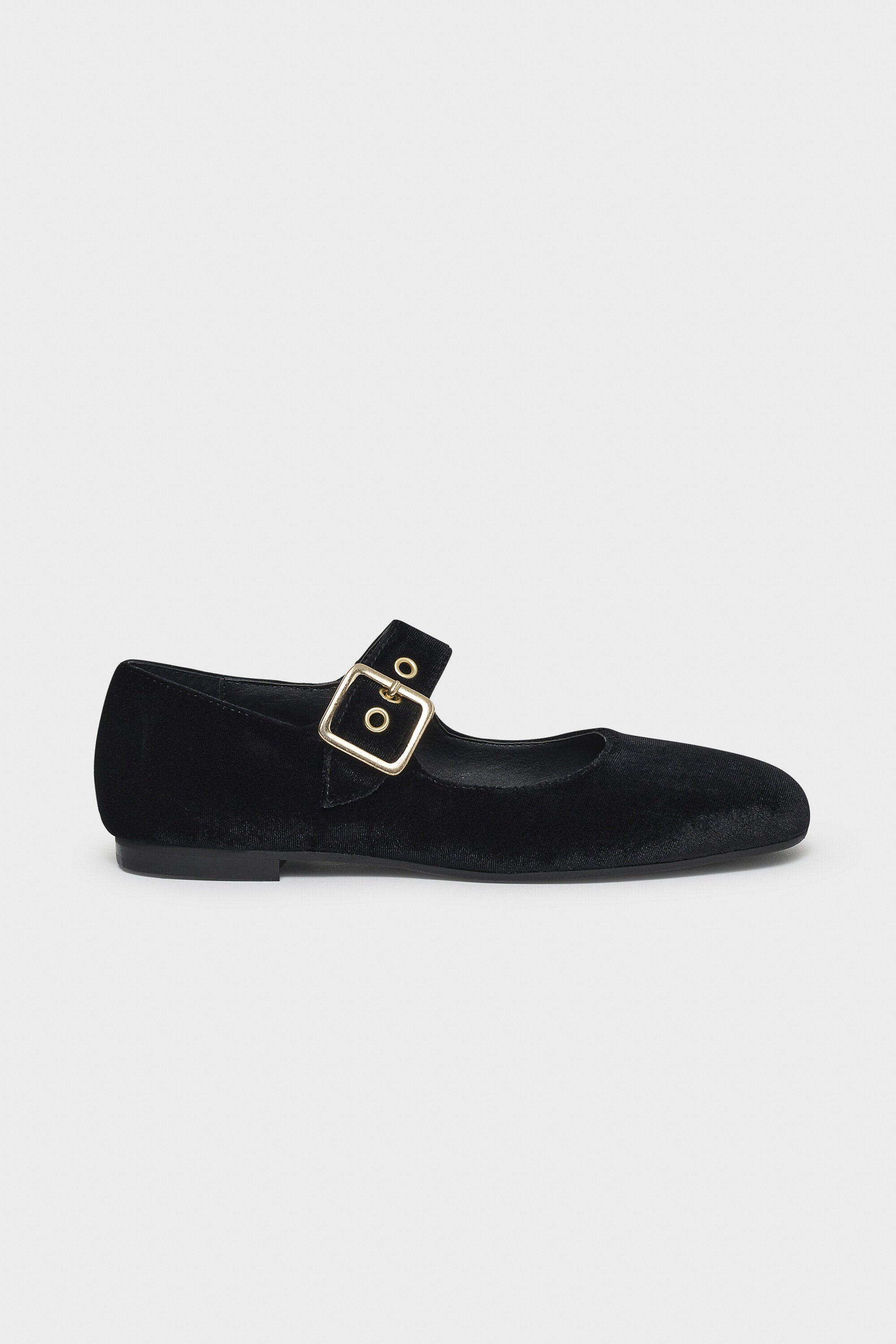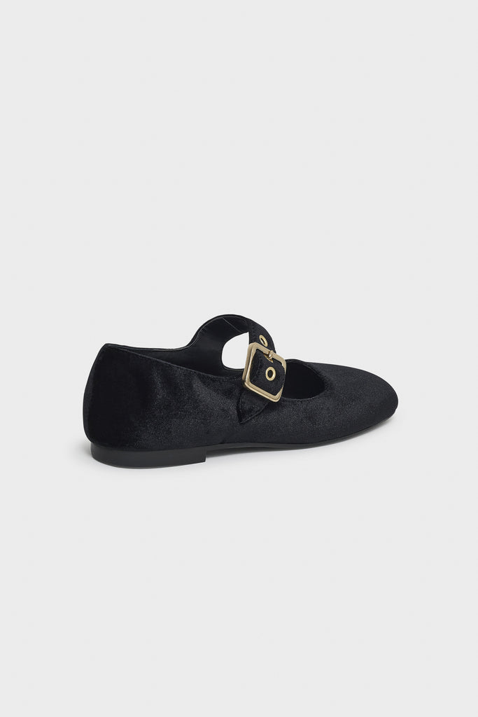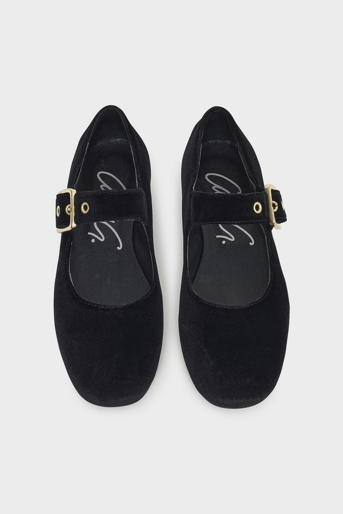 Ballerine realizzate in velluto con punta tonda e chiusura tramite cinturino con fibbia. Suola in gomma.