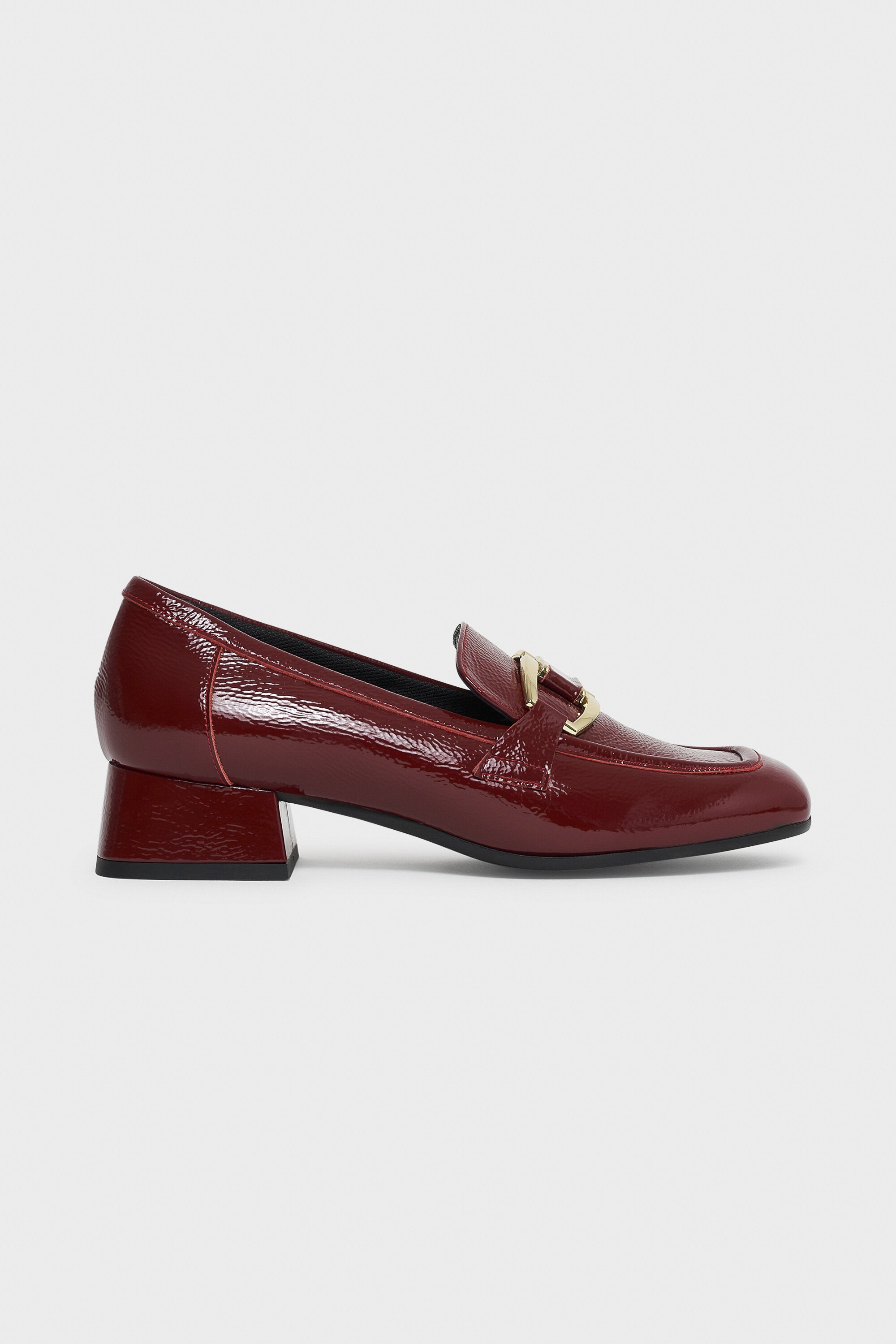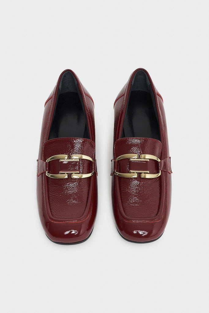 Mocassini realizzati in vernice, con dettaglio di fibbia sul davanti, punta e tacco squadrati.
