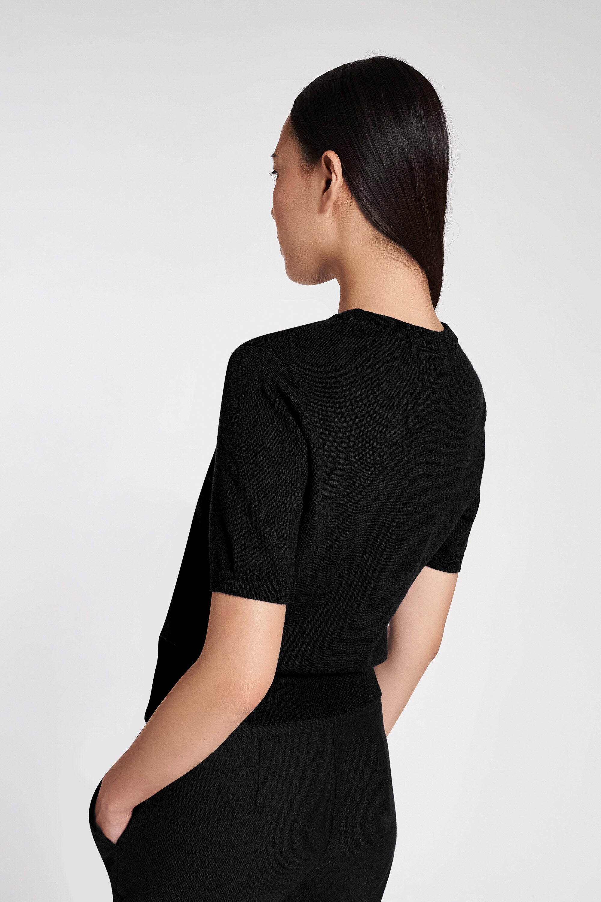 Maglia maniche corte aderente in lana merinos. Bordi a coste. Lunghezza sopra i fianchi.