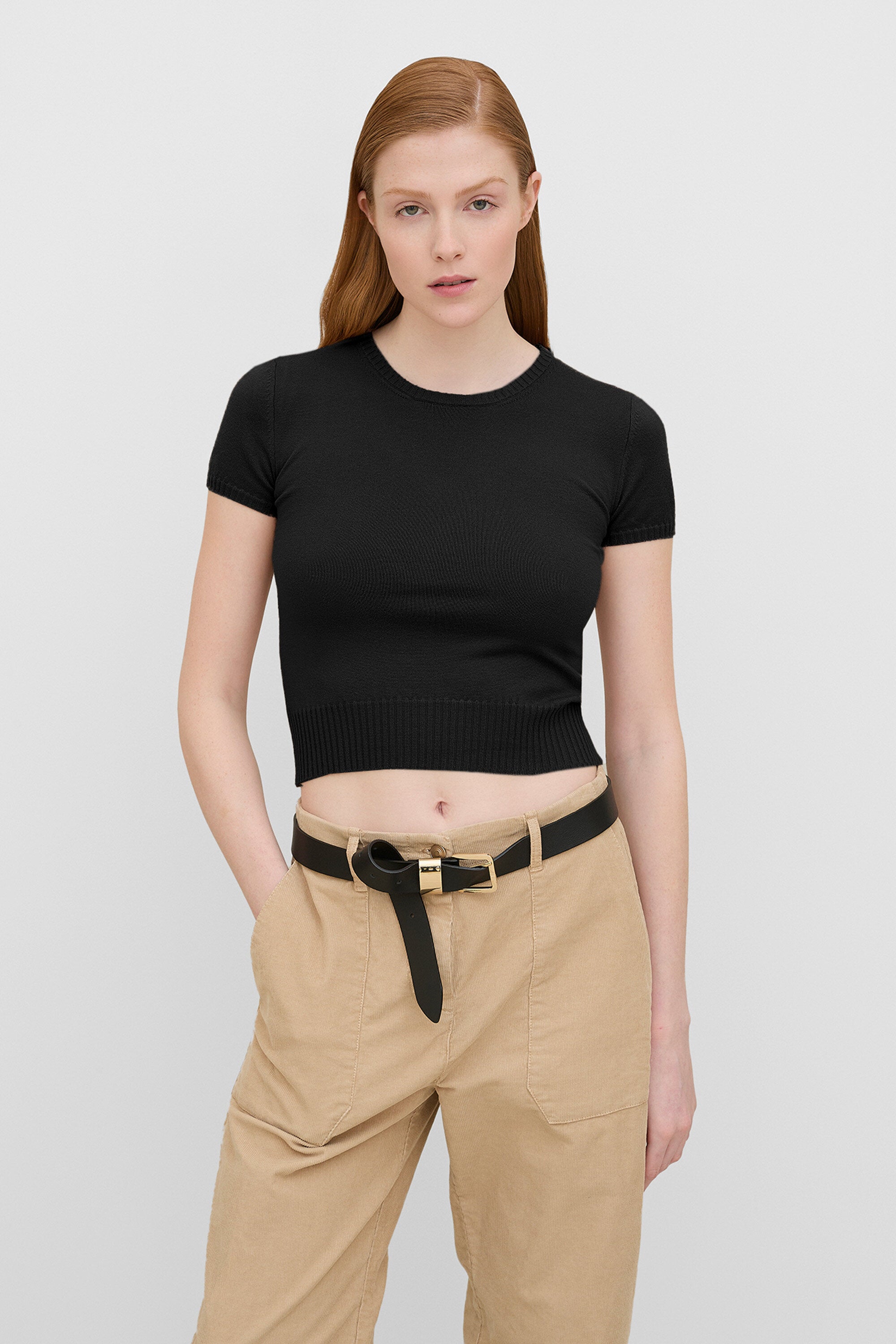 Maglia a maniche corte in viscosa elasticizzatA. Polsini e bordi a coste. Linea aderente. Lunghezza sopra ai fianchi.