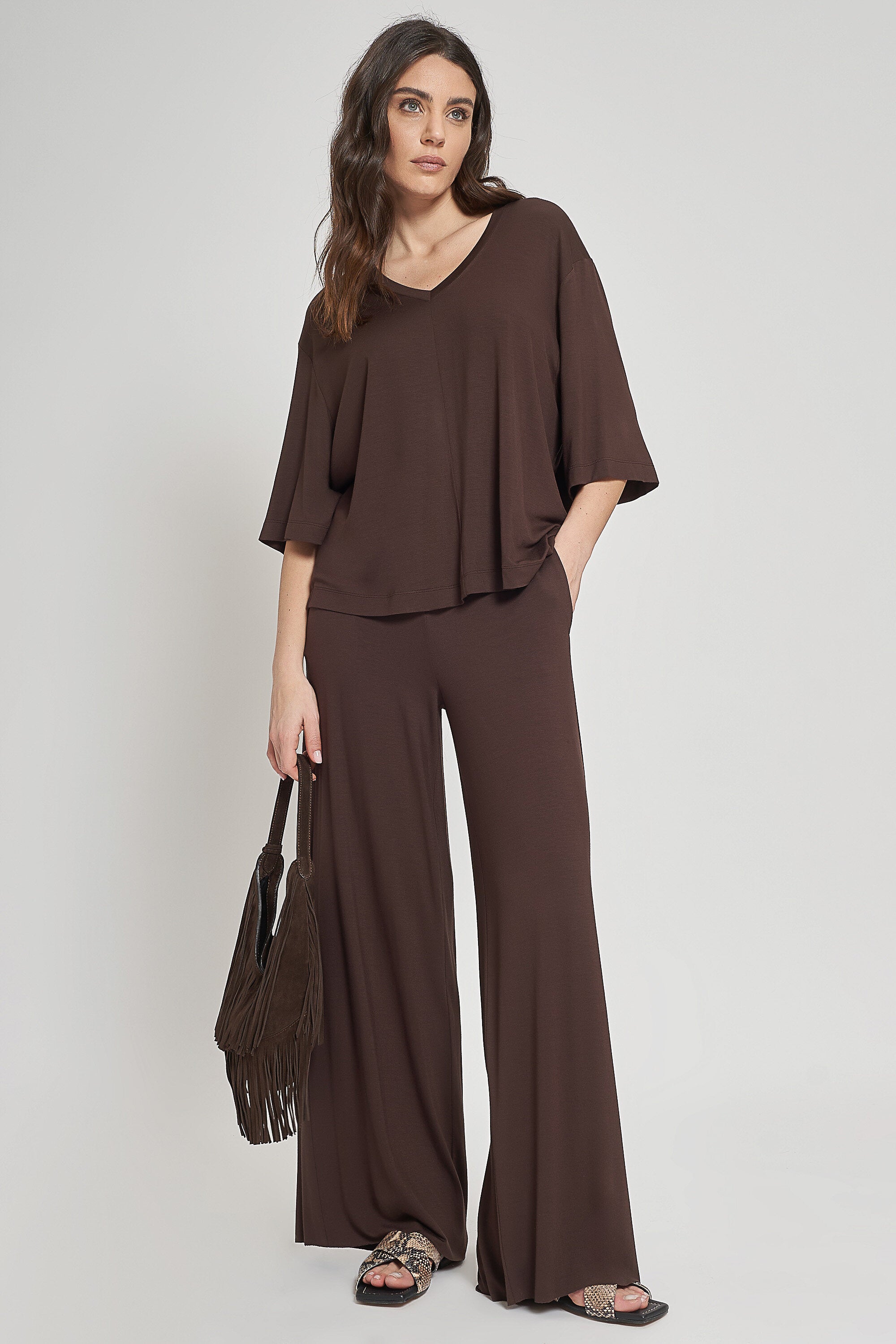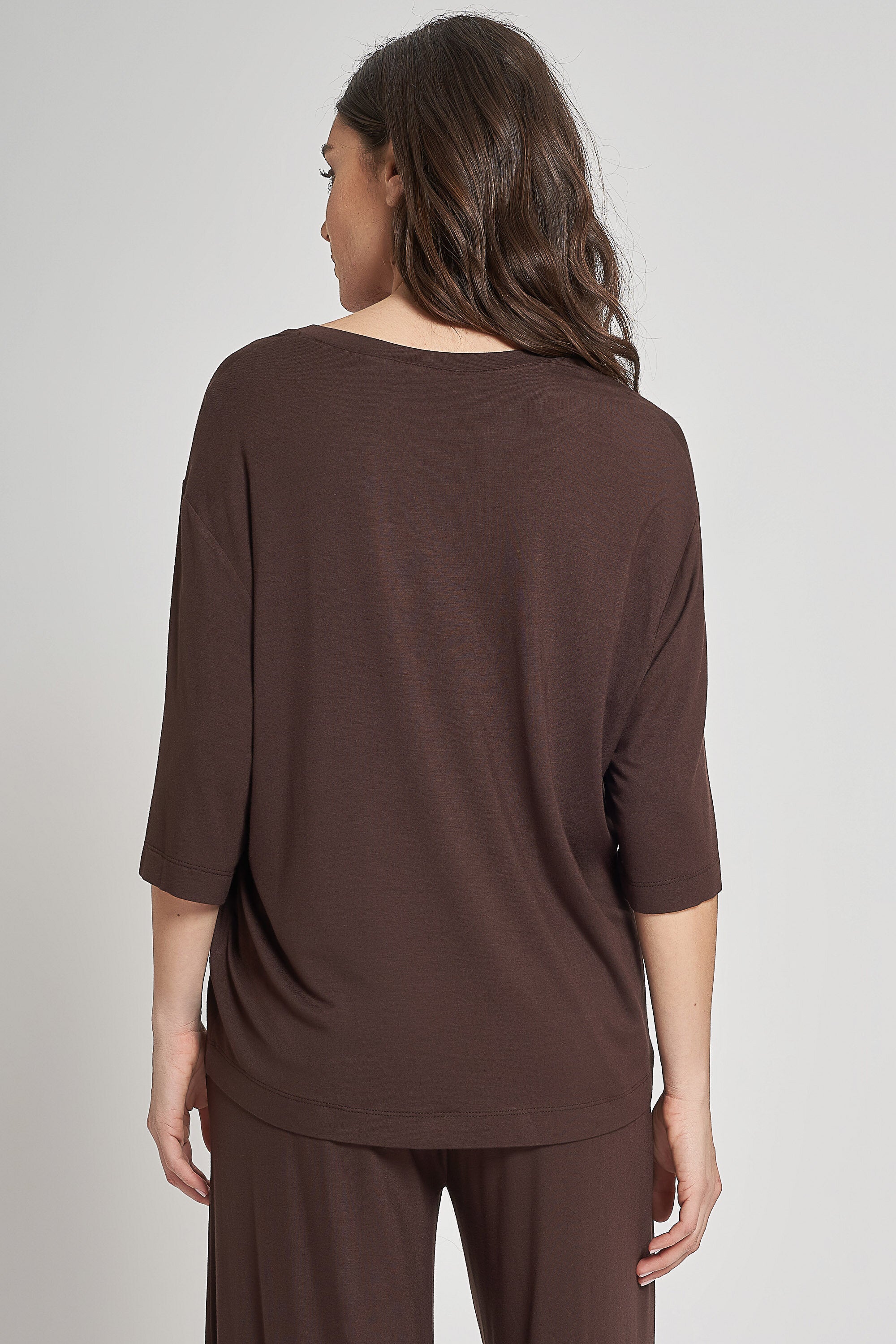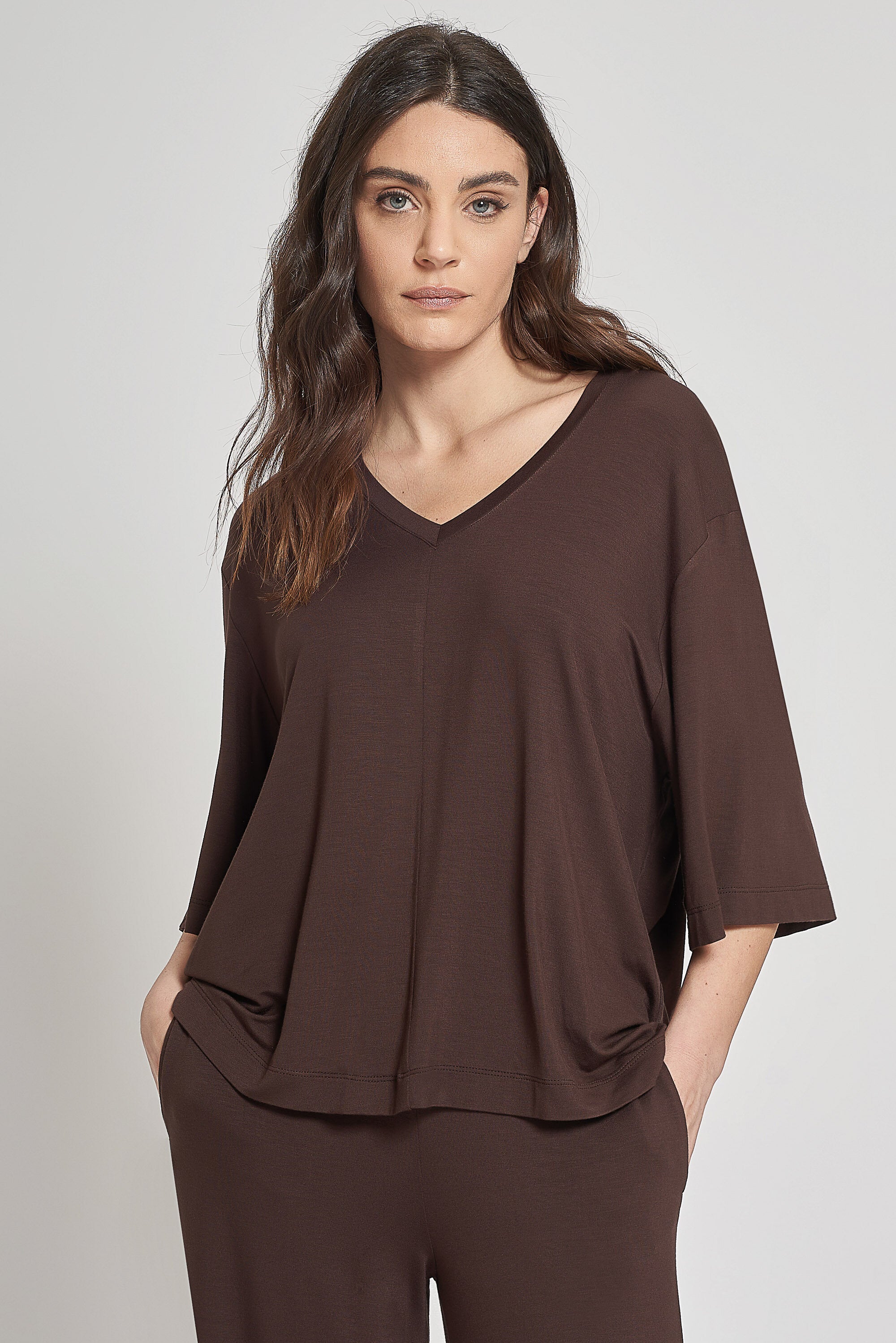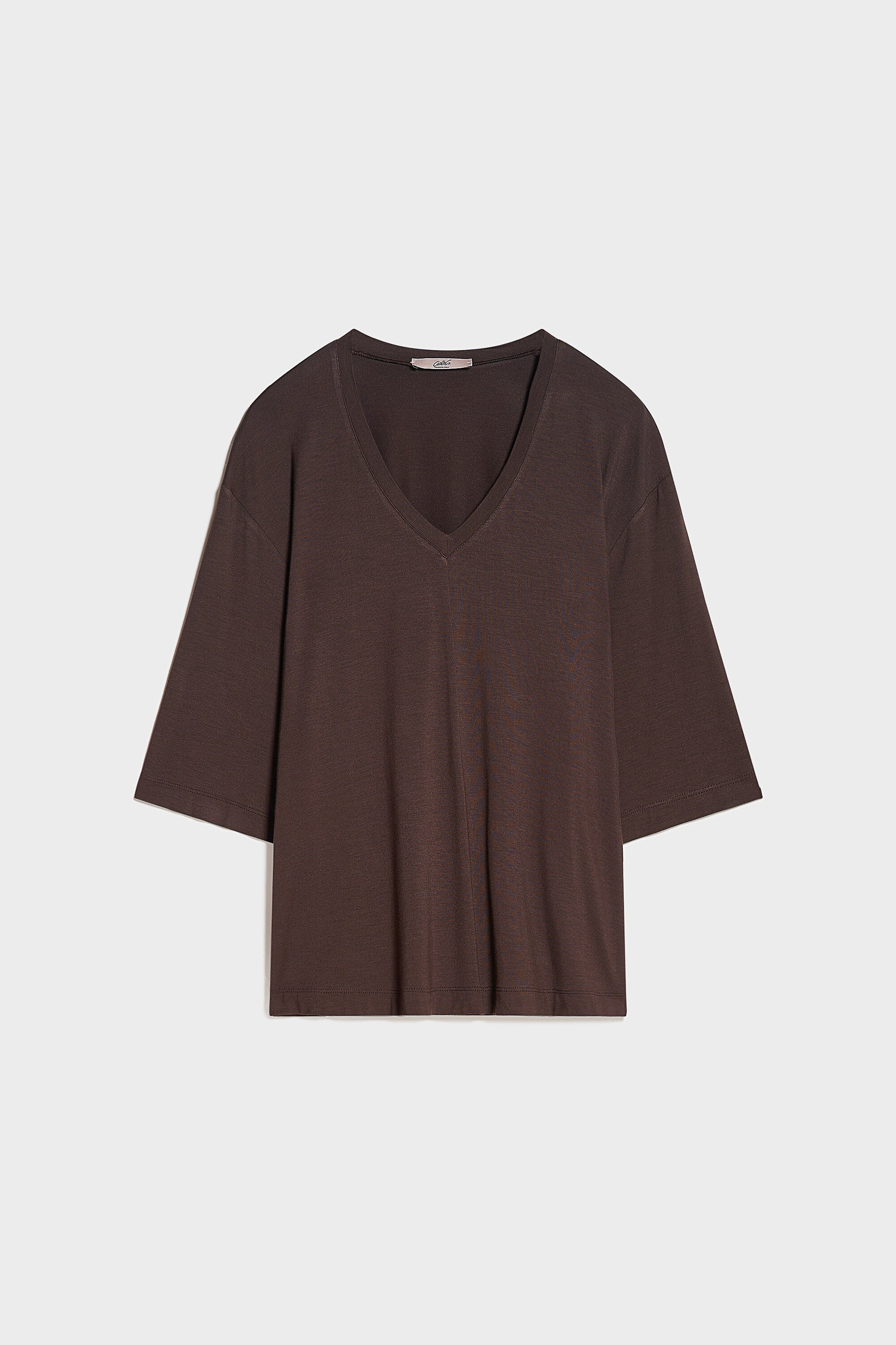 Maglia a mezze maniche in jersey di viscosa elasticizzata. Scollo a v, lunghezza sotto i fianchi.