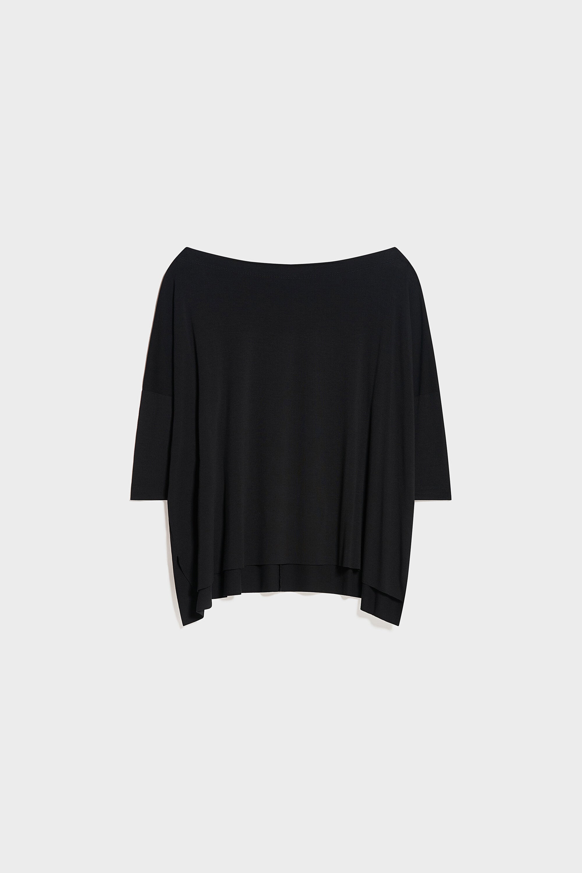 Maglia over con maniche a 3/4 in jersey di viscosa. Ampio scollo a barchetta. Fondo davanti più corto e spacchetti laterali. Lunghezza sotto i fianchi.