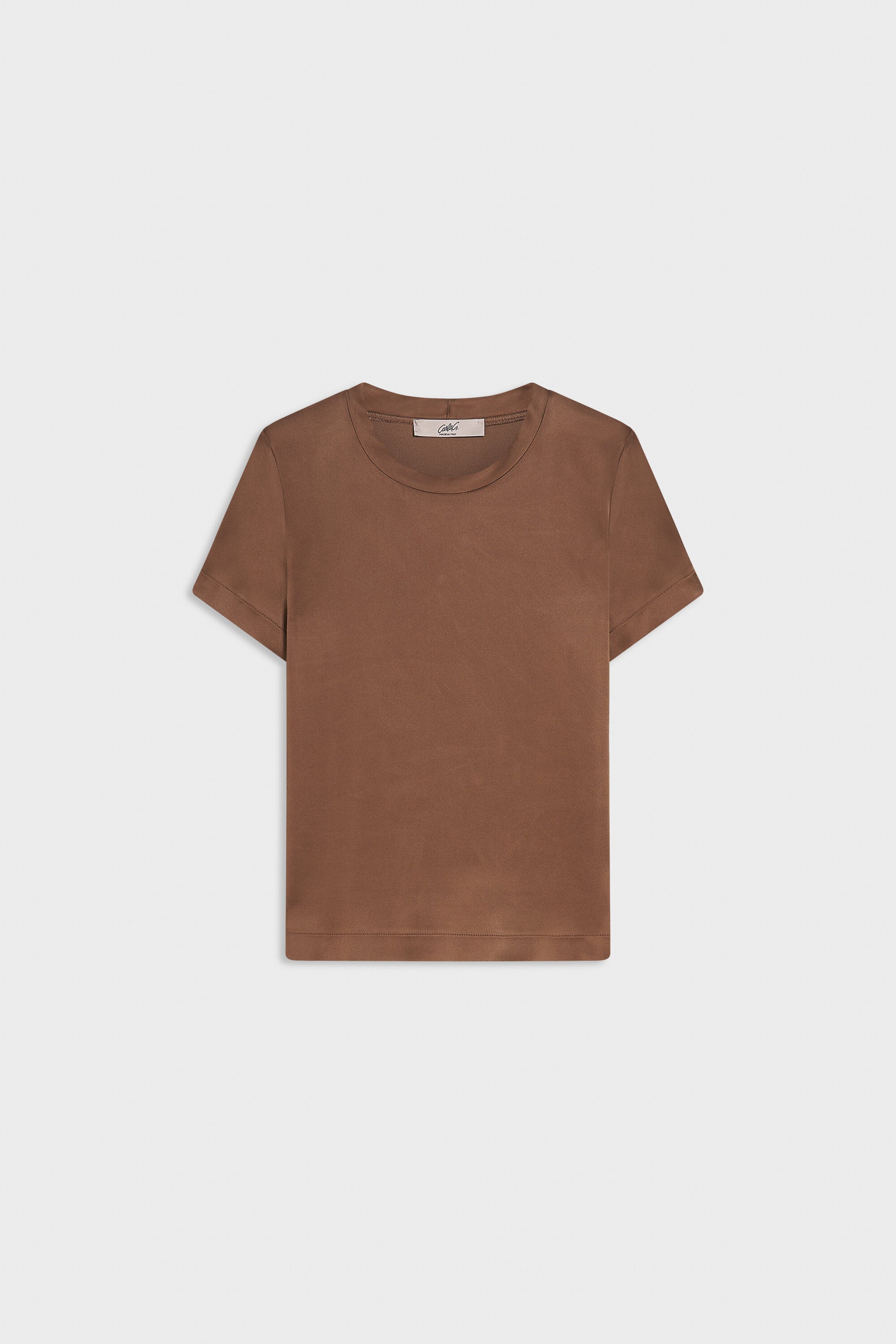 Maglia a mezze maniche in raso elasticizzato. Lunghezza ai fianchi.