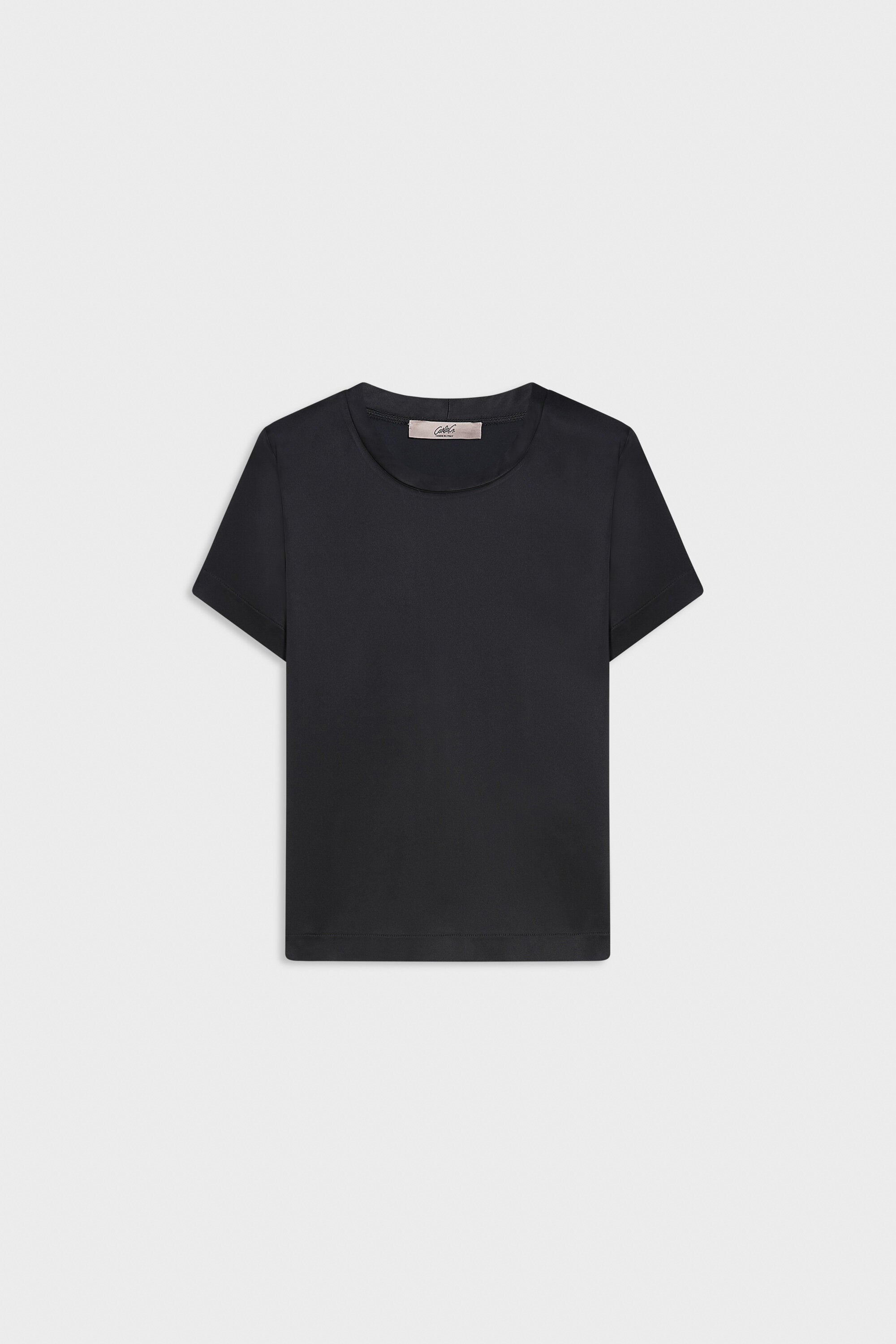 Maglia a mezze maniche in raso elasticizzato. Lunghezza ai fianchi.