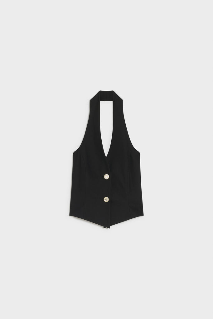 Gilet monopetto foderato in gabardina elasticizzata con scollo a v davanti ed elastico dietro. Ch...Learn more